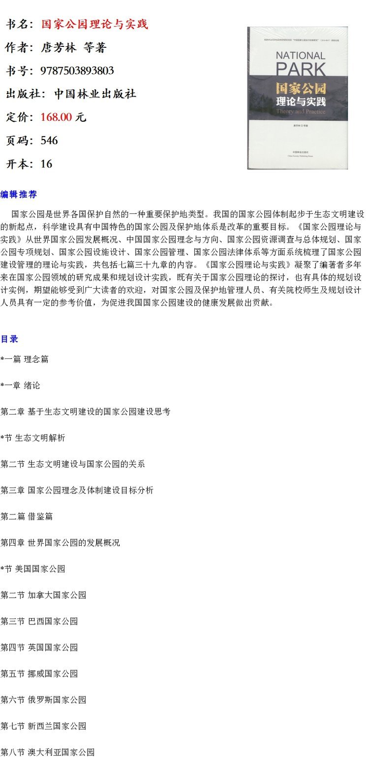 国家公园理论与实践 9380 唐芳林 等著 国家林业局林业软科学研究项目 理念借鉴探索规划设计管理保障 中国林业出版社 畅销书