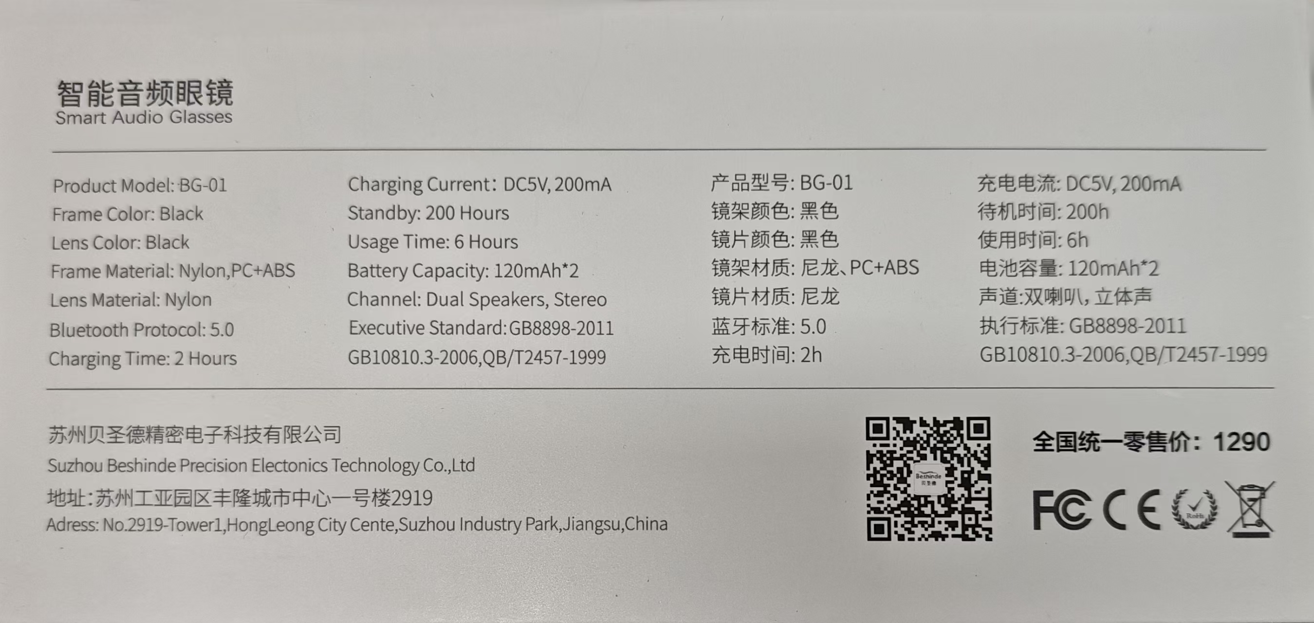 与JBL 音悦范 智能眼镜同厂代工,但音质比JBL更好,功率也更大,用于打电话时双方通话声音非常清晰,上市时参考JBL 音悦范的定价,同样为1290元。