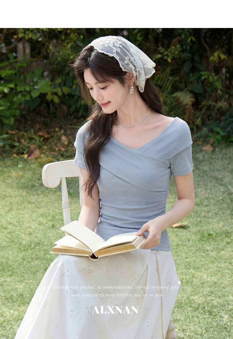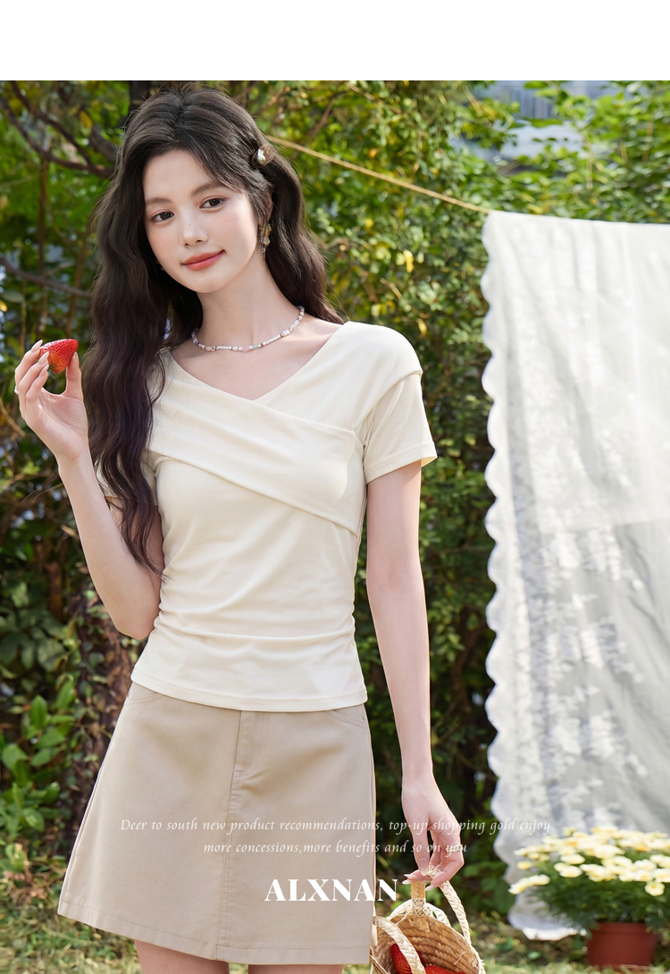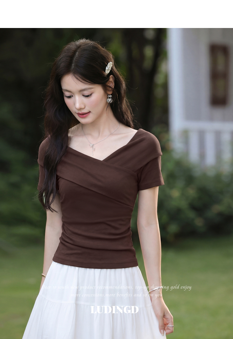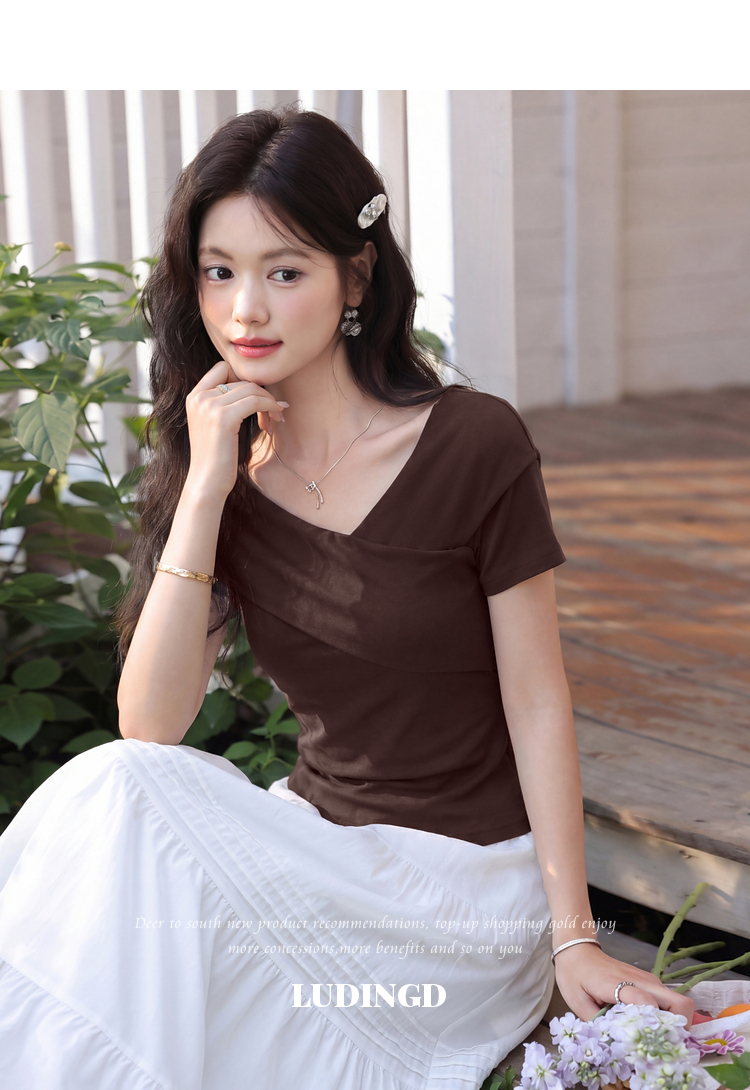 鹿向南「玫瑰诗篇」气质独特枣红色T恤女夏新款流行修身短袖上衣