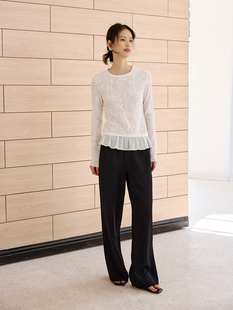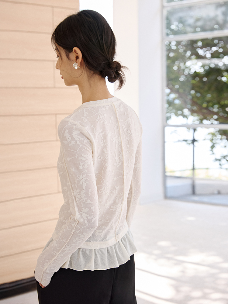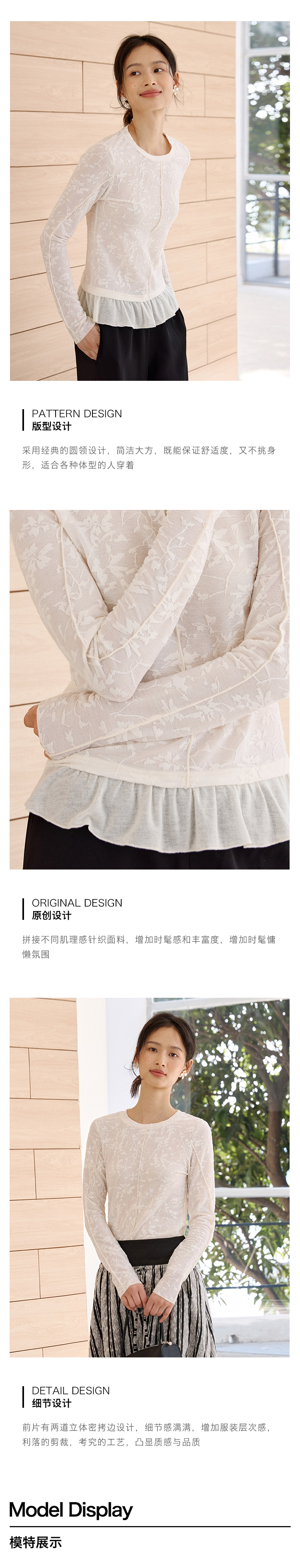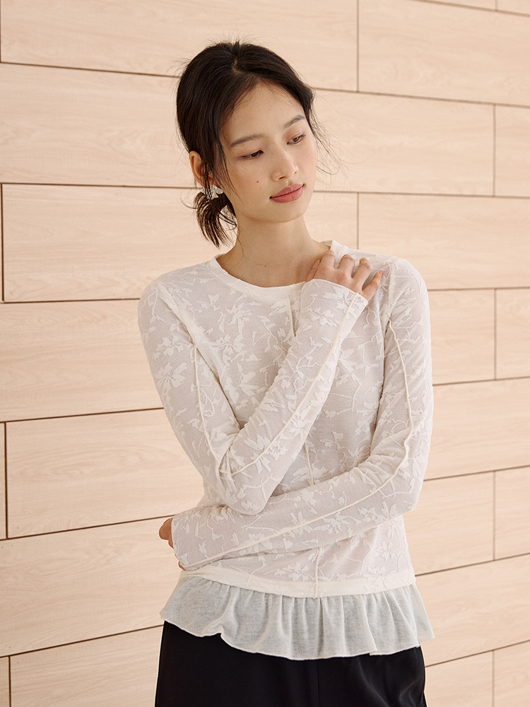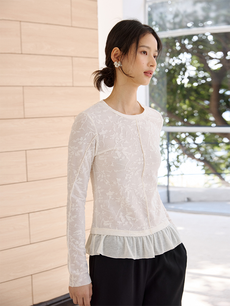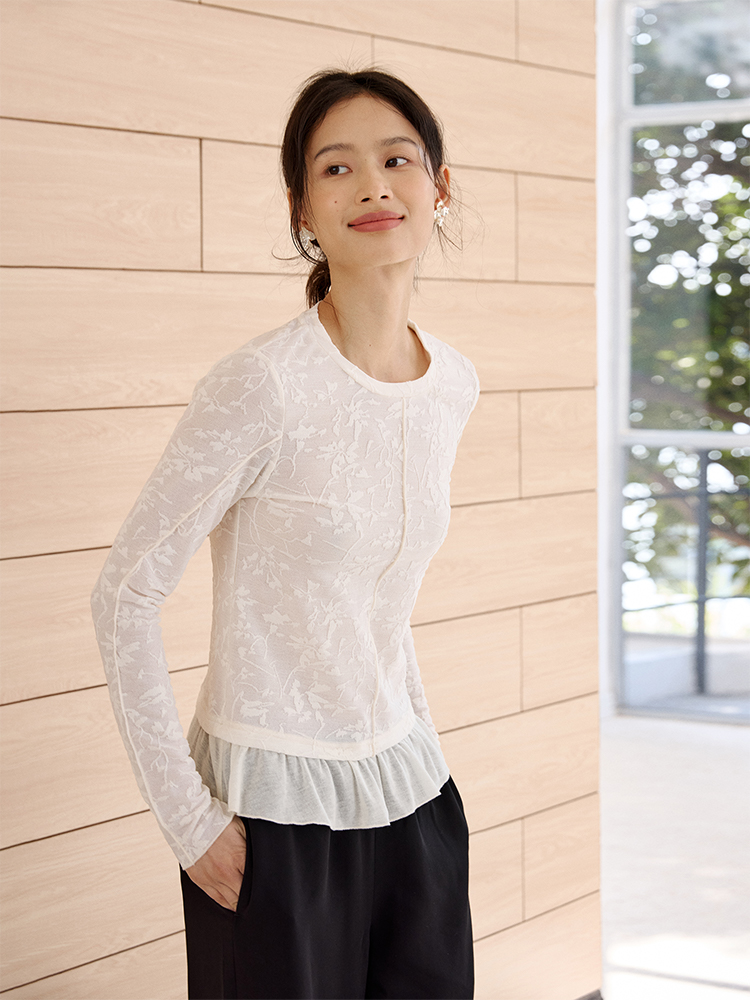 ForPoem 现货 25/SS原创设计微透花朵肌理荷叶边下摆修身肌理打底衫