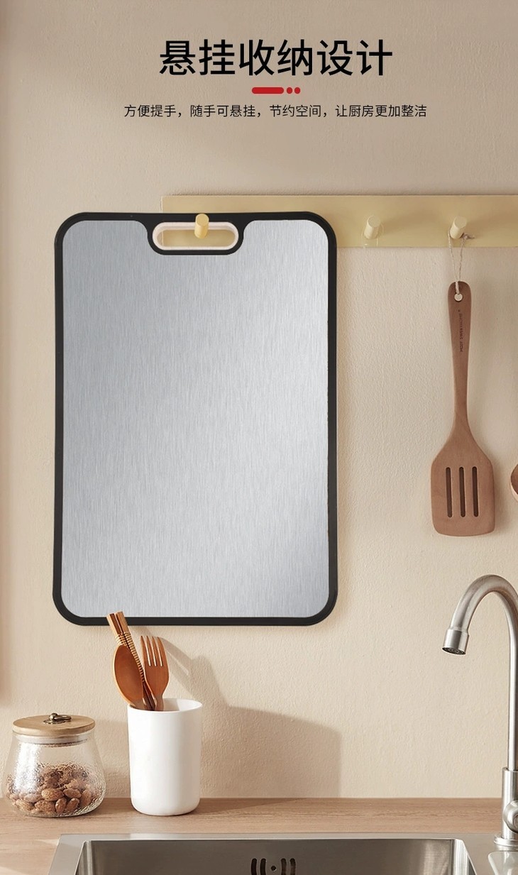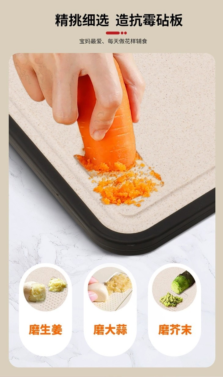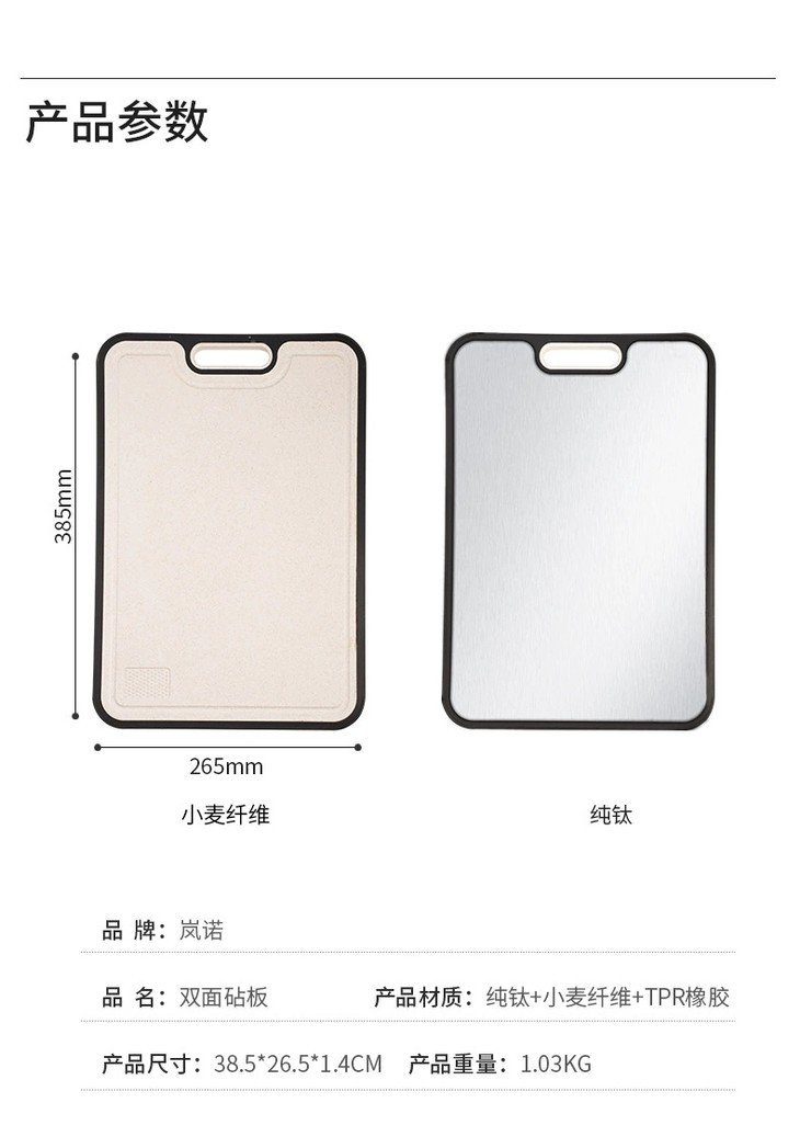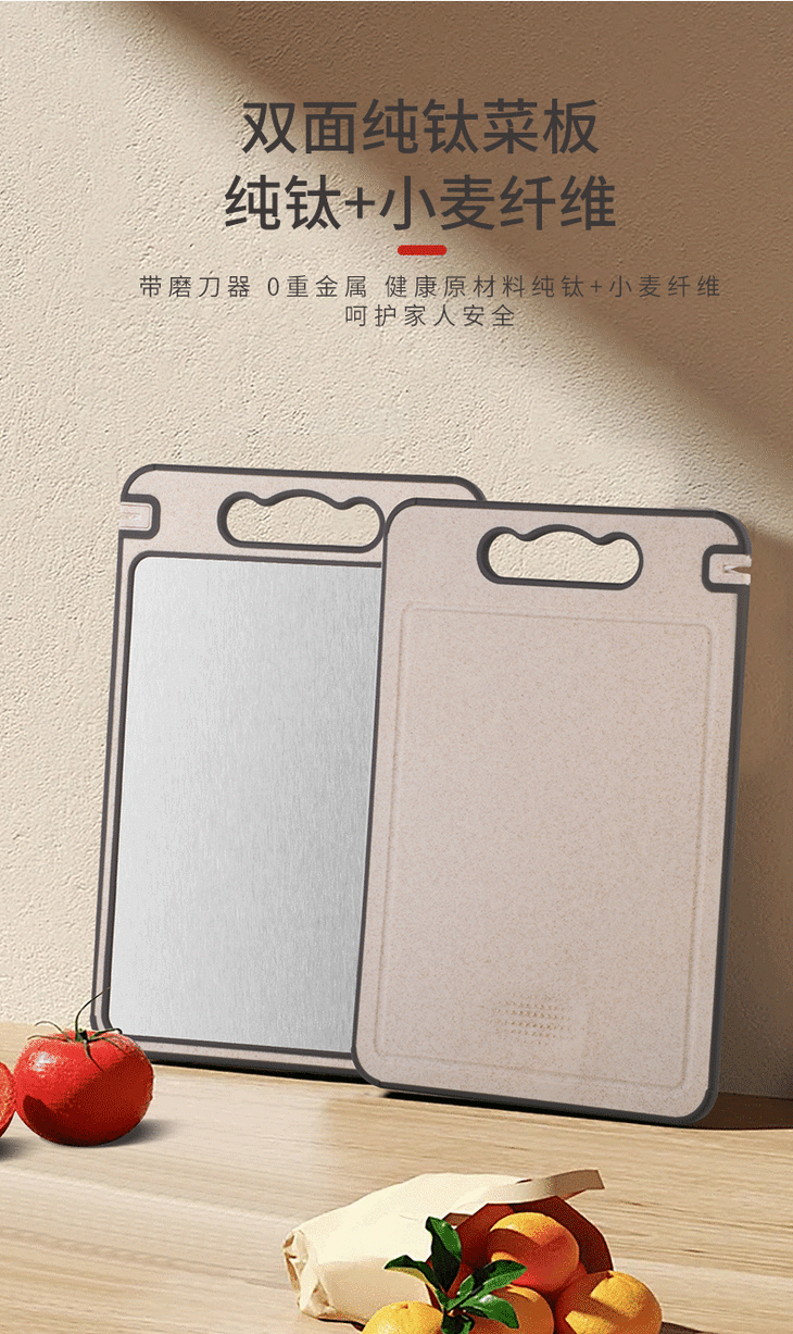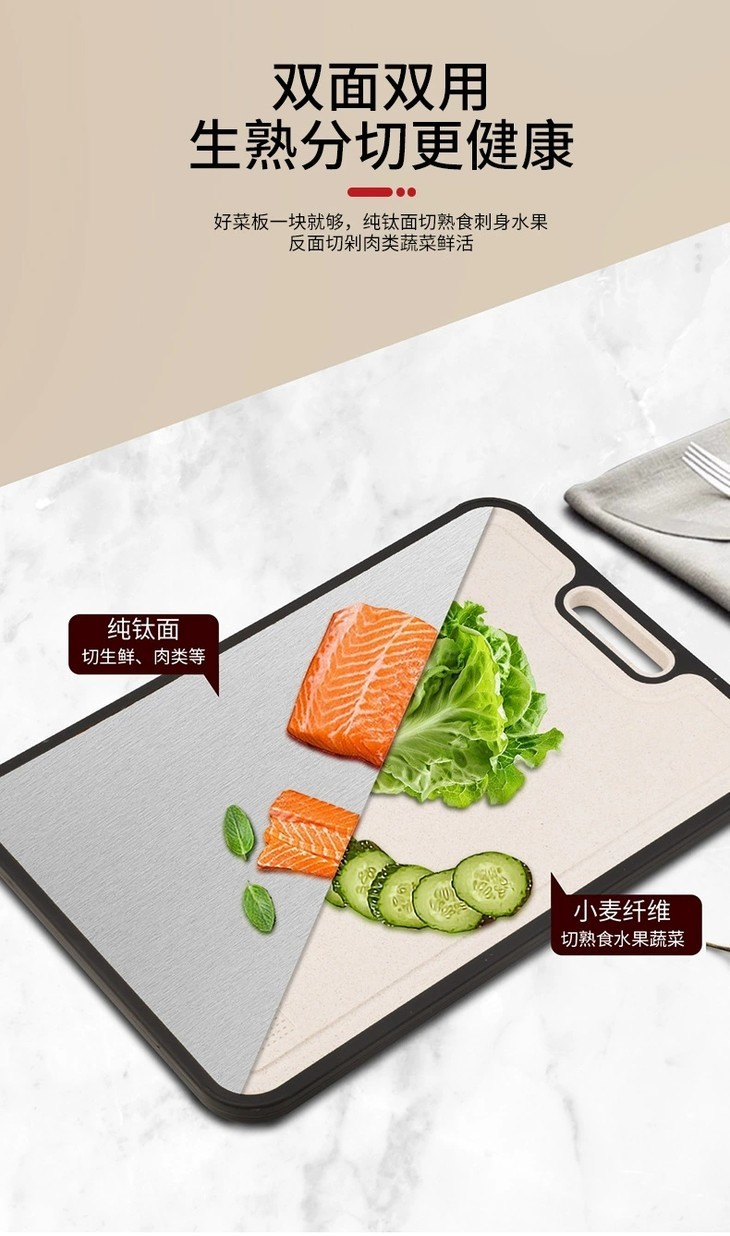 ✅ 双面“独立作战”:覆钛的金属面适合切生鲜,小麦纤维面适合剁熟食。串味?不存在的!