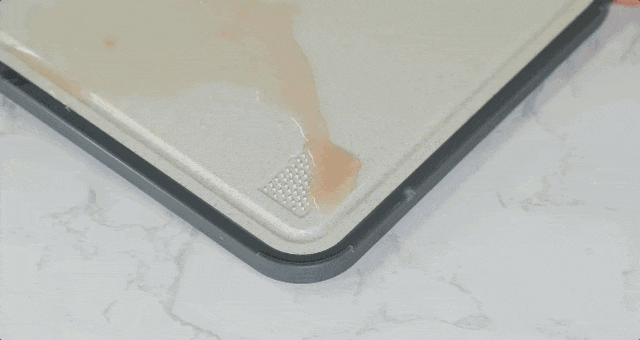 看这圈加宽硅胶包边,在沾油沾水的台面用力地砍肋排骨头时,菜板却像吸盘一般,纹丝不动。