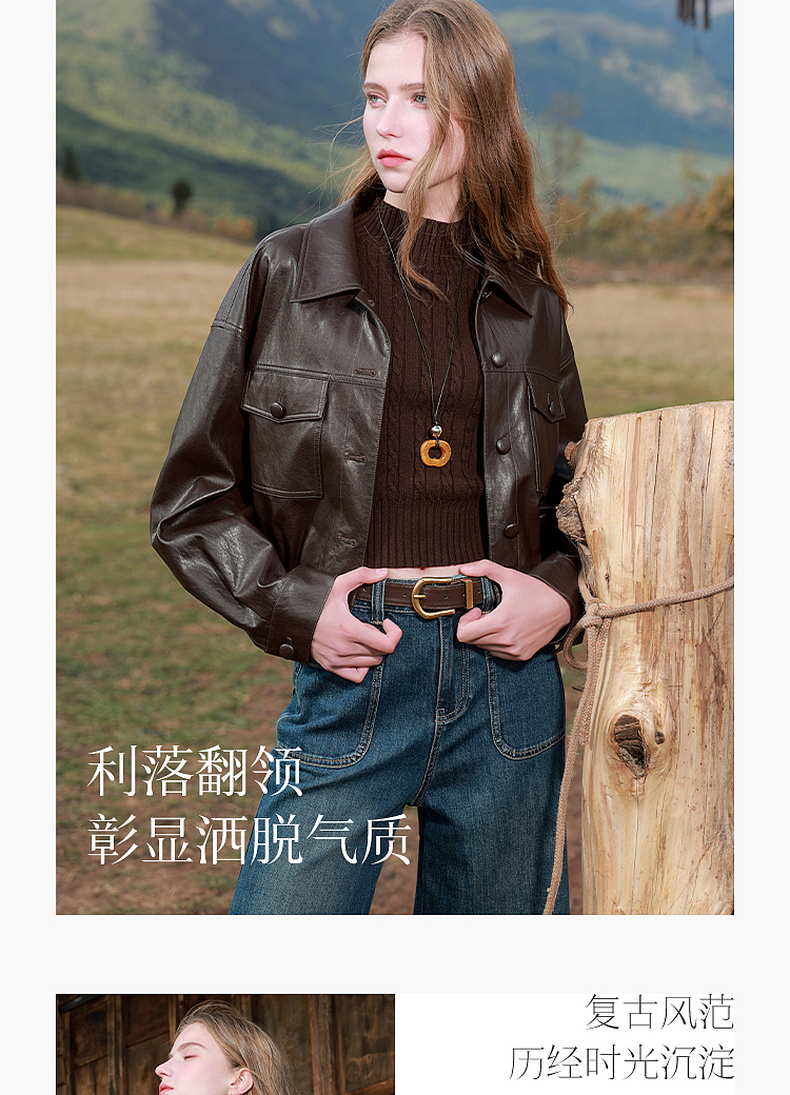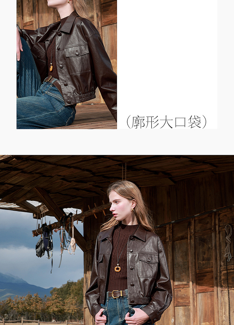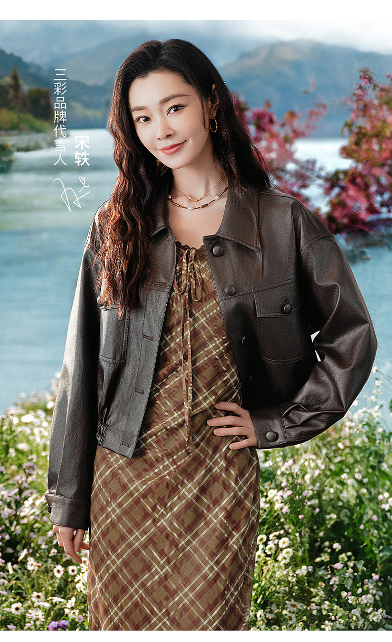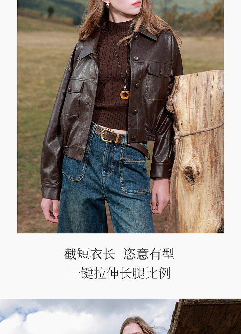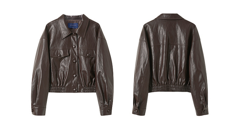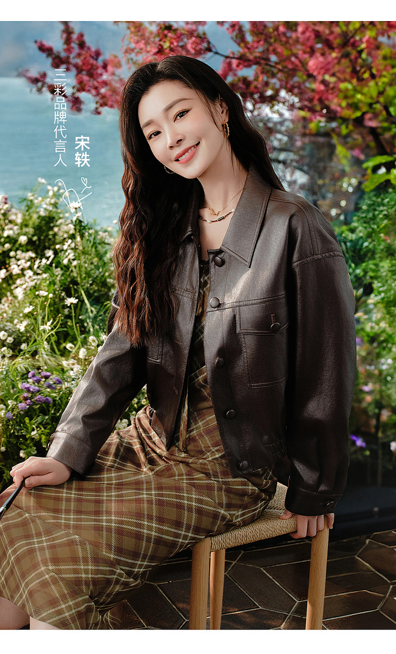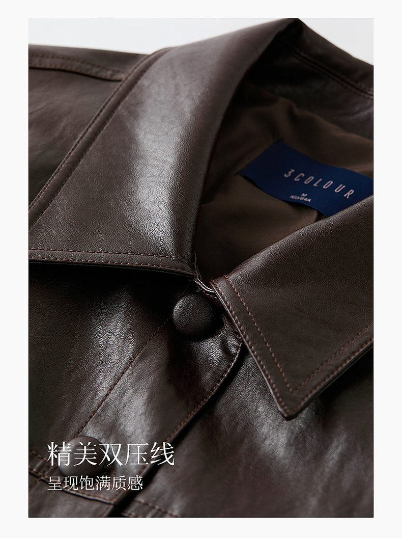 三彩2026春季新款PU皮衣外套翻领宽松落肩袖上衣开衫皮夹克M
