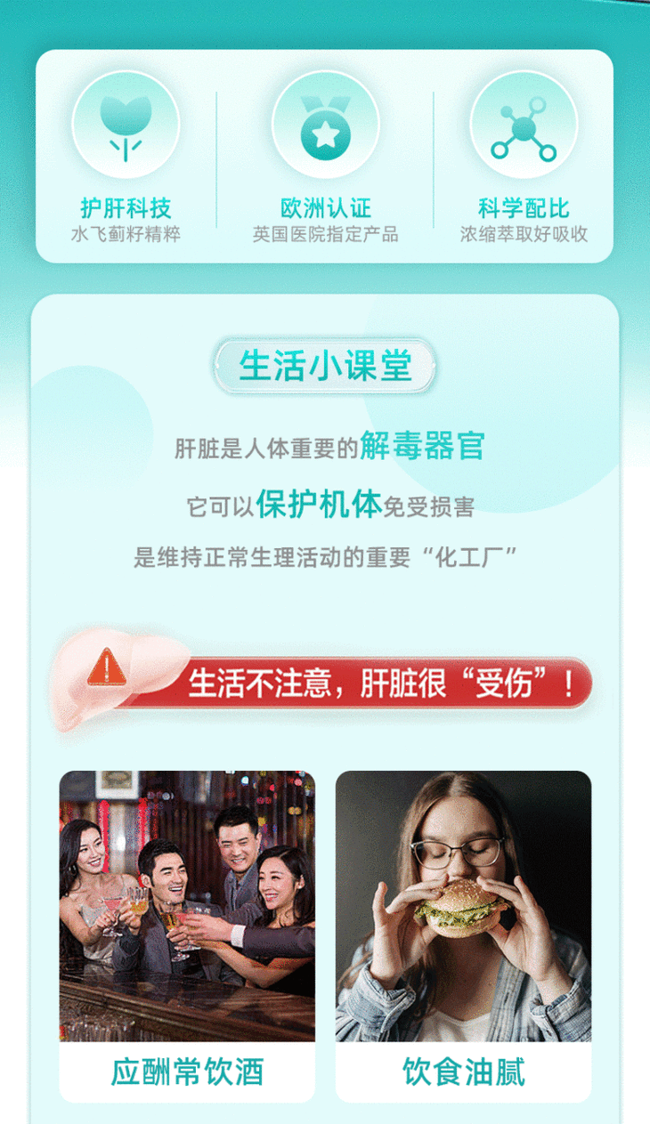 1.核心成分水飞蓟,对熬夜应酬人群,每粒含有约1085mg水飞蓟籽,一次一粒即可满足日常所需,加速排毒,缓解熬夜,喝酒后带来的身体危害,排解人体血液胆固醇含量
