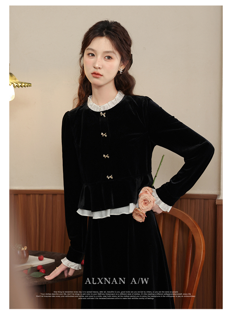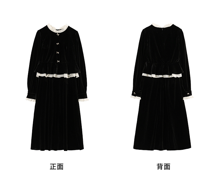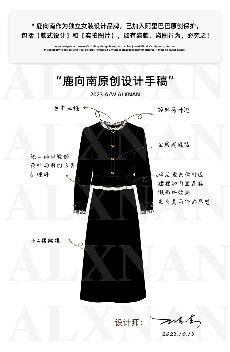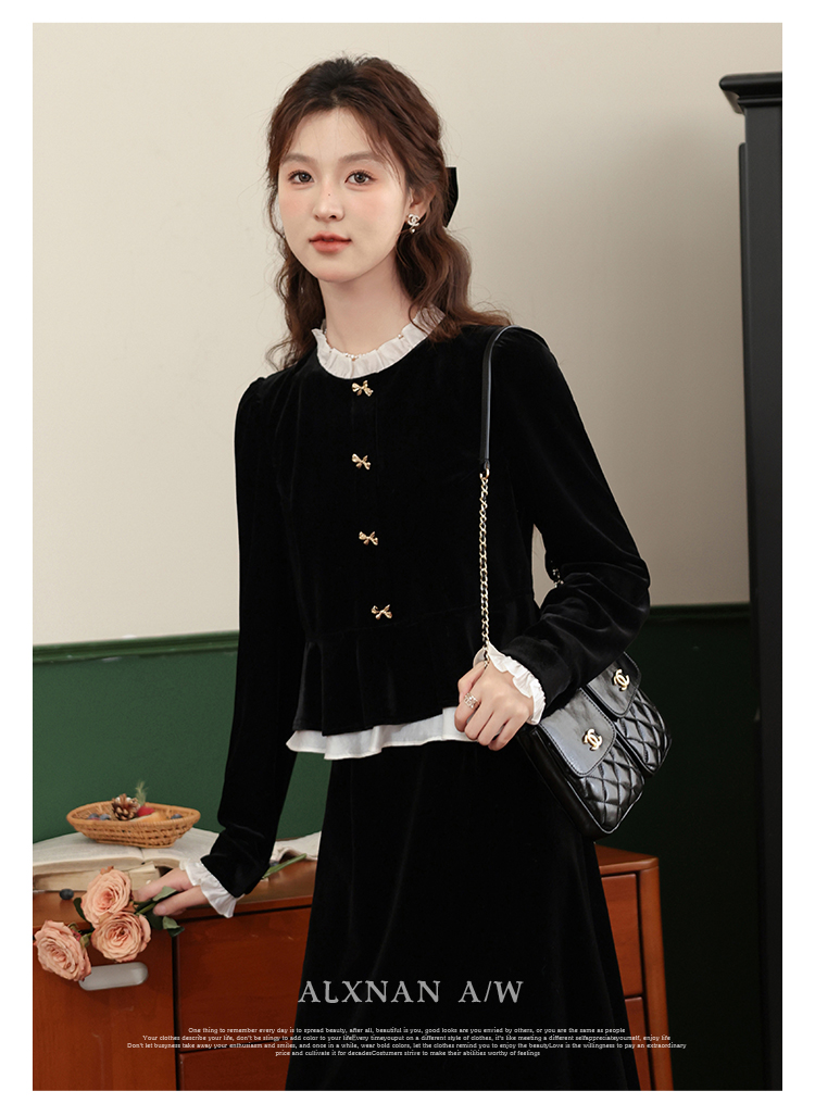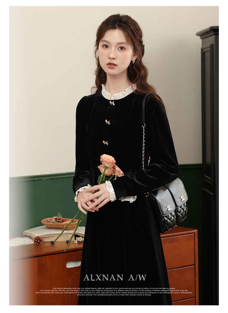 鹿向南「怦然心动」黑色假两件千金感中长裙秋季新款花领连衣裙女