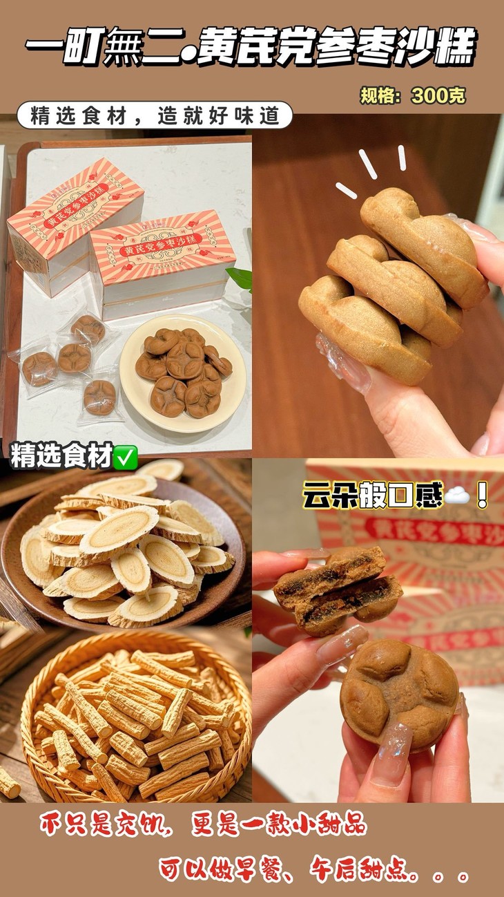 这款沙糕可是满满的养生能量 黄芪补气固表,党参养血生津,红枣补中益气,全是养生好物 工作忙碌顾不上吃饭时,随手来一块,既能饱腹又能滋补老人小孩也能吃,当作日常小点心再合适不过 无论是当早餐开启活力满满的一天 还是下午茶解馋,它都是绝佳选择