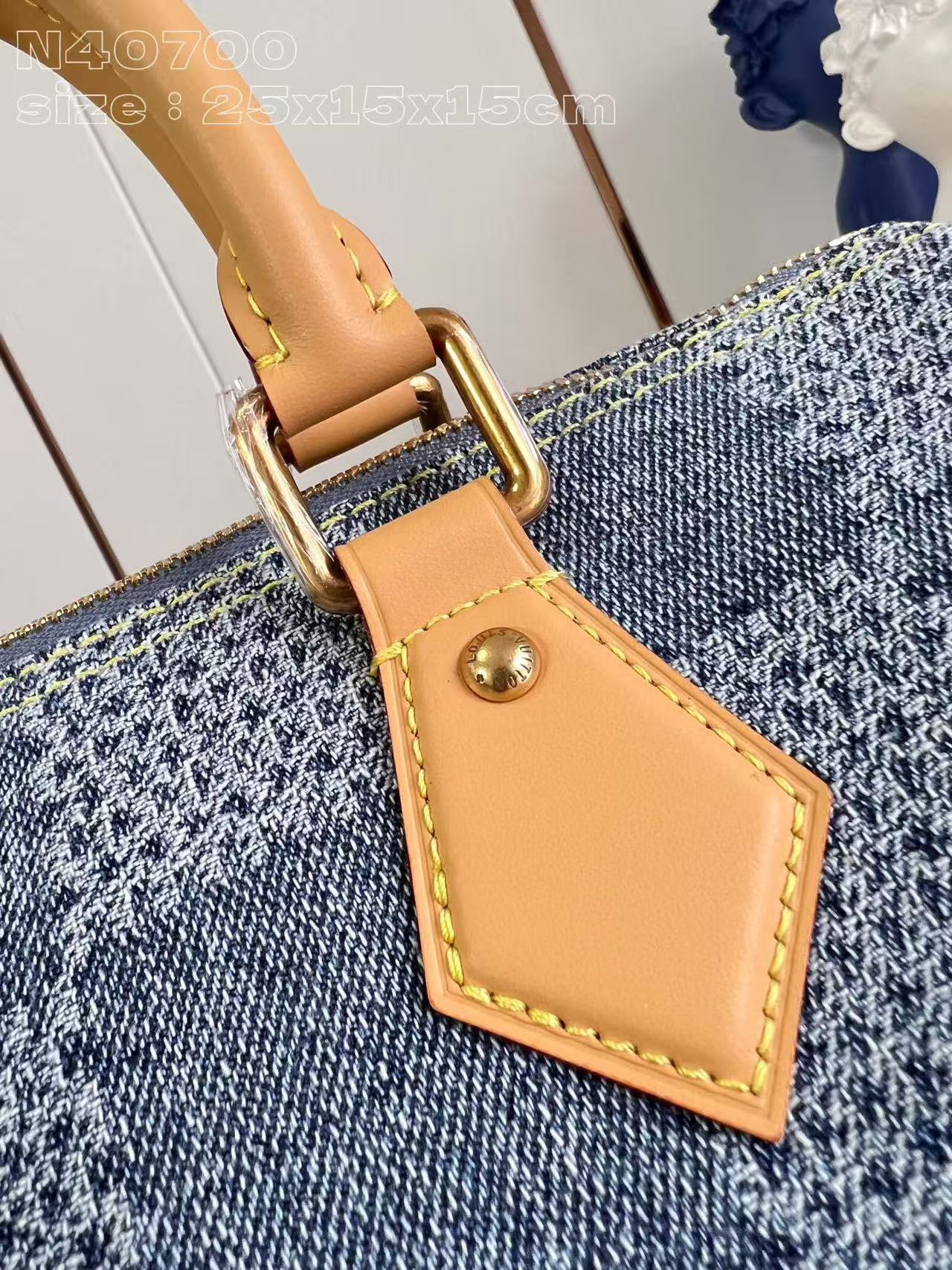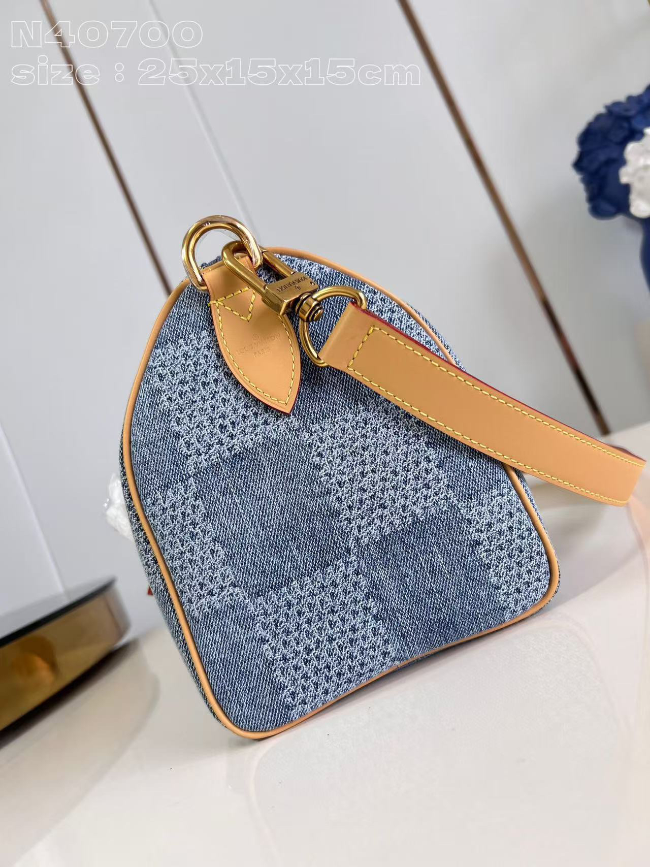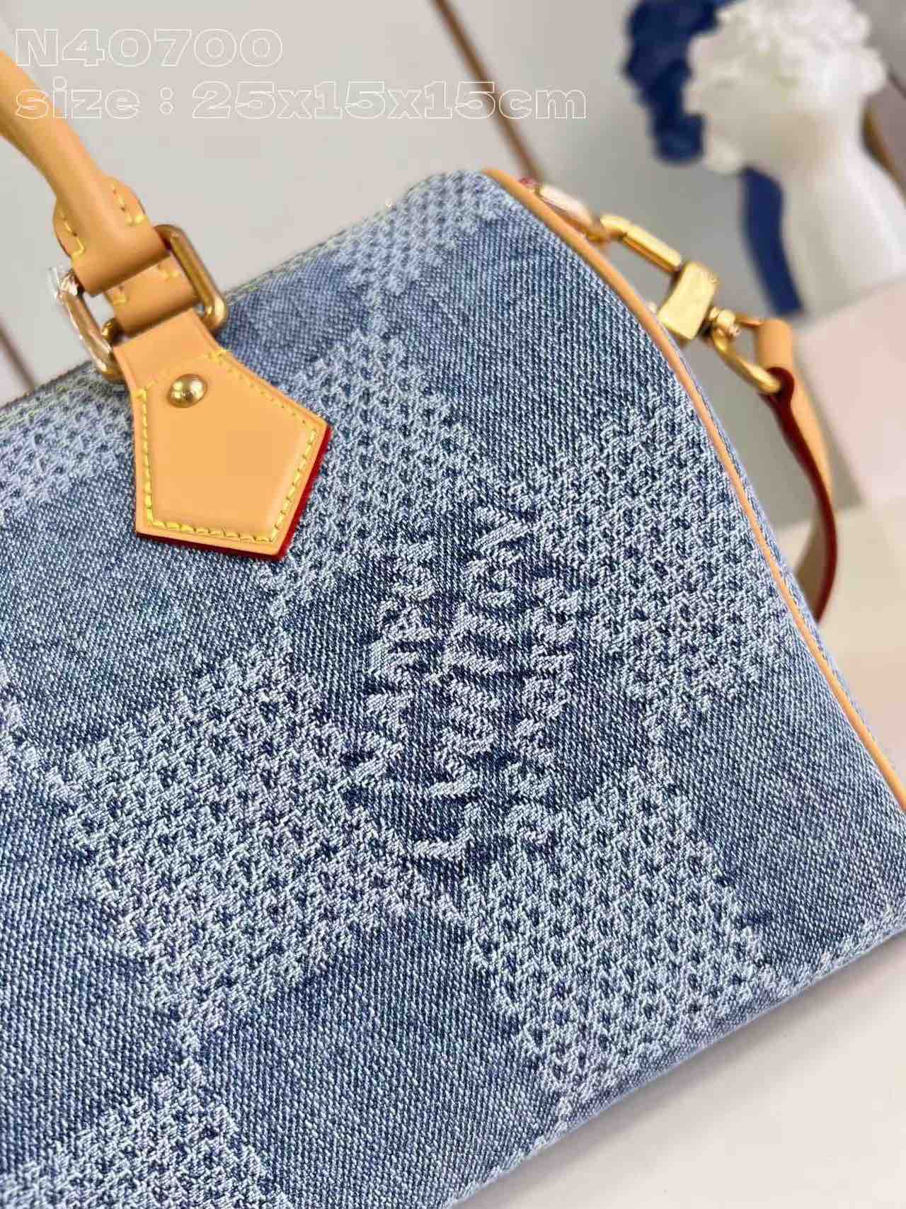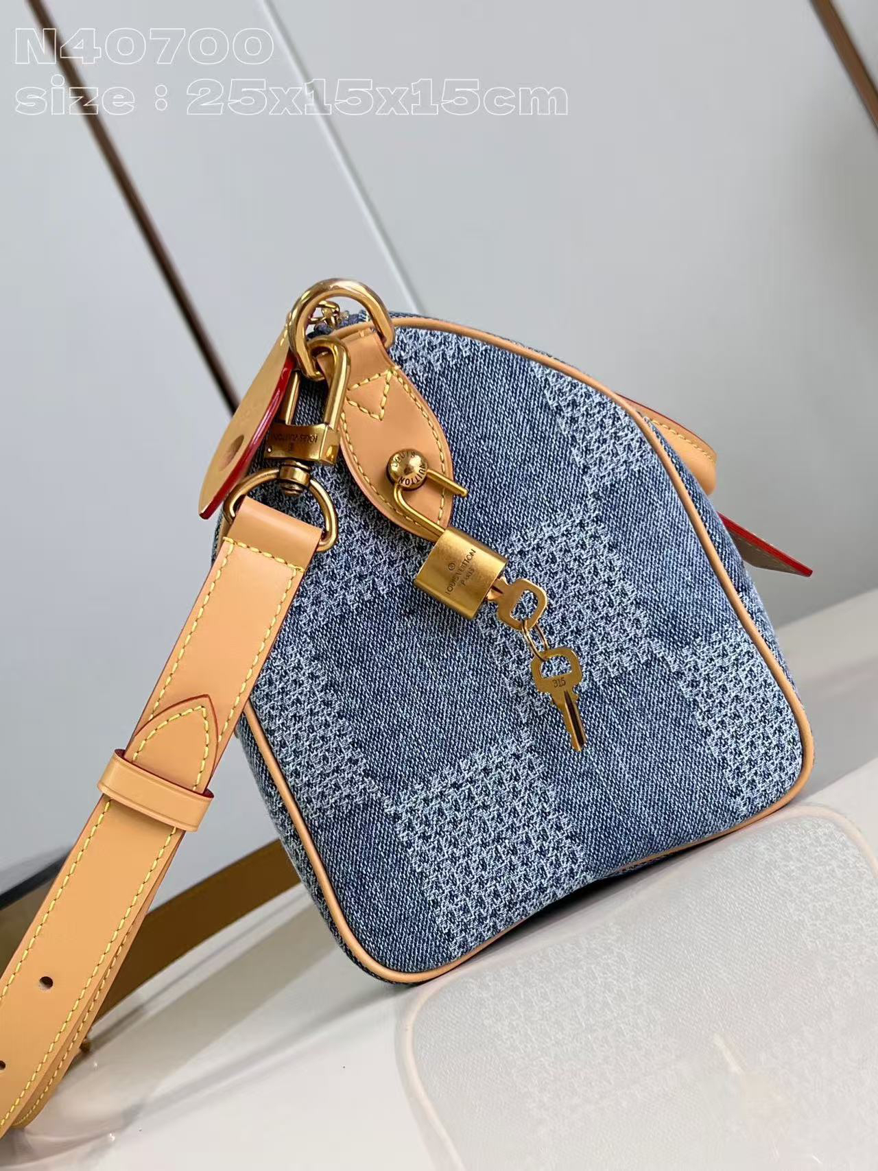 Pharrell Williams 以 Damier Denim 3D 棉质帆布打造此款Speedy 25 Bandoullere手袋。面料经裁剪、漂白和染色后呈现褪色效果,为经典格纹注入夏日气息。水洗处理使材料轻微收缩,令格纹图案浮现立体肌理。尺寸:25 × 15 × 15 cm