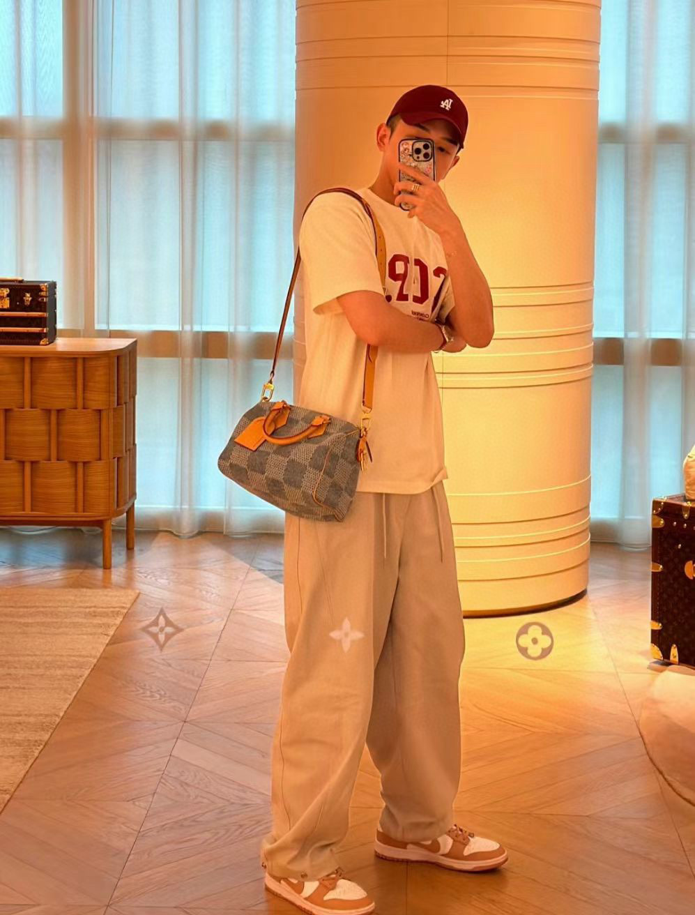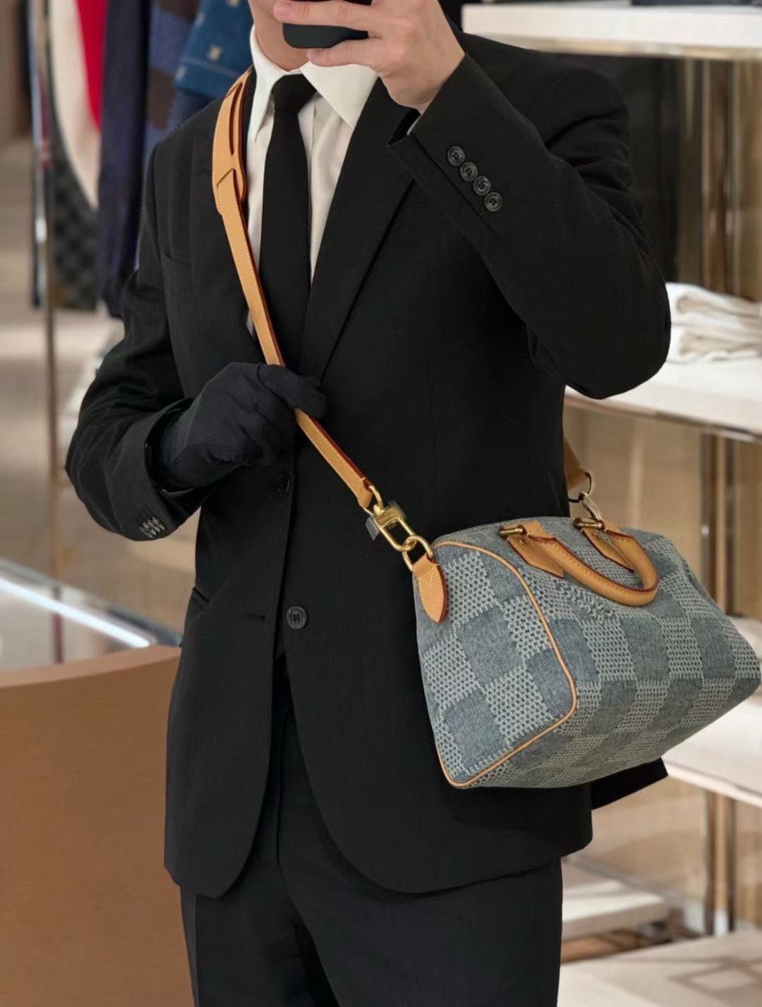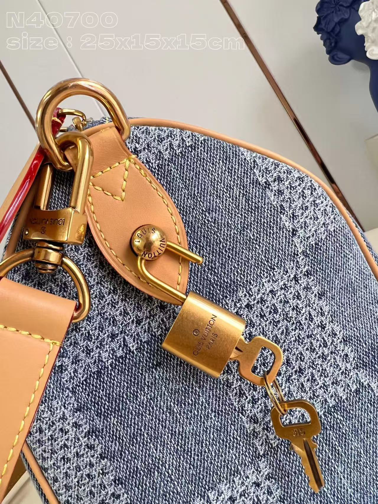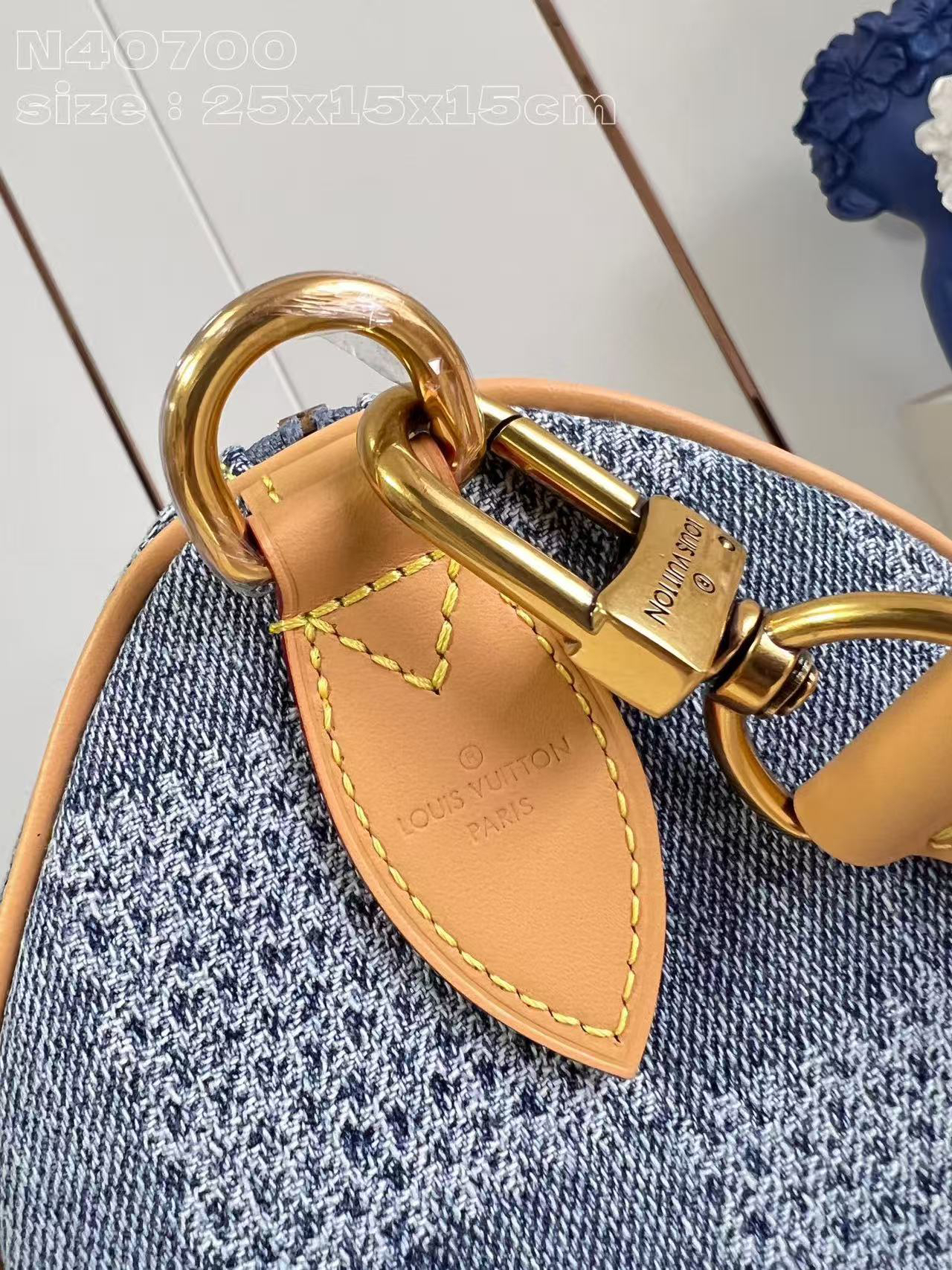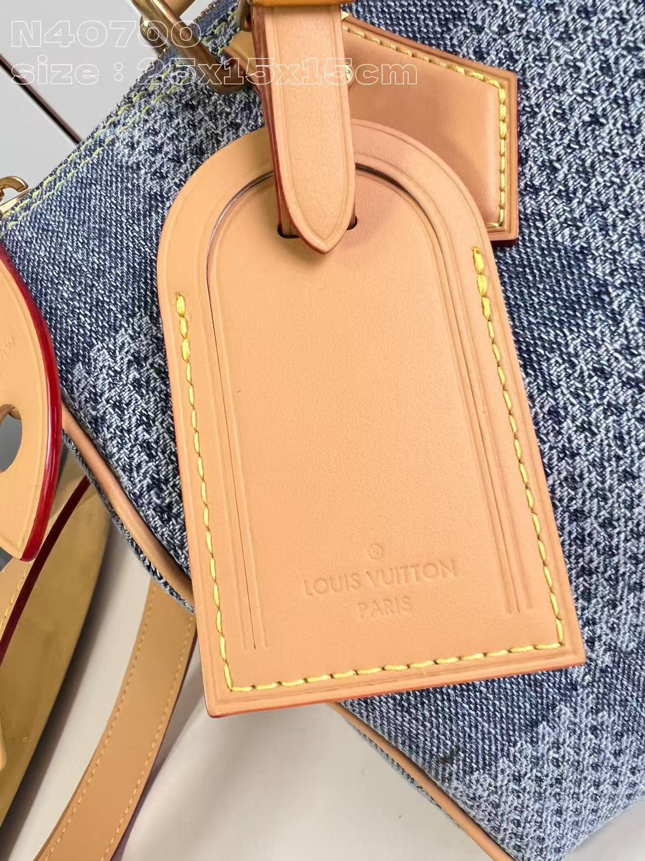 Pharrell Williams 以 Damier Denim 3D 棉质帆布打造此款Speedy 25 Bandoullere手袋。面料经裁剪、漂白和染色后呈现褪色效果,为经典格纹注入夏日气息。水洗处理使材料轻微收缩,令格纹图案浮现立体肌理。尺寸:25 × 15 × 15 cm
