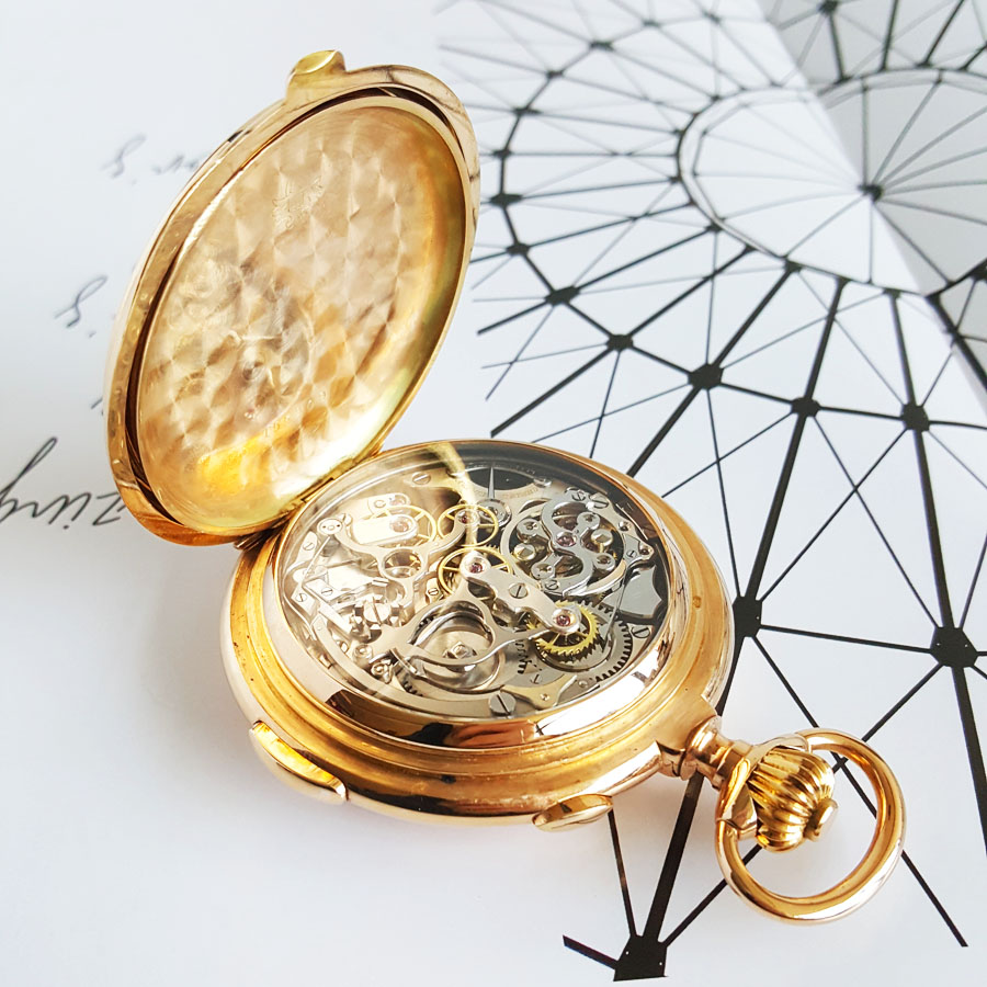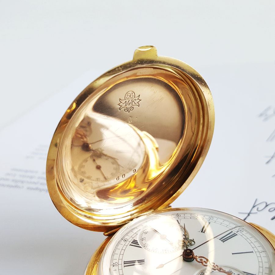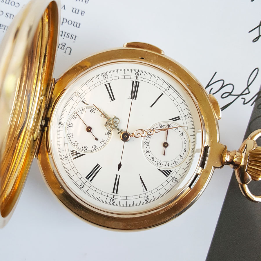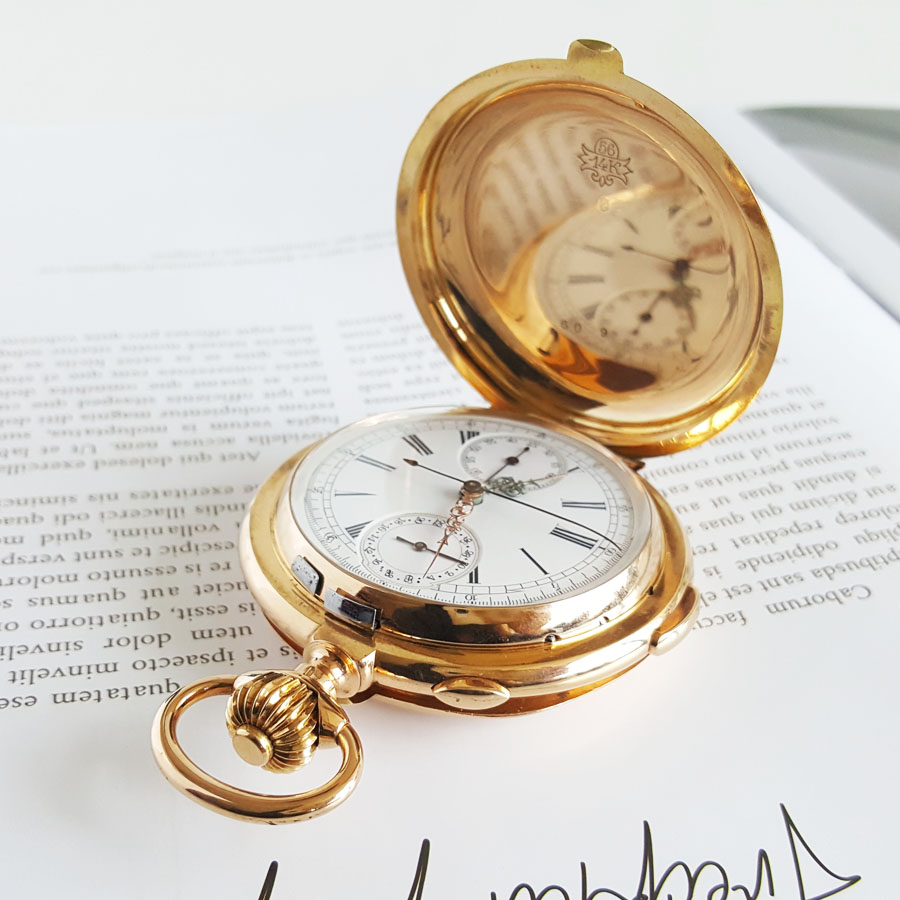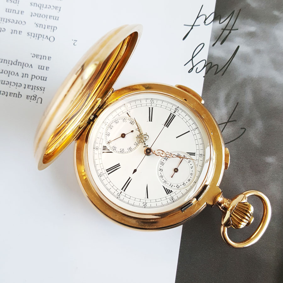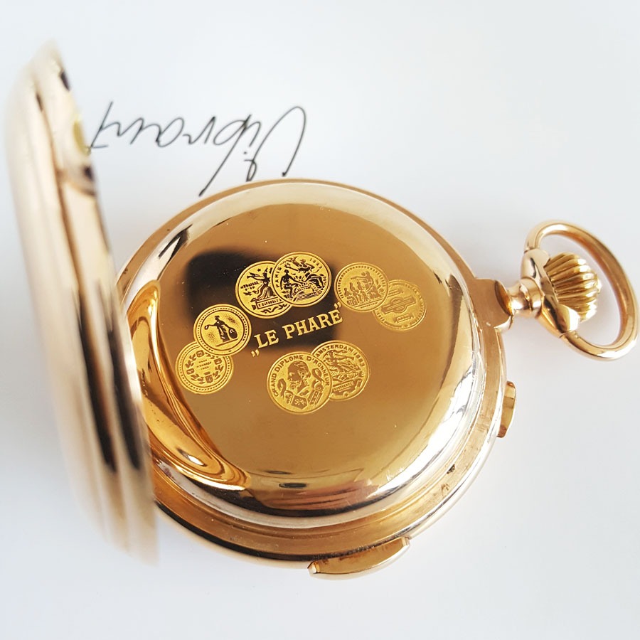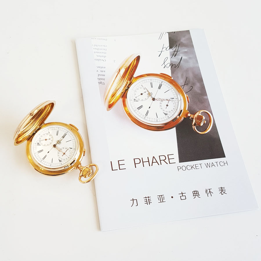 特别说明 | 怀表品牌LE PHARE,中文名为力菲亚,瑞士知名品牌珍达菲的前身,该品牌由天才独立制表师创立于1888年,其多次在国际博览会上获得最高奖项,且一度成为瑞士生产计时手表的第二大品牌。此款怀表约产于20世纪初,表壳为14K金,此怀表少有的集计时与问表于一体,特有按钮式二问,按下的瞬间,即可享受清脆悦耳的报时声 |
