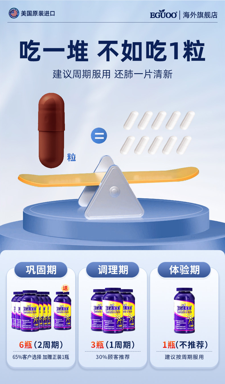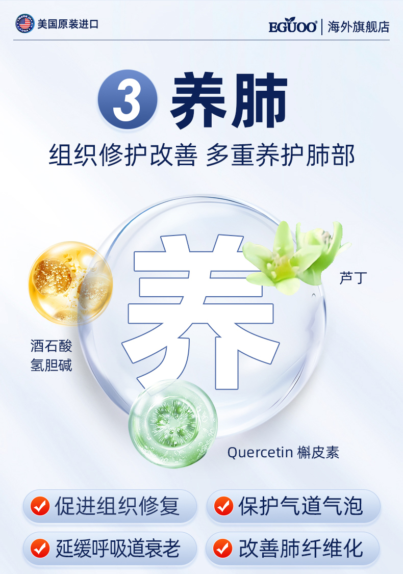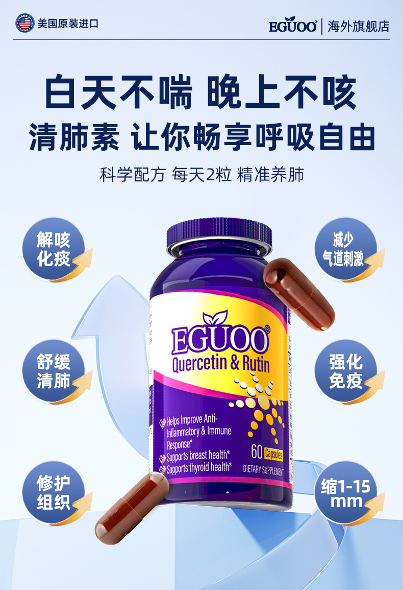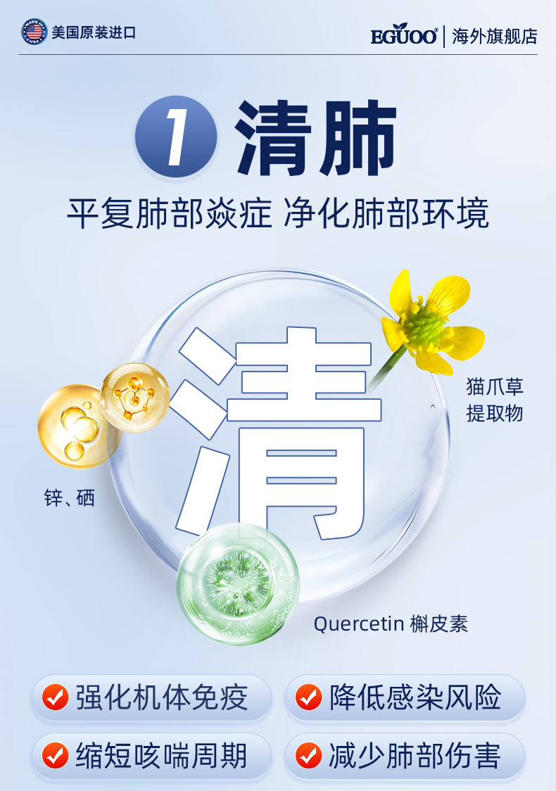 EGUOO清肺素美国原装进口槲皮素养肝护肺片双重保护代谢清肺慢阻