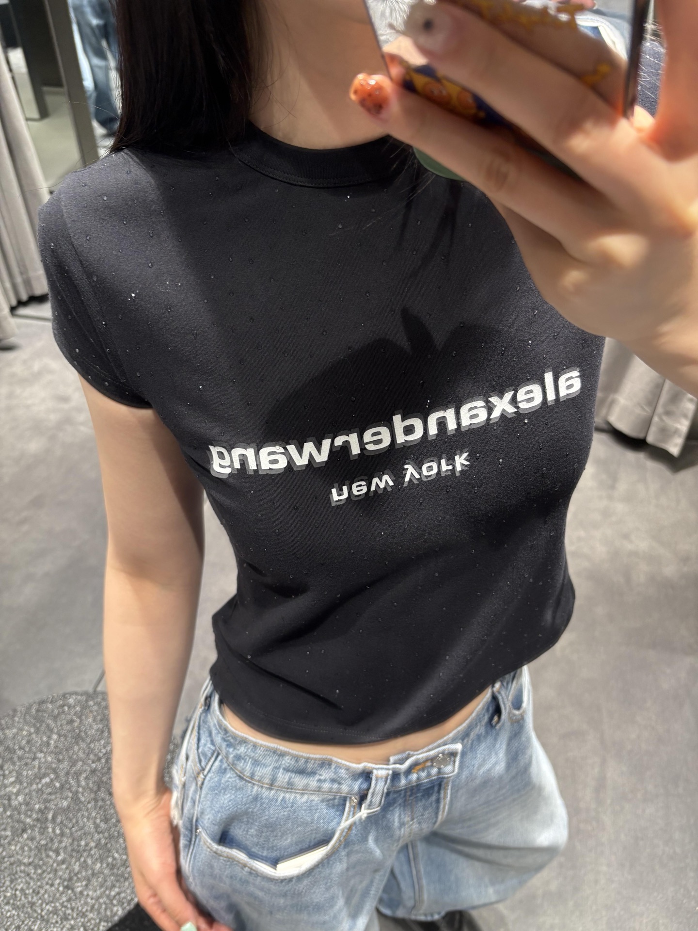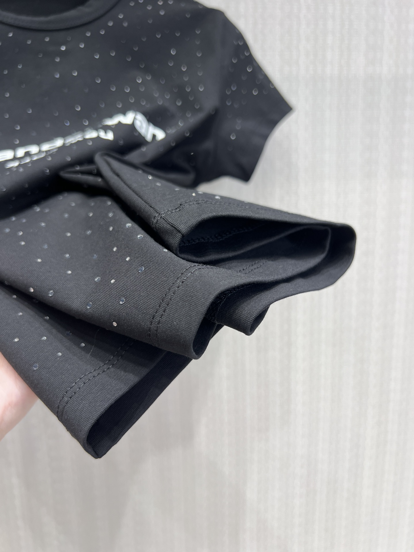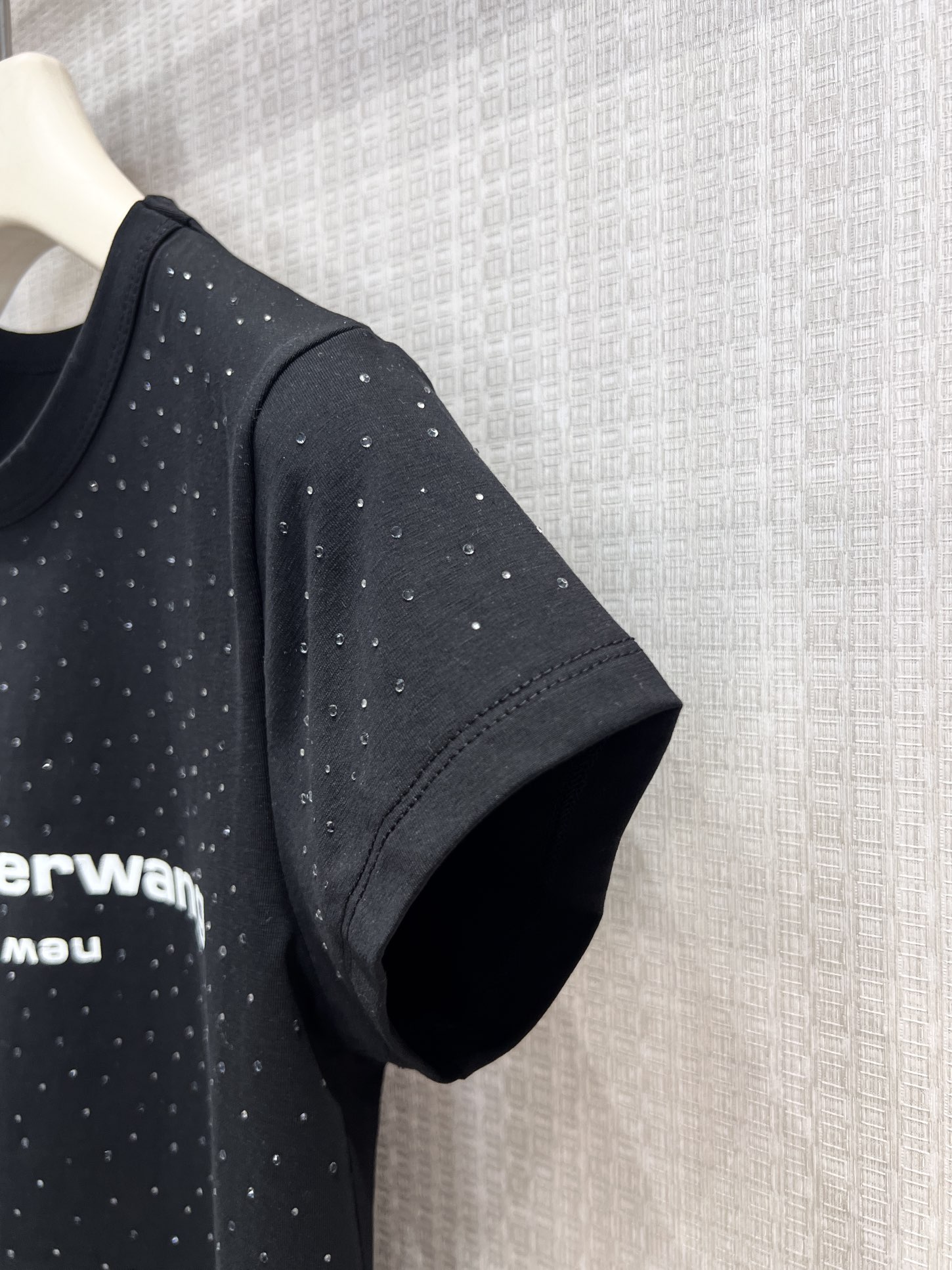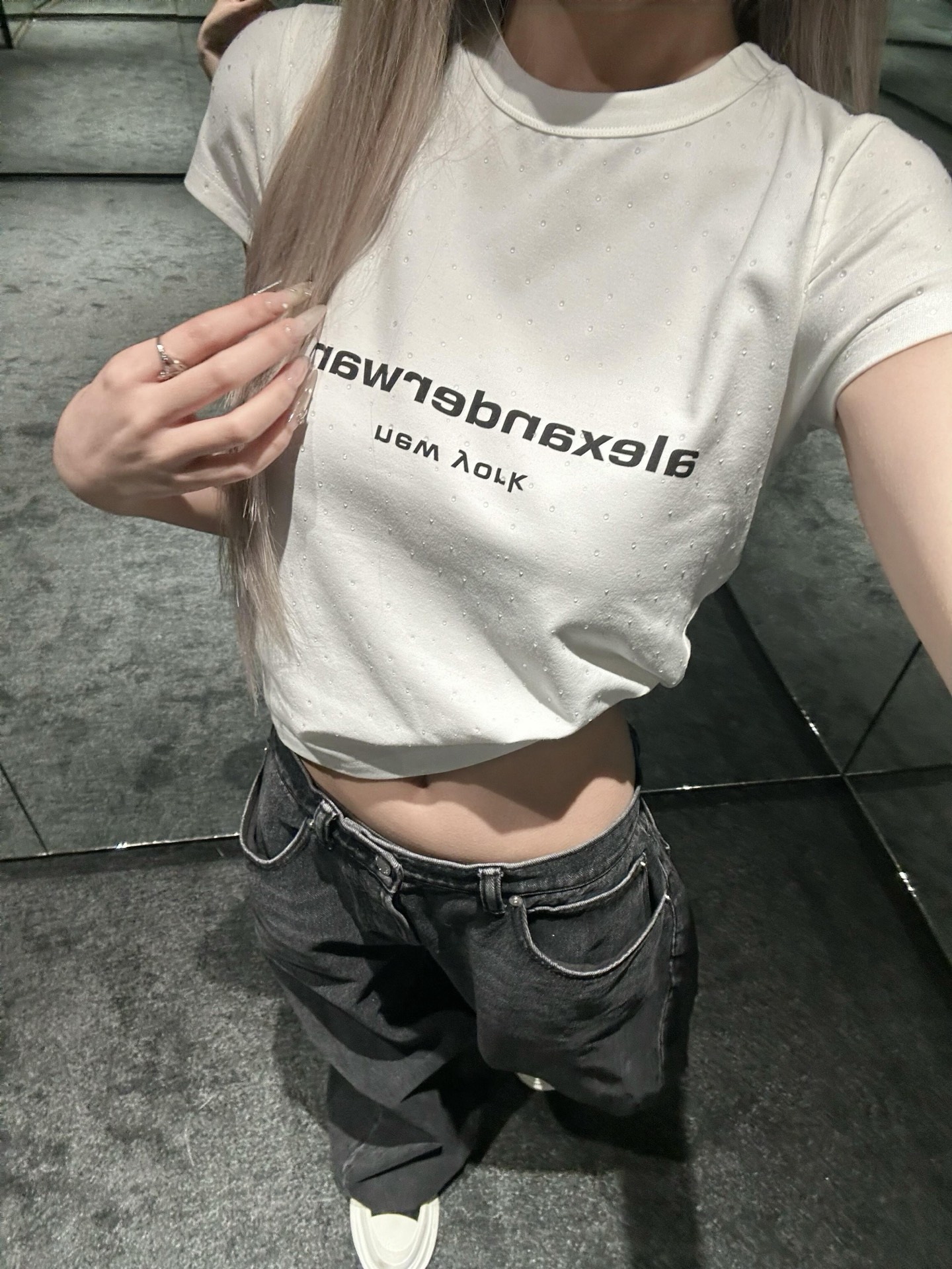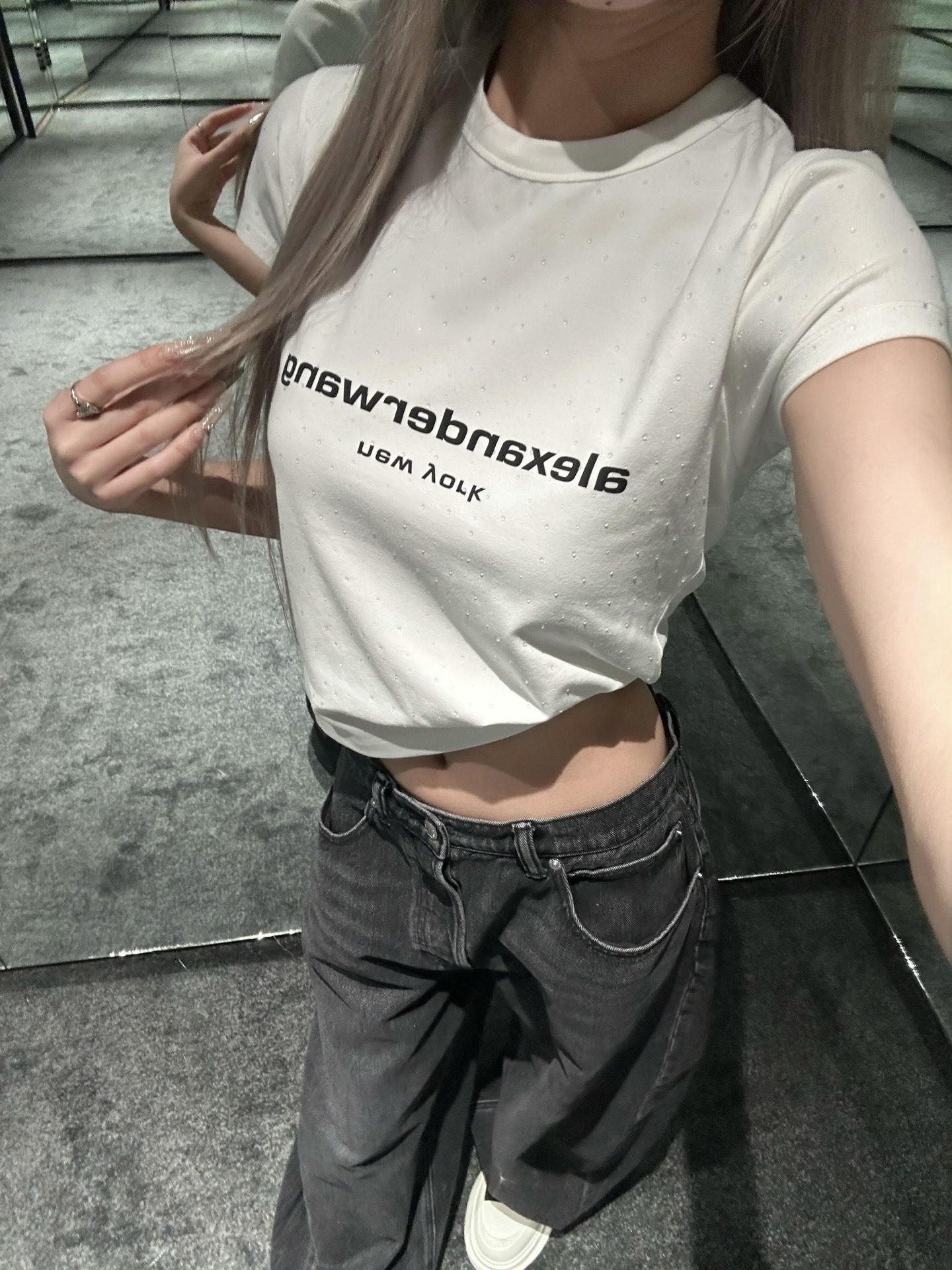 Aw* 26SS春夏新款 字母印花满水晶烫钻修身短袖圆领T恤丨⚠独家yb开发!顶级高版出品!高弹亲肤的棉质混纺面料,软糯透气且贴合身形,修身微短版型,对身材包容度高,小圆领+修身短款剪裁,精准勾勒腰线,轻松打造露腰辣妹风。既能凸显曲线又不会过于紧绷,适配各种身材的辣妹穿搭。现货发售S/M/L