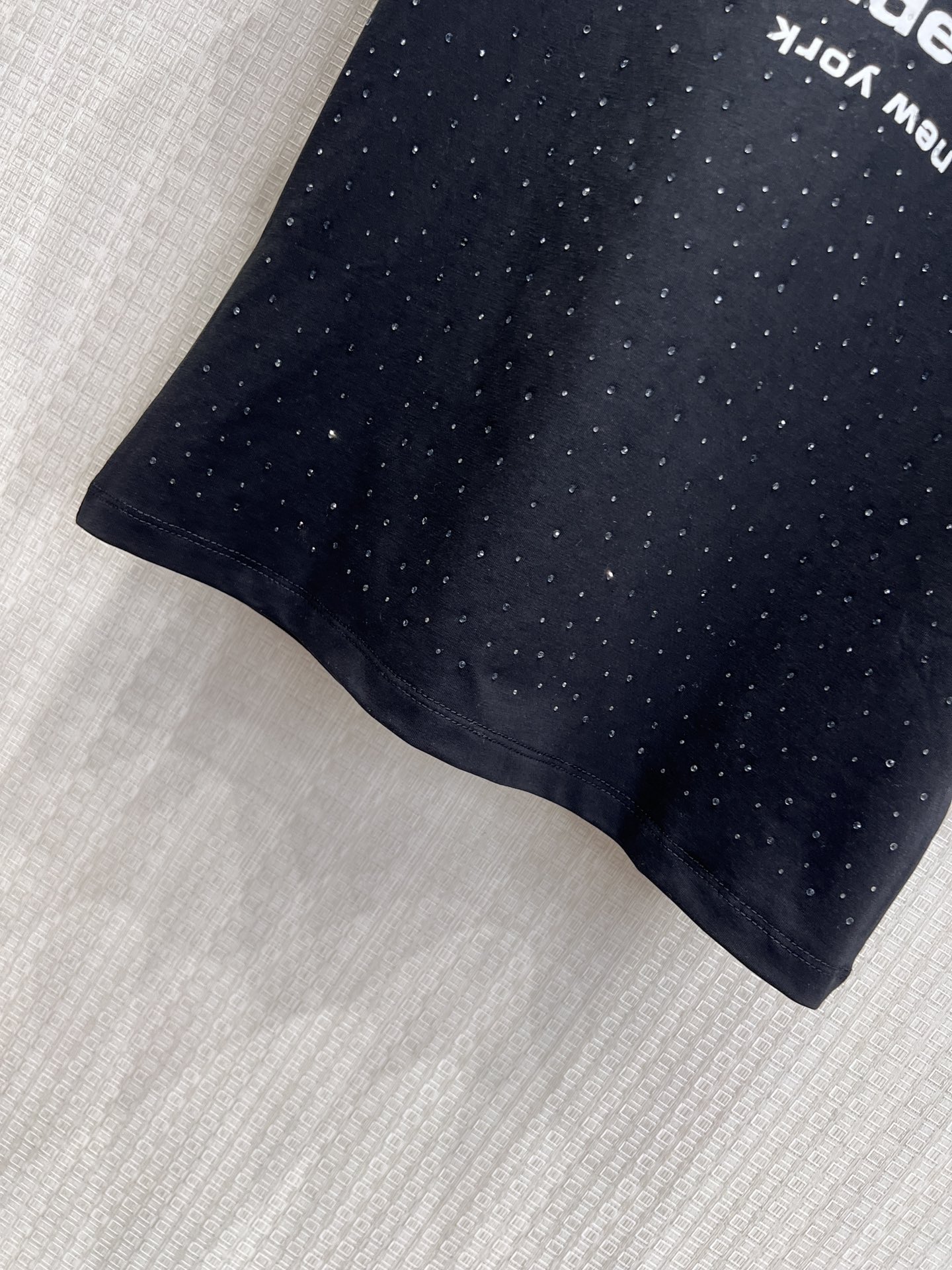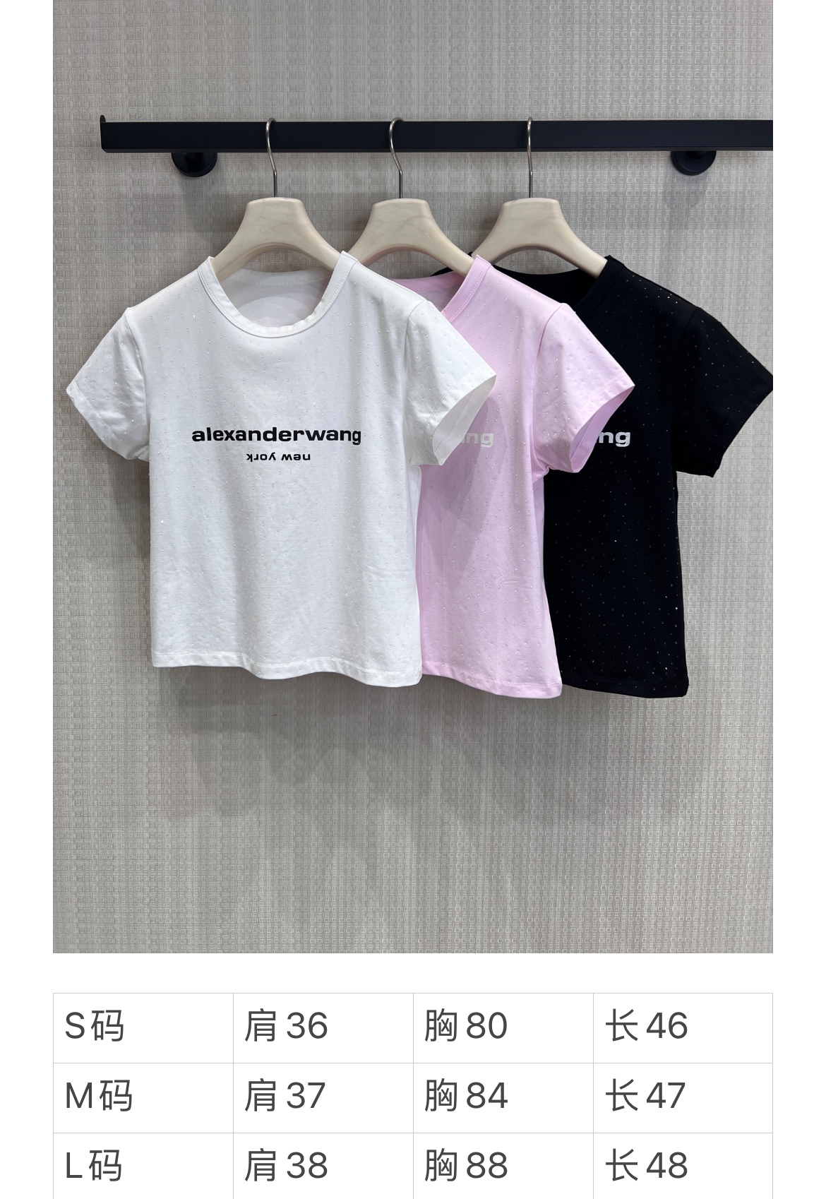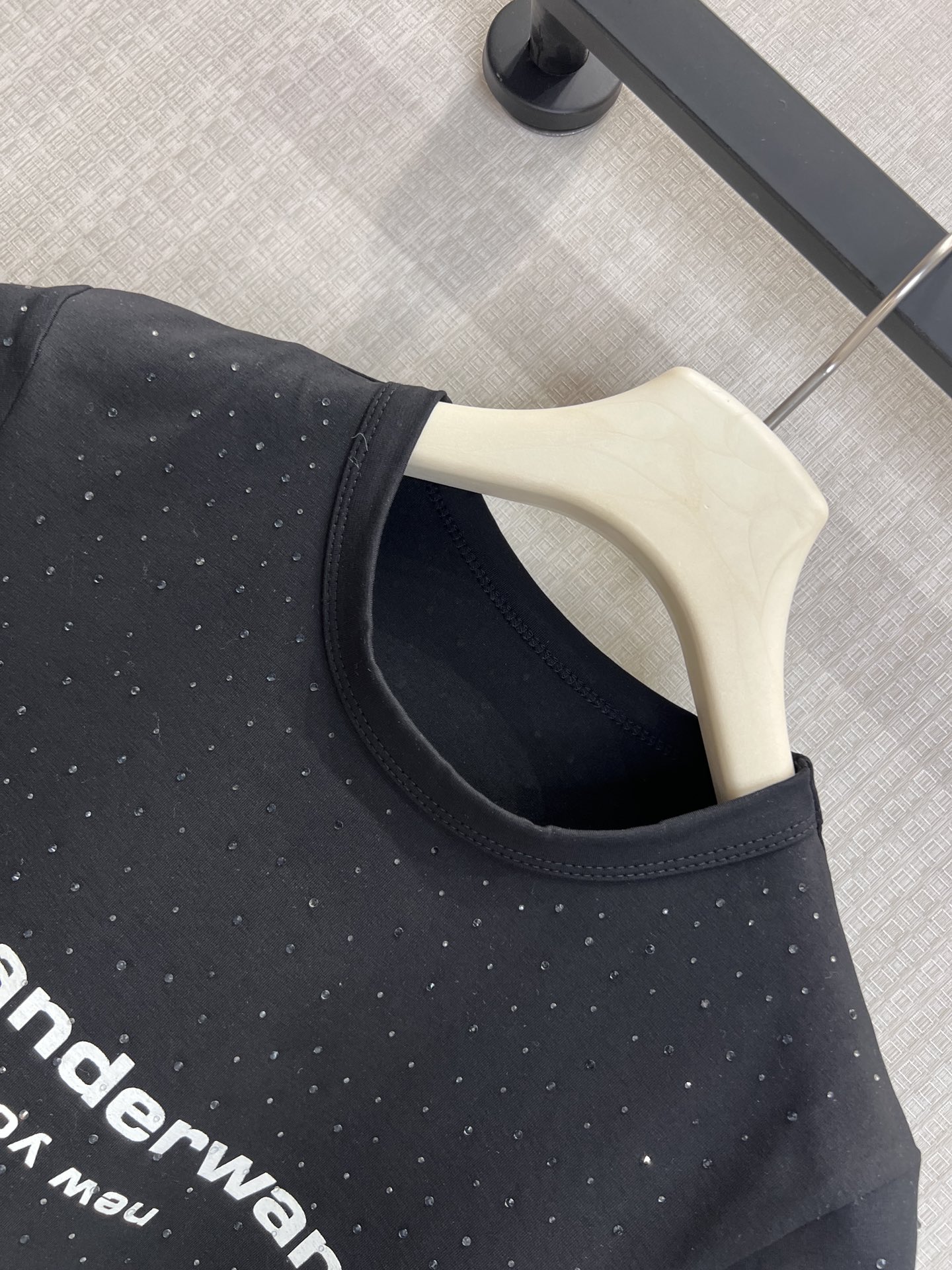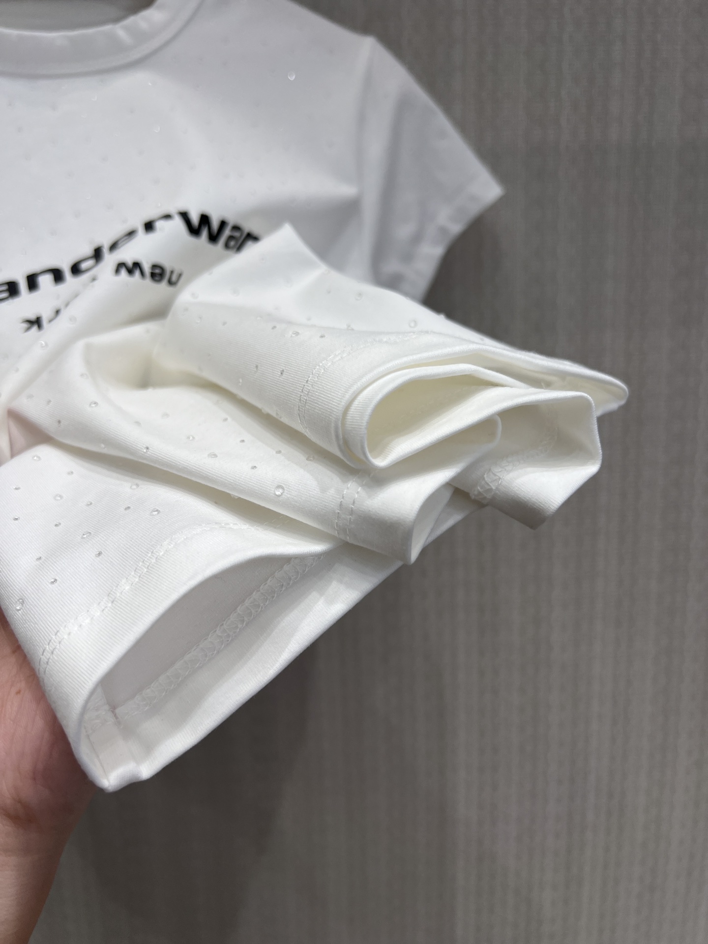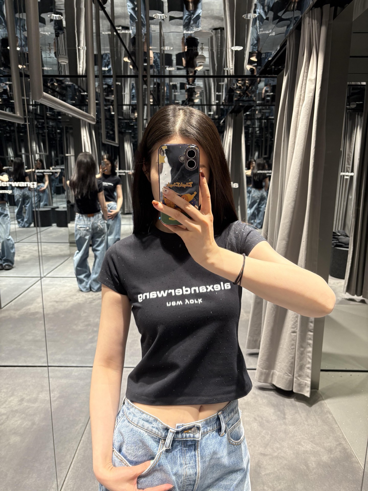 Aw* 26SS春夏新款 字母印花满水晶烫钻修身短袖圆领T恤丨⚠独家yb开发!顶级高版出品!高弹亲肤的棉质混纺面料,软糯透气且贴合身形,修身微短版型,对身材包容度高,小圆领+修身短款剪裁,精准勾勒腰线,轻松打造露腰辣妹风。既能凸显曲线又不会过于紧绷,适配各种身材的辣妹穿搭。现货发售S/M/L