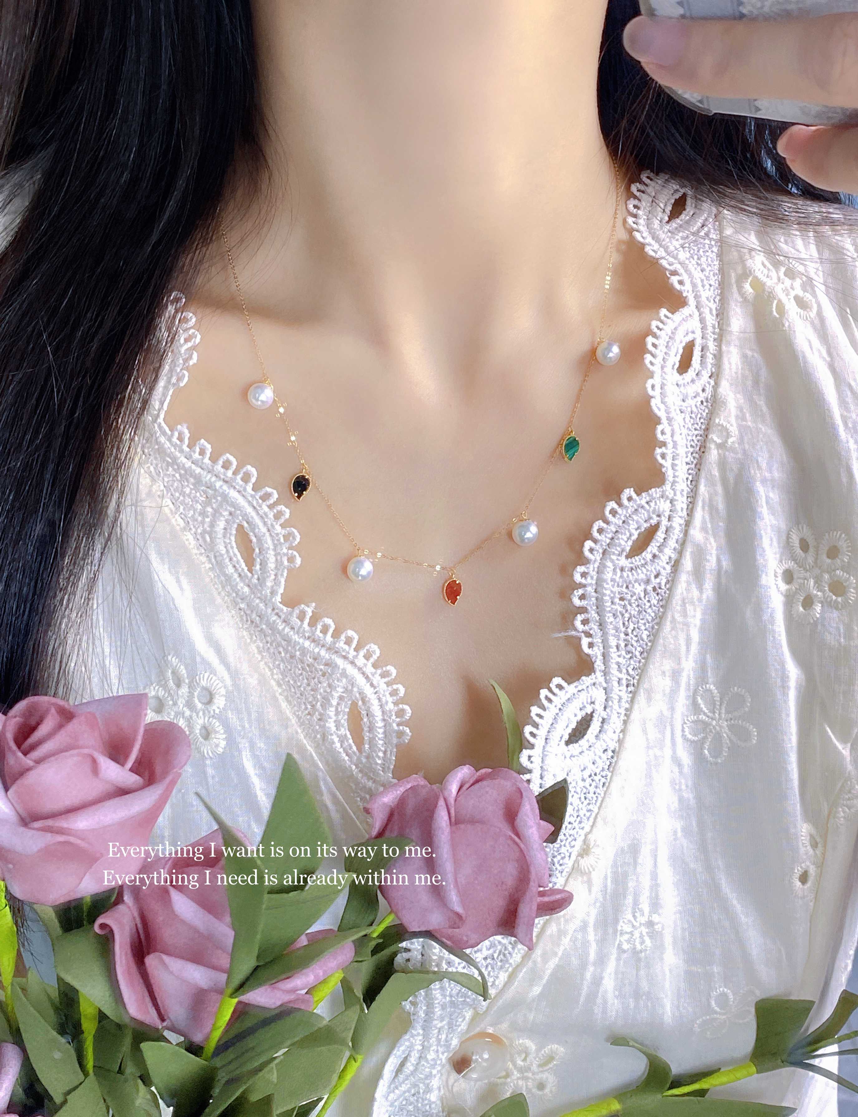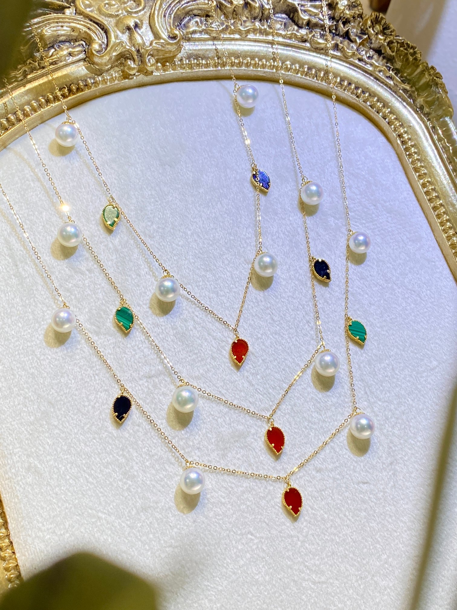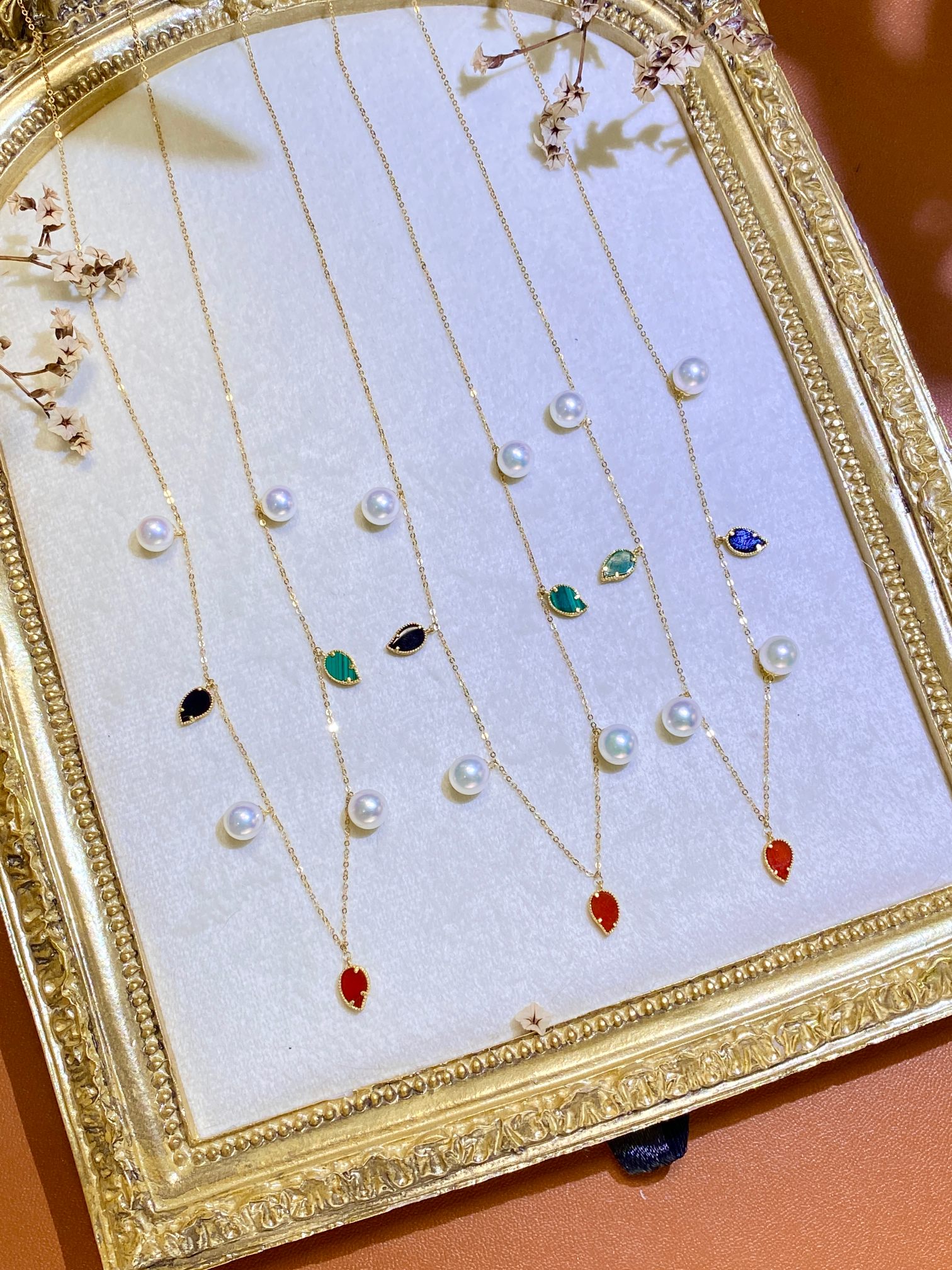 商品材质链条:18k金配件:6-7mm海水akoya珍珠,玛瑙,孔雀石