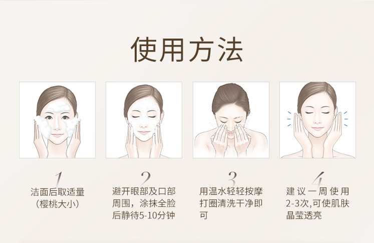 潔面後,把粕面膜適量塗抹在臉部,避開眼睛嘴巴。 靜待5-10分鐘,用溫水洗淨即可。推薦一周使用2-3次左右。