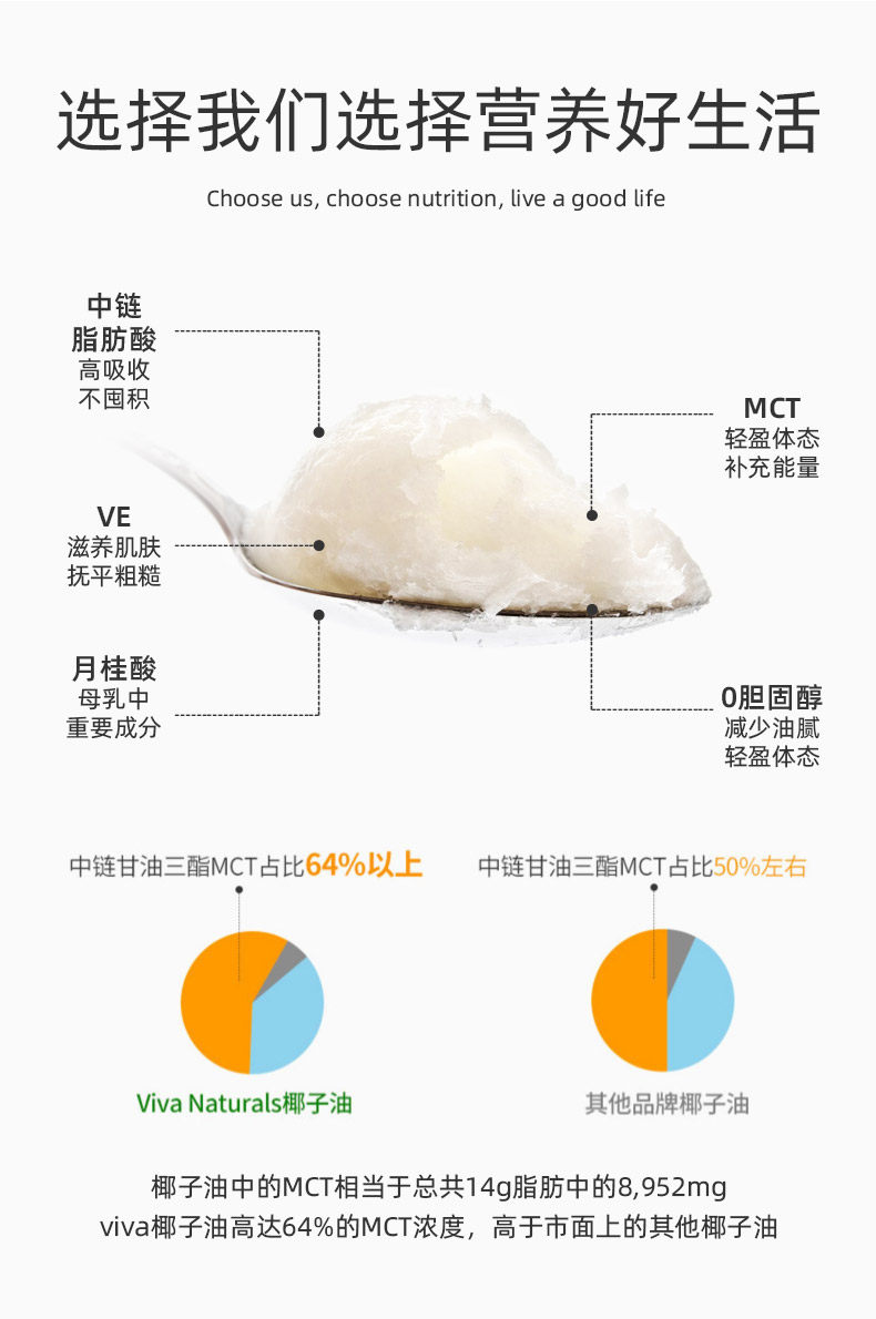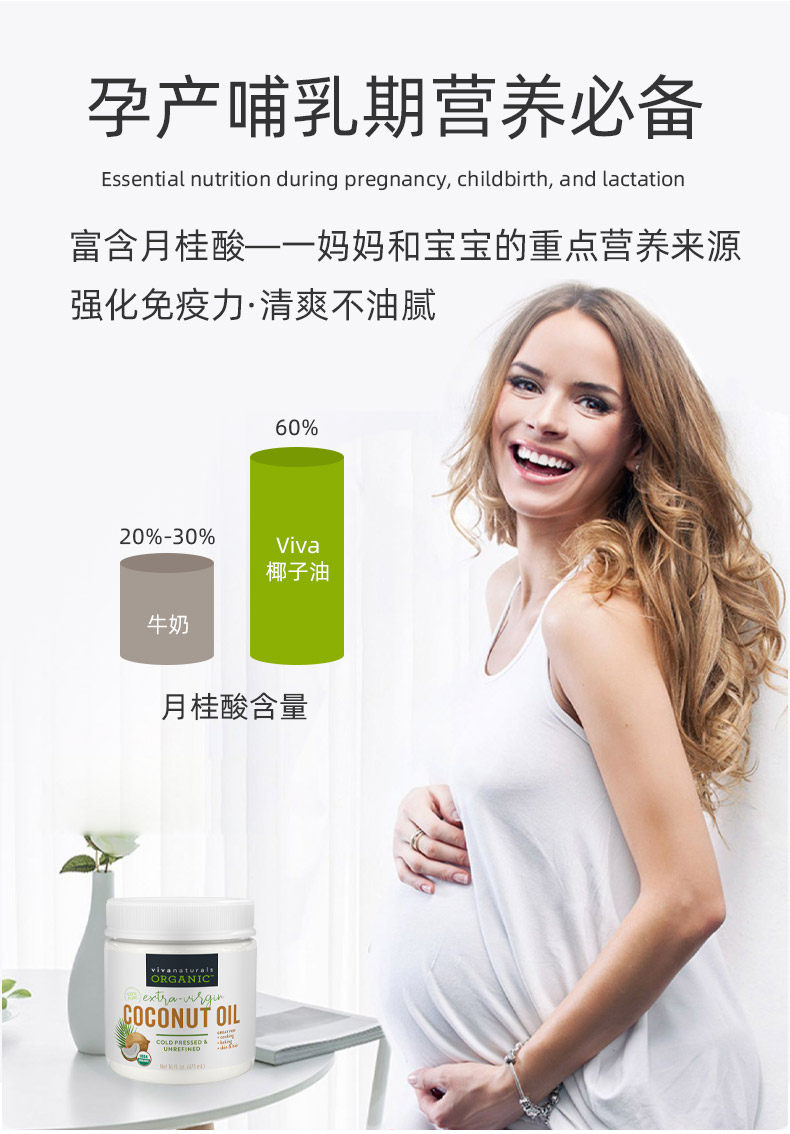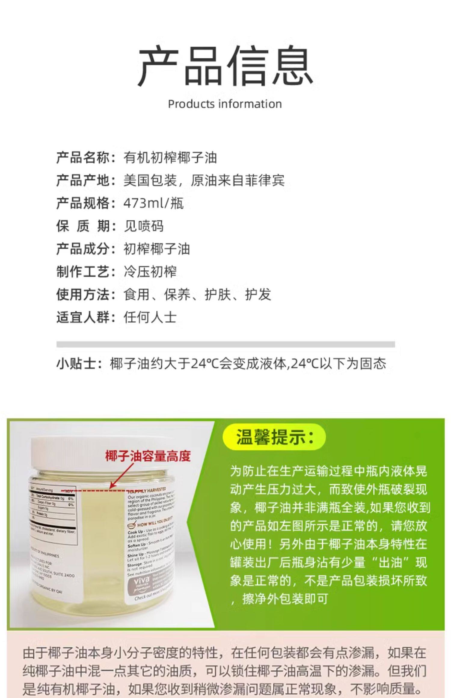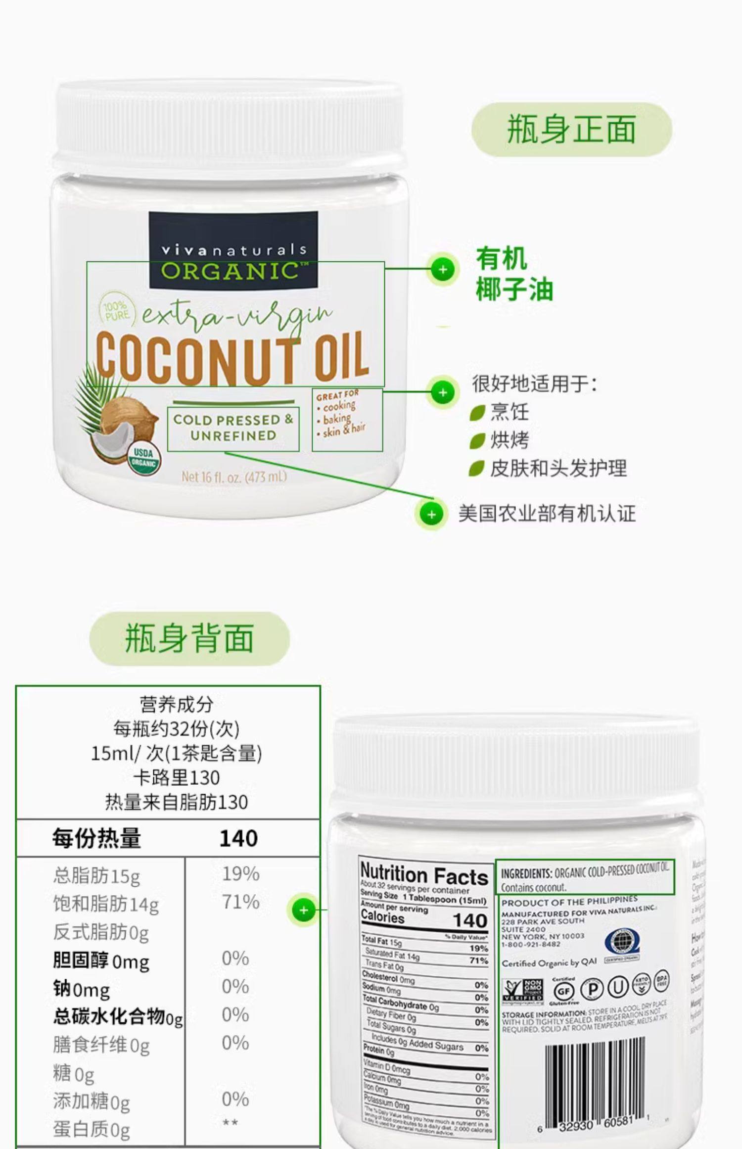 Viva美国进口有机无糖天然冷榨椰子油食用油护肤护发卸妆473ml