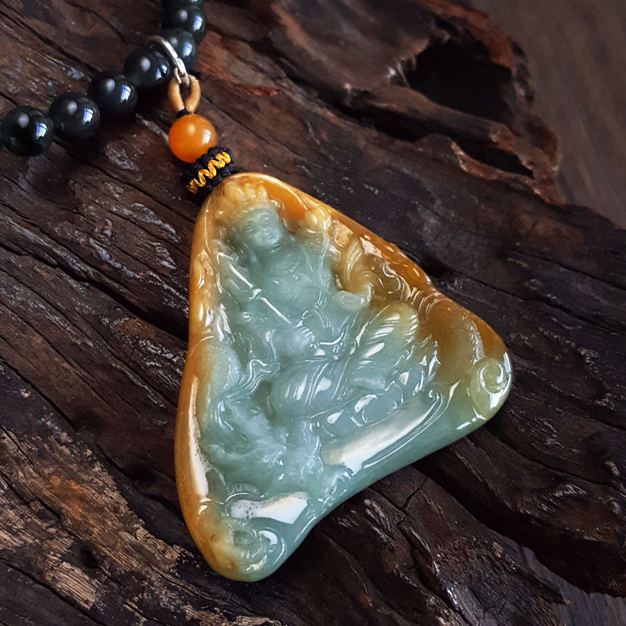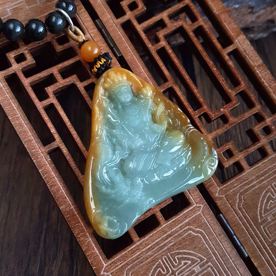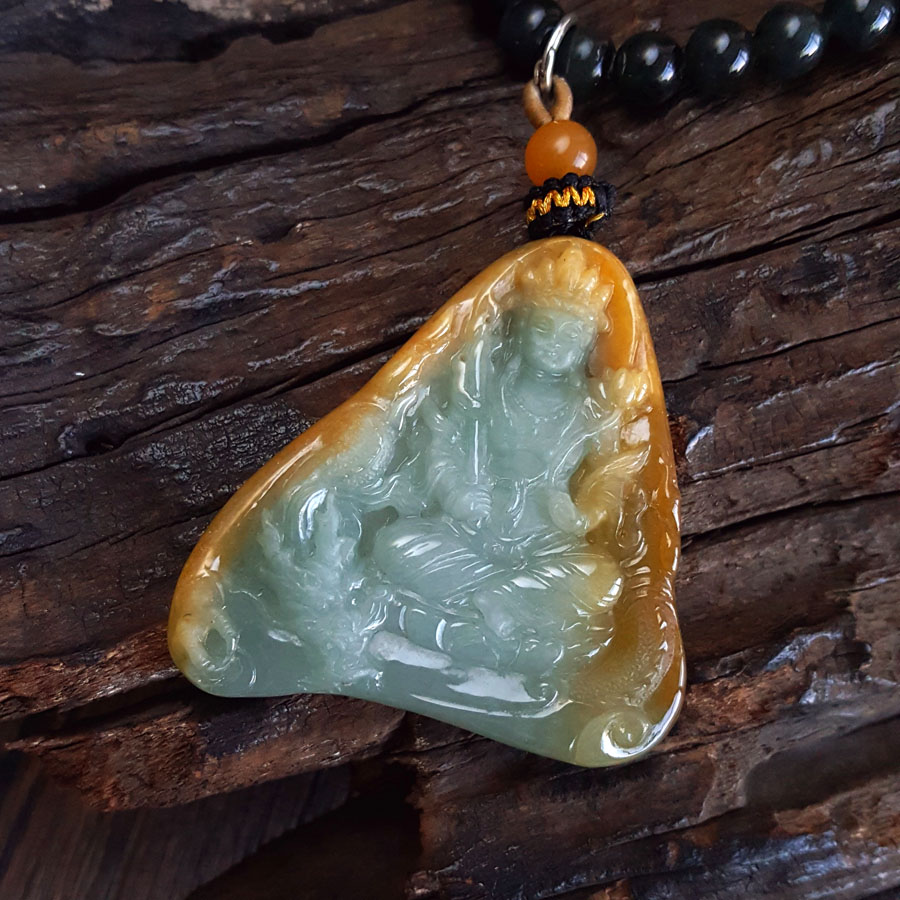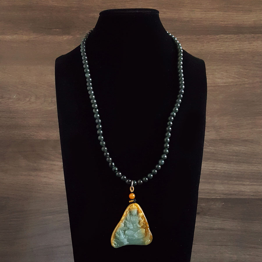 名称 | 天然细腻糯种持莲观音(平安安乐)随形平安无事牌黄翡珠串项链 |