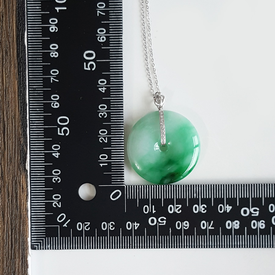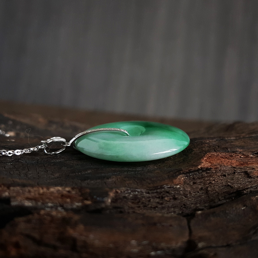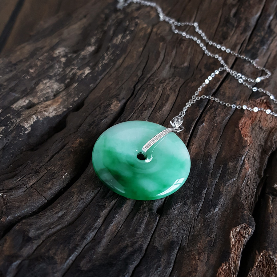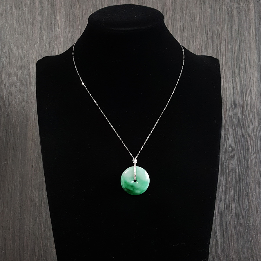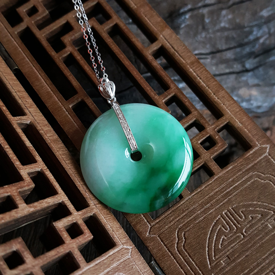名称 | AU750精品 白金镶天然糯种飘绿平安扣翡翠(吉祥、如意)吊坠项链 |