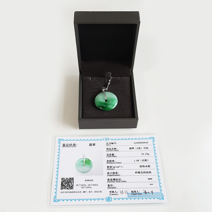 【天然正品】A货翡翠AU750精品 白金镶天然糯种飘绿平安扣翡翠(吉祥、如意)吊坠项链37.2*29.7*5.3MM(皆取最大值)中性款现售价:6880!211124XY03