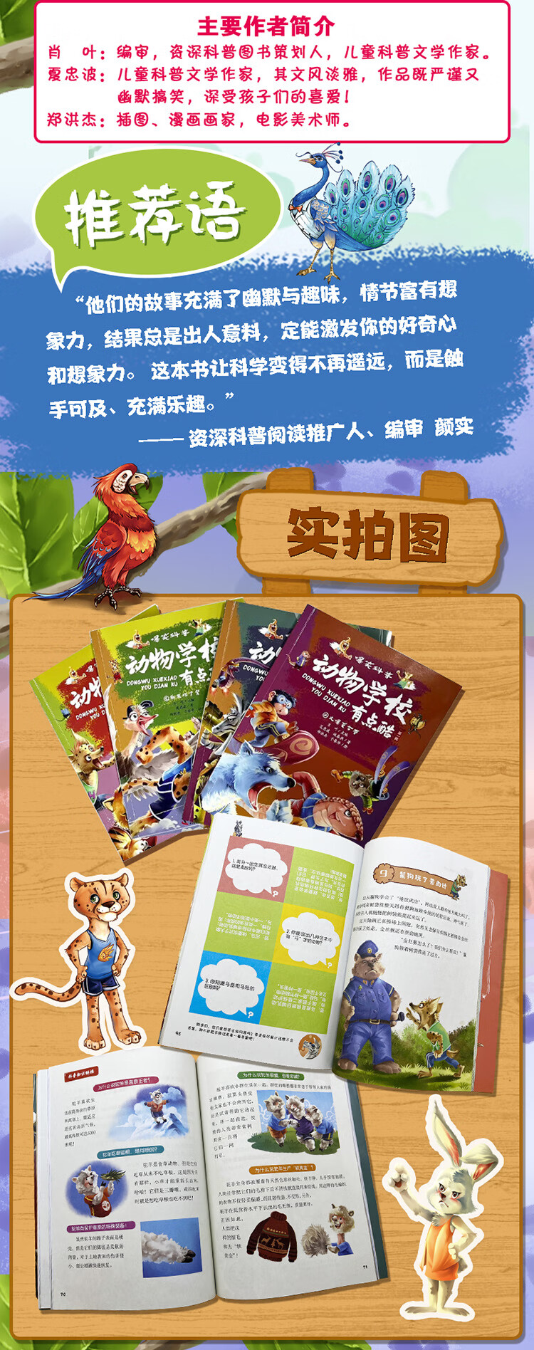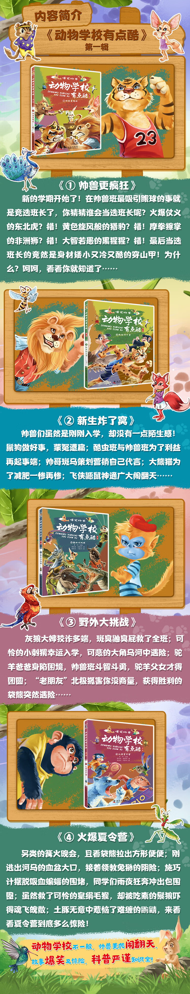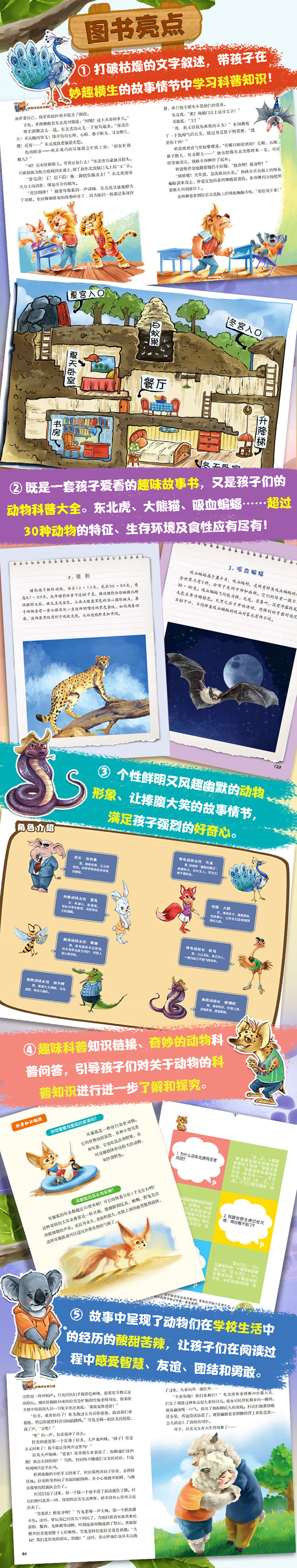 哈哈!别担心,因为是在学校里,动物们在遵循自然属性的同时,又在校规的约束下,使其社会属性得到充分地体现。在这里有明争暗斗的算计,也有热血互助的关怀;有东北虎、非洲狮的恃强凌弱、八面威风,也有鬣狗、树袋熊的忍气吞声、委曲求全;有弱者的机智逆袭,强者的一败涂地。在严谨的科普知识链接里,可以看到帅兽们的捕食,酷虫们的协作,绣鸟们的哺育,美爬爬们的伪装……