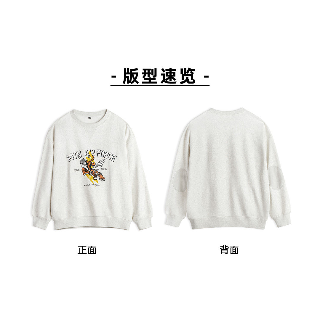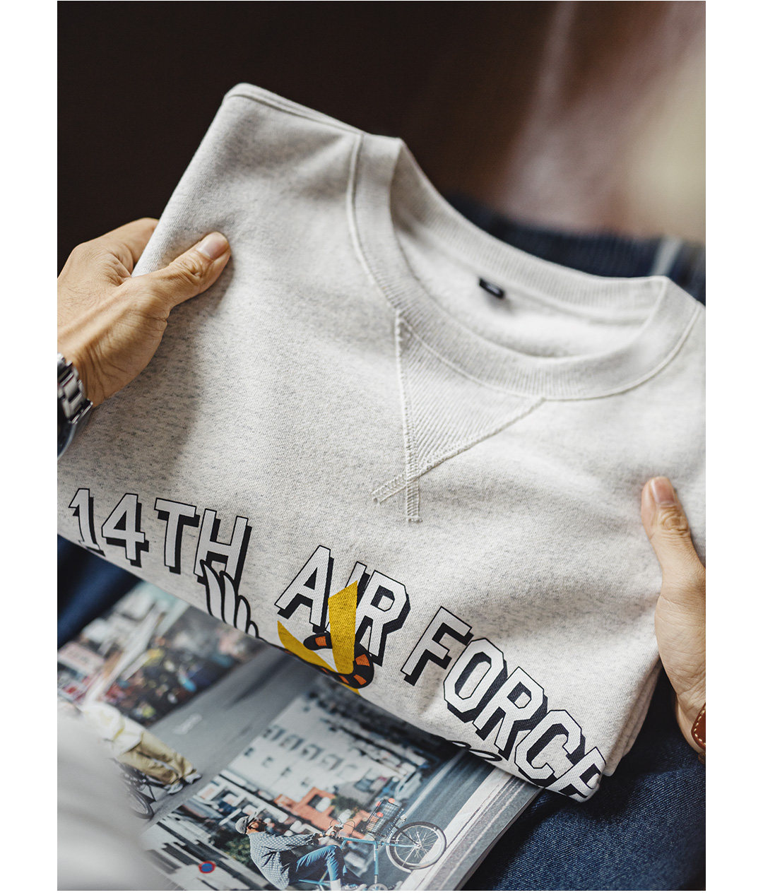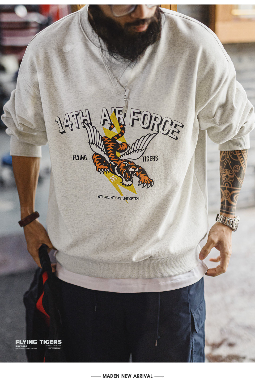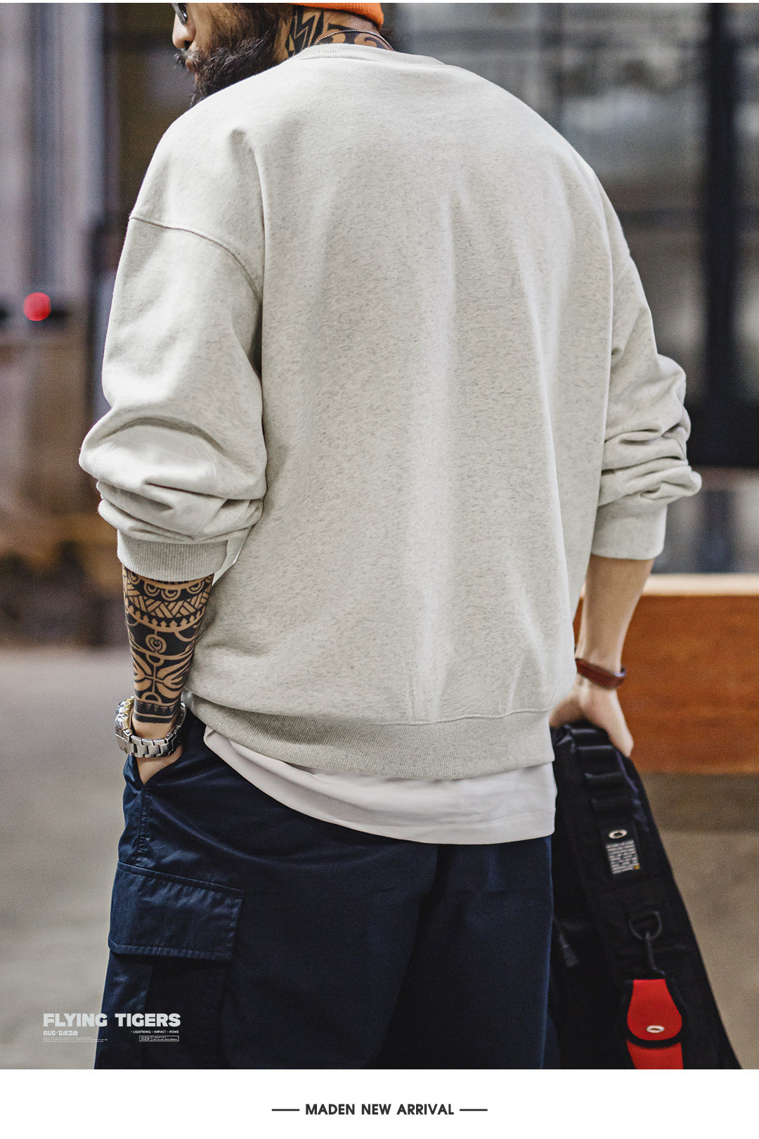 马登工装美式印花灰色圆领卫衣横须贺宽松落肩套头长袖T恤男款春