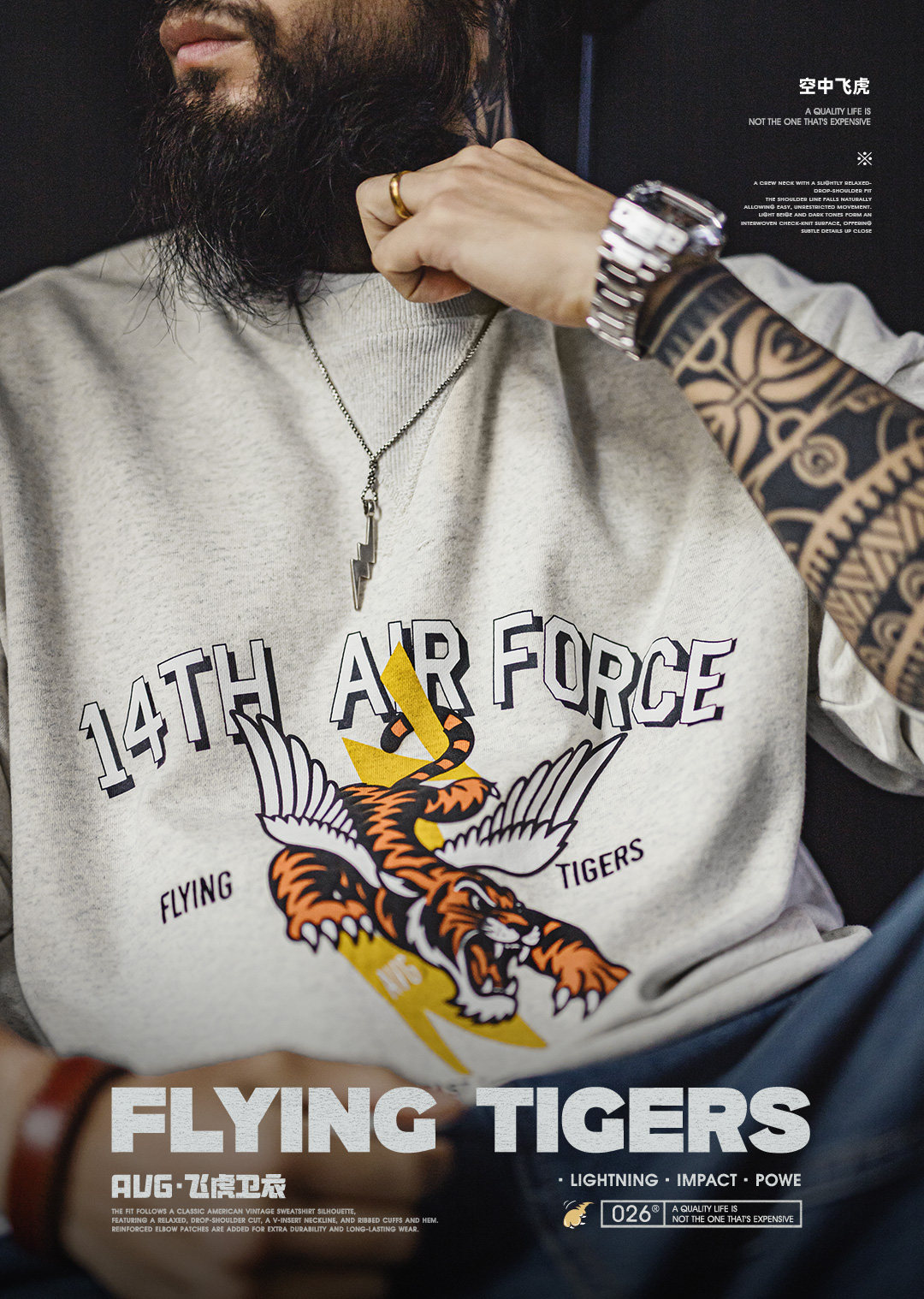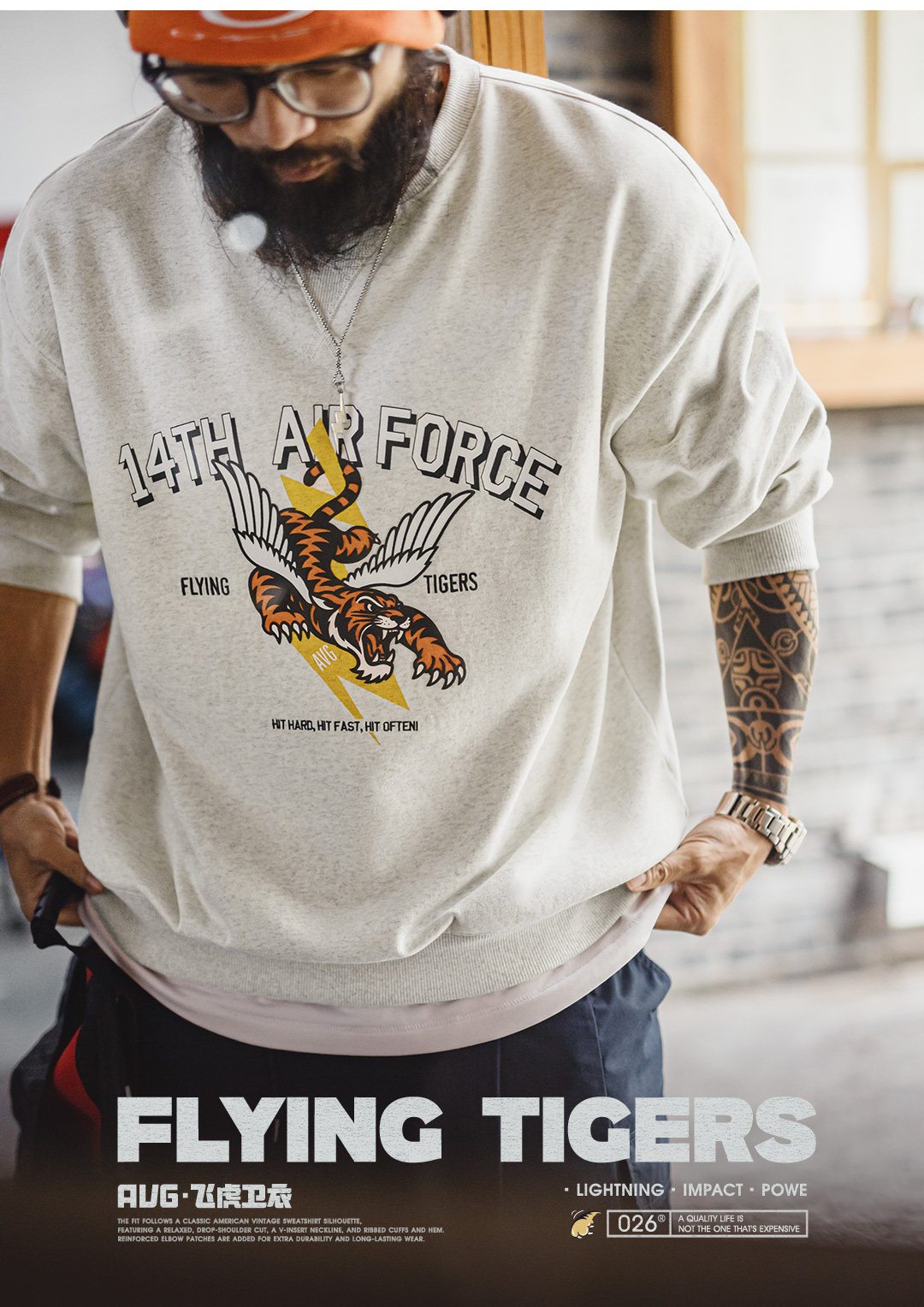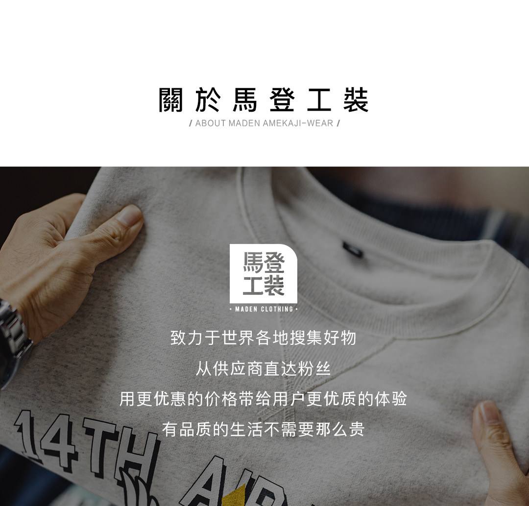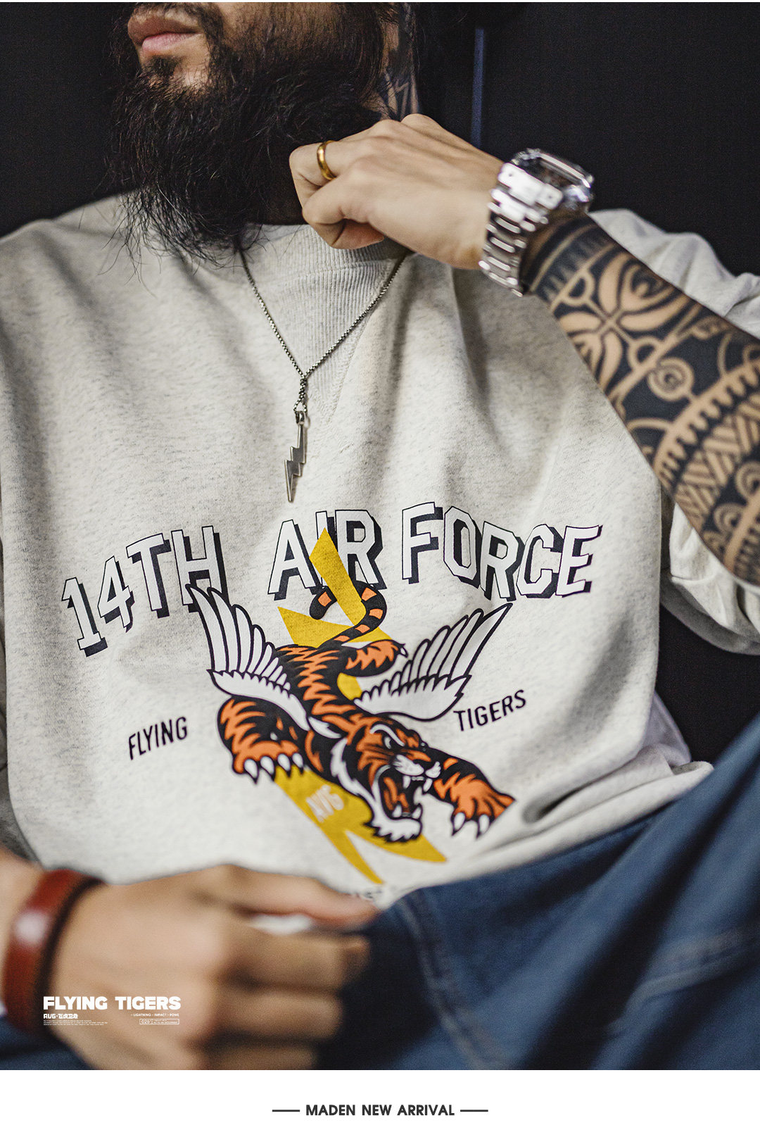 马登工装美式印花灰色圆领卫衣横须贺宽松落肩套头长袖T恤男款春