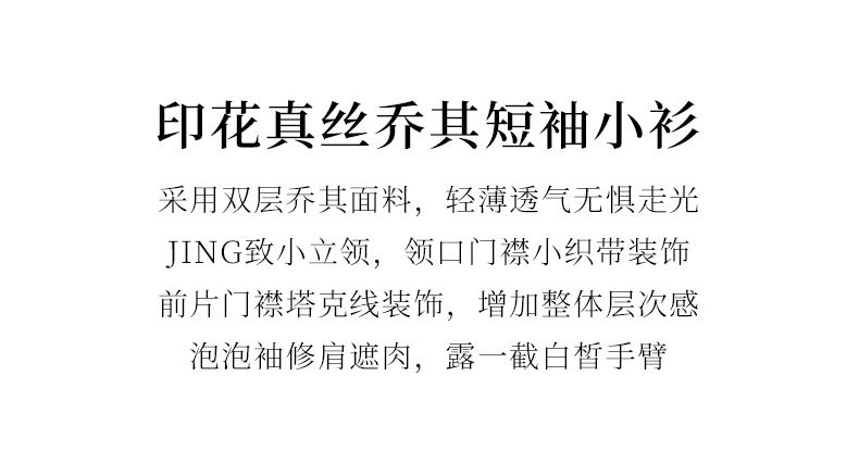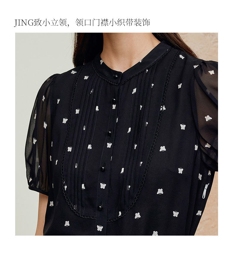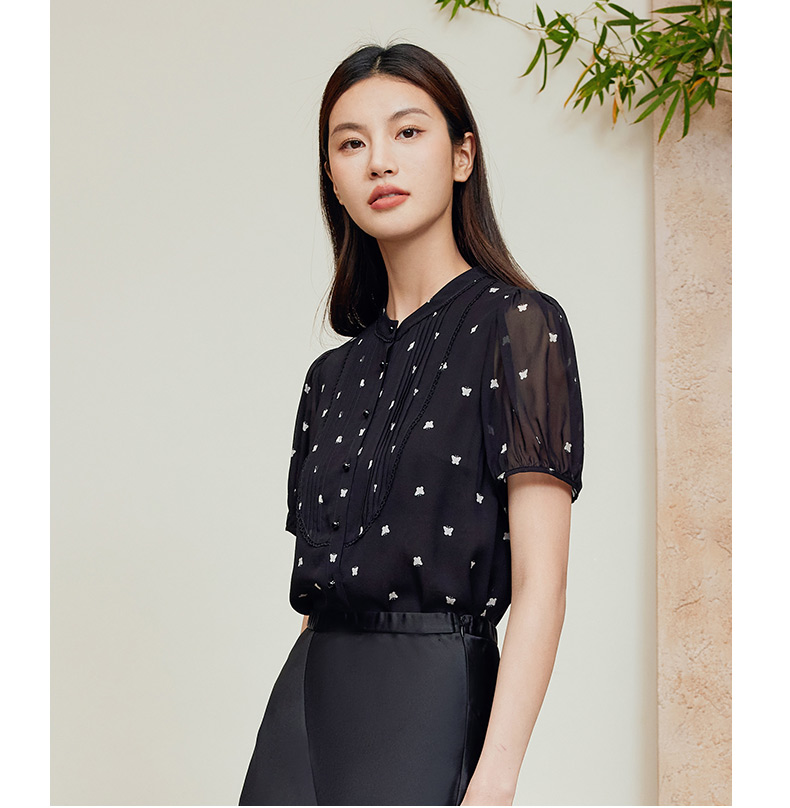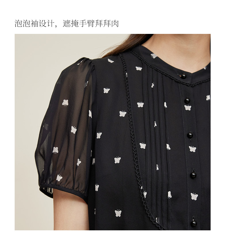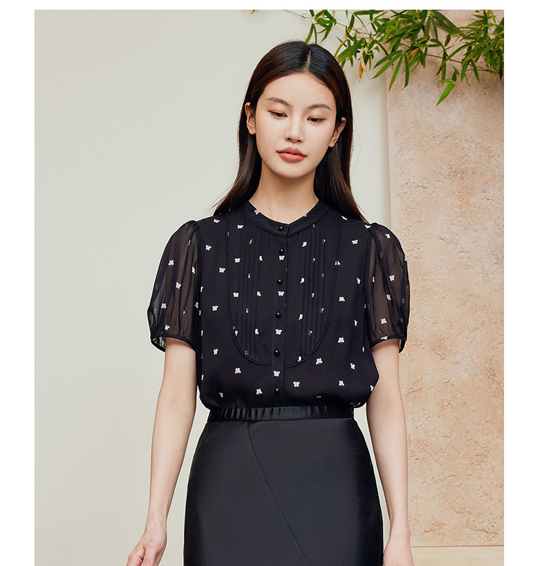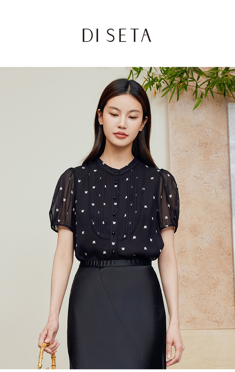 玳莎印花小立领真丝衬衫女2024夏季新款优雅织带设计感泡泡袖上衣 EB31105