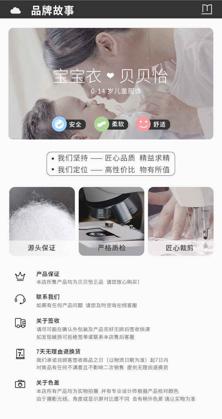 - 贝贝怡专注0-6岁婴幼儿服饰,坚持安全、柔软、舒适的产品理念,为千万中国家庭提供超高品质、安全可靠的婴幼儿服饰产品,妈妈放心,宝宝开心!