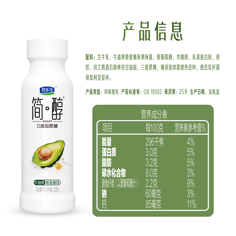 君乐宝简醇风味发酵乳(0蔗糖牛油果藜麦爆珠)230g,保质期25天
