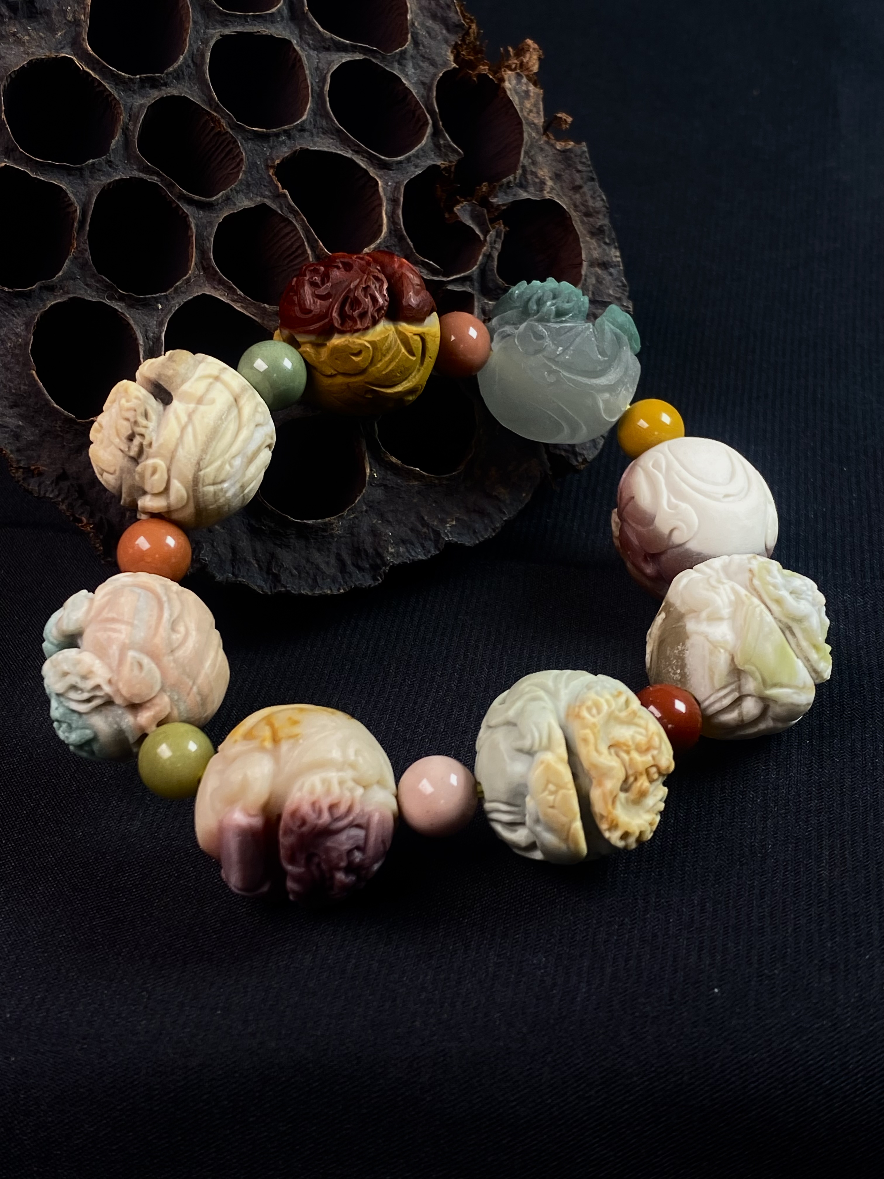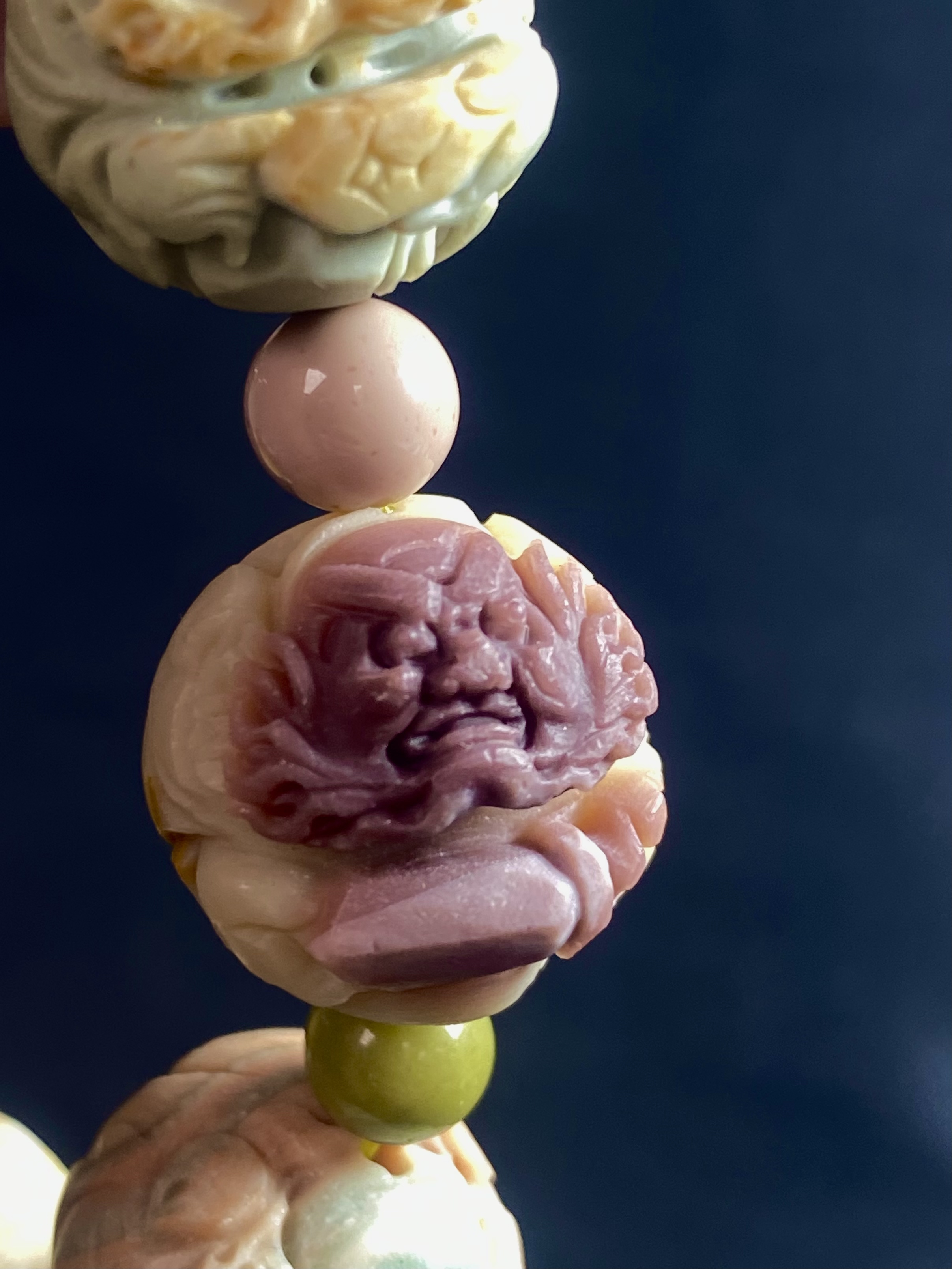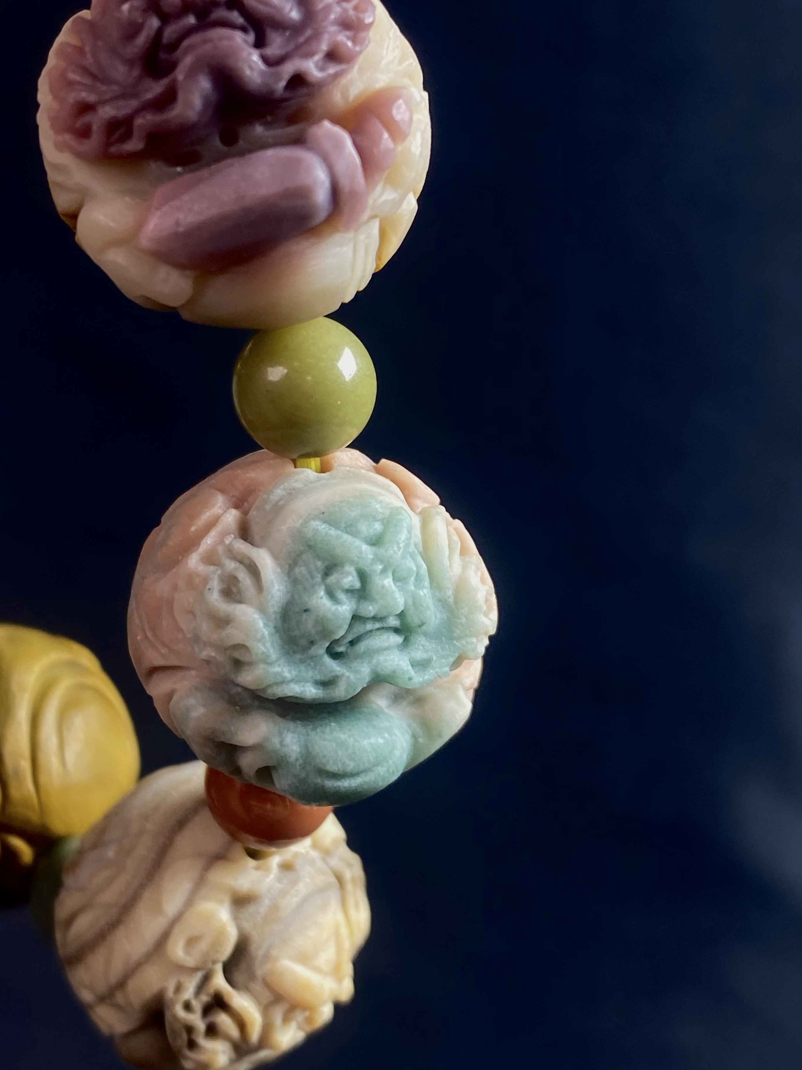 阿拉善玛瑙十八罗汉手串,来自天然的新疆阿拉善玛瑙,色彩丰富多样,纹理清晰,硬度高,手工雕刻,十八个罗汉形态各异,每一颗都是俏色雕刻,各有特色,生动活泼,栩栩如生。罗汉取一:19.8*19.8*17.3mm
