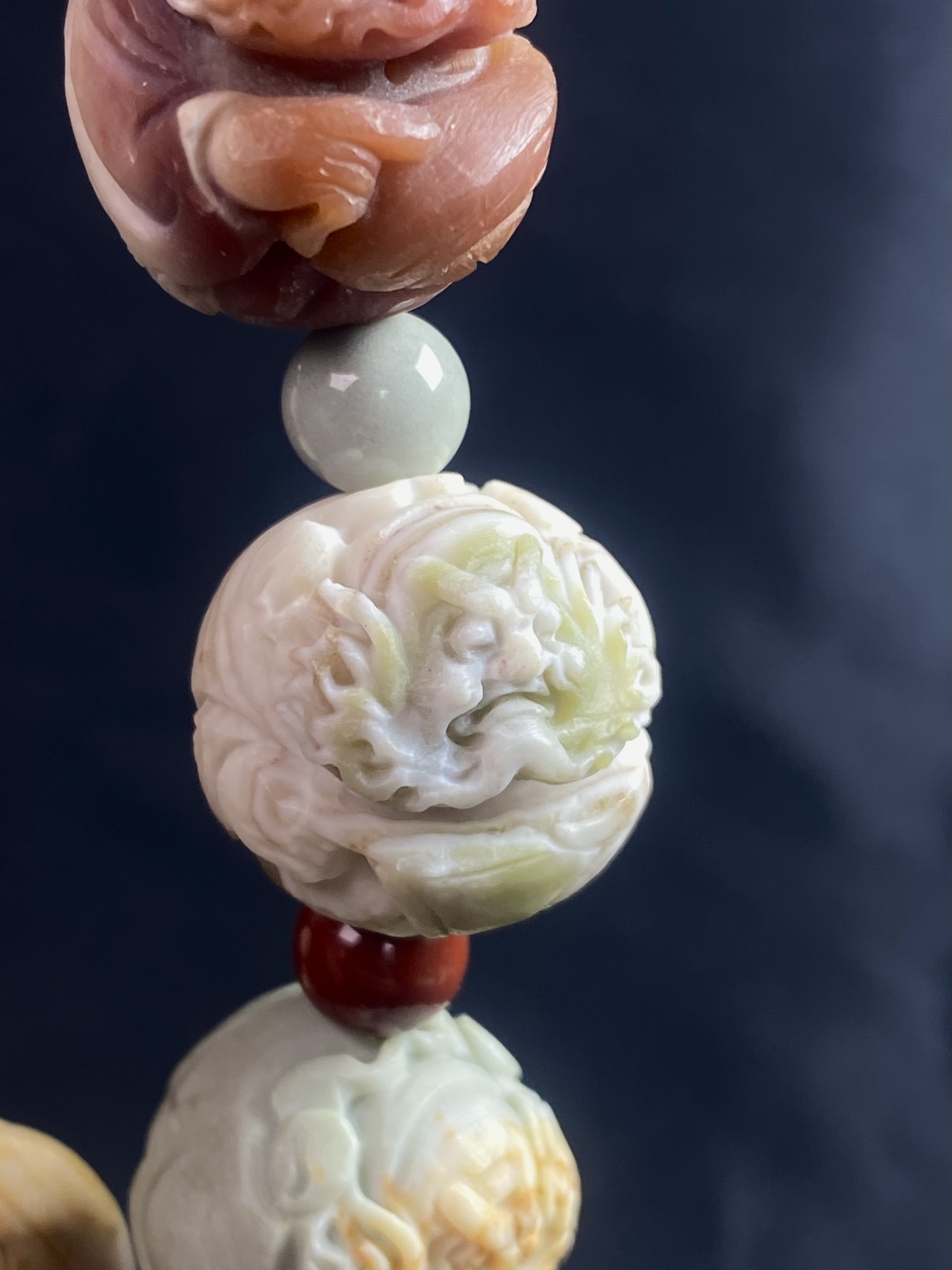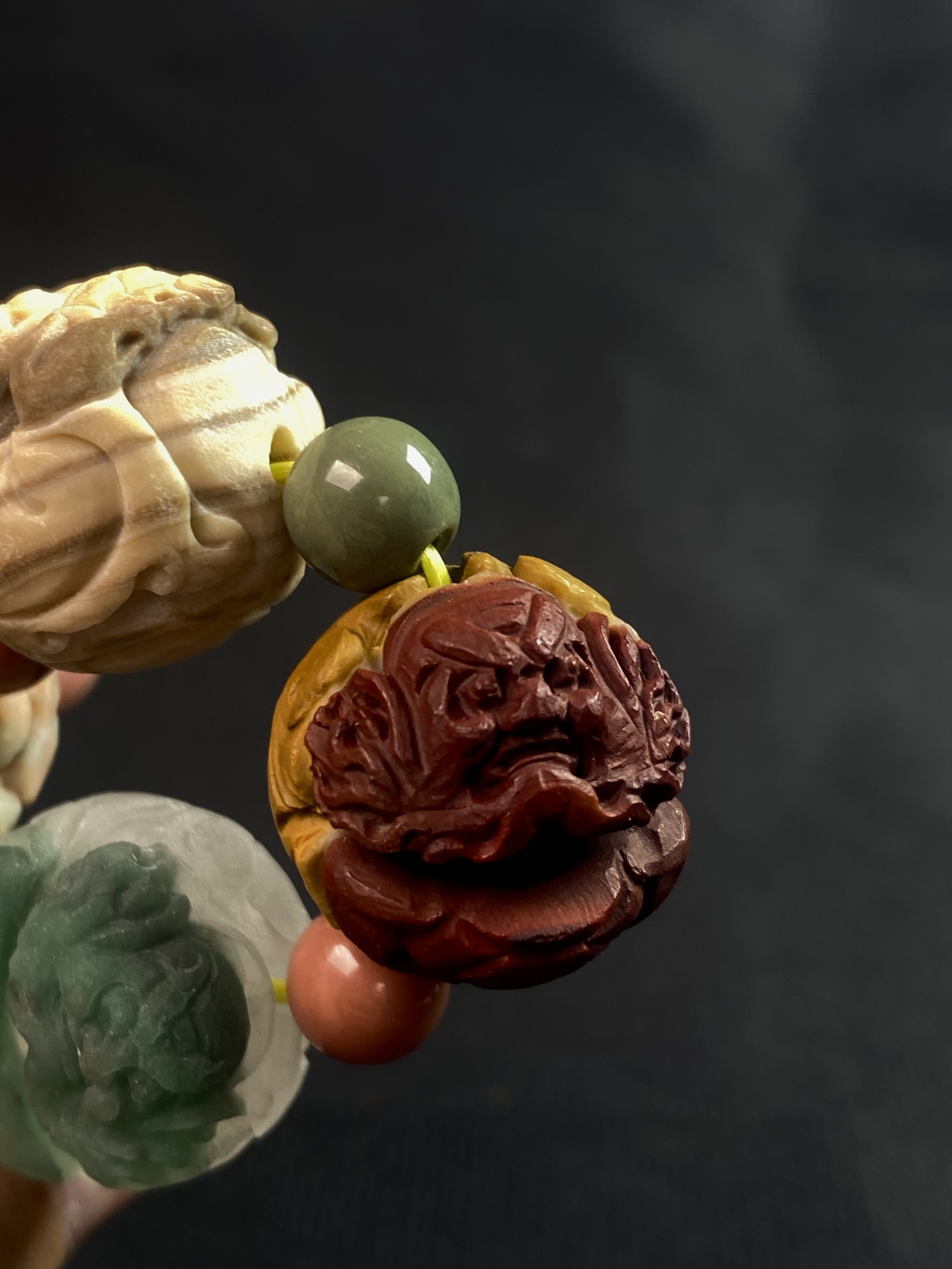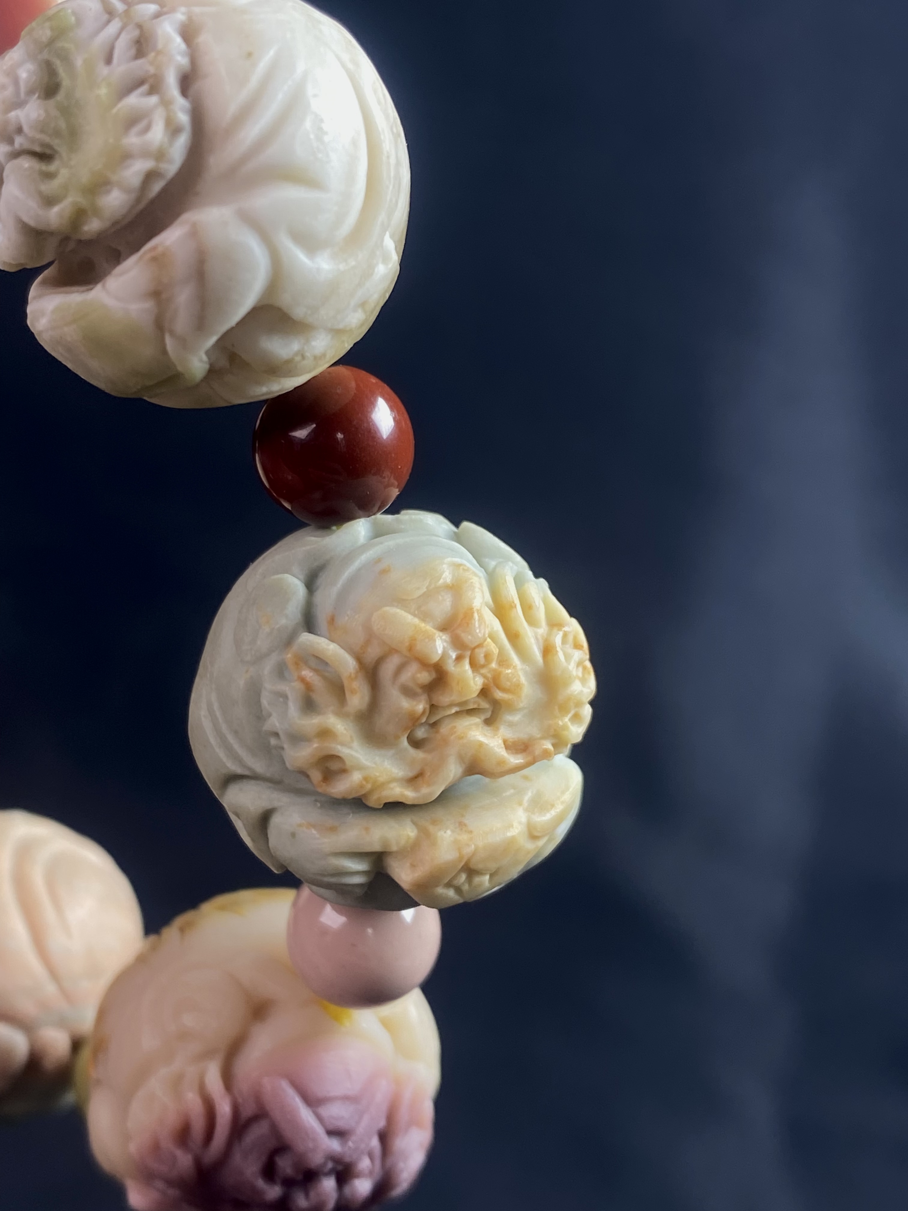 阿拉善玛瑙十八罗汉手串,来自天然的新疆阿拉善玛瑙,色彩丰富多样,纹理清晰,硬度高,手工雕刻,十八个罗汉形态各异,每一颗都是俏色雕刻,各有特色,生动活泼,栩栩如生。罗汉取一:19.8*19.8*17.3mm