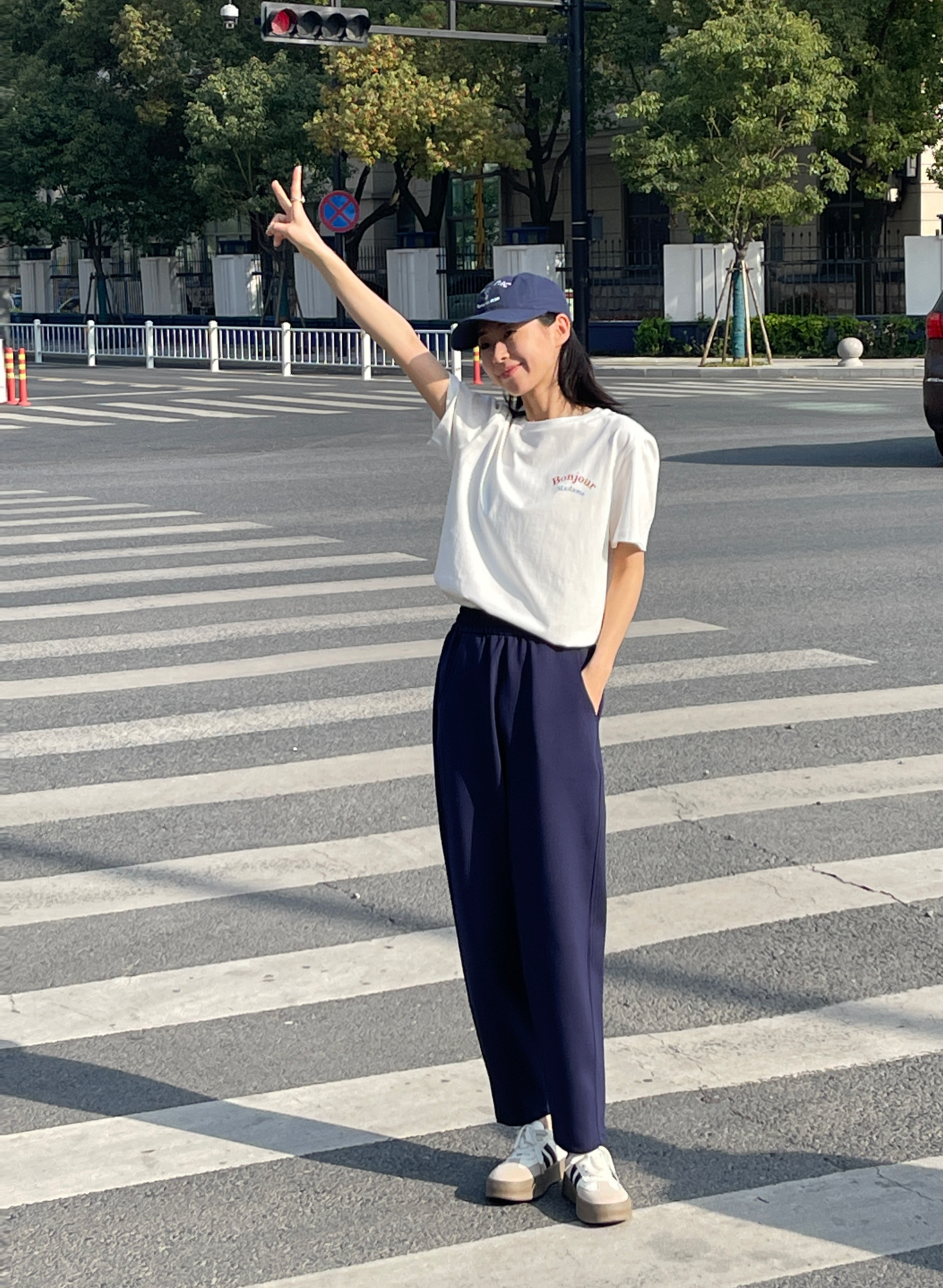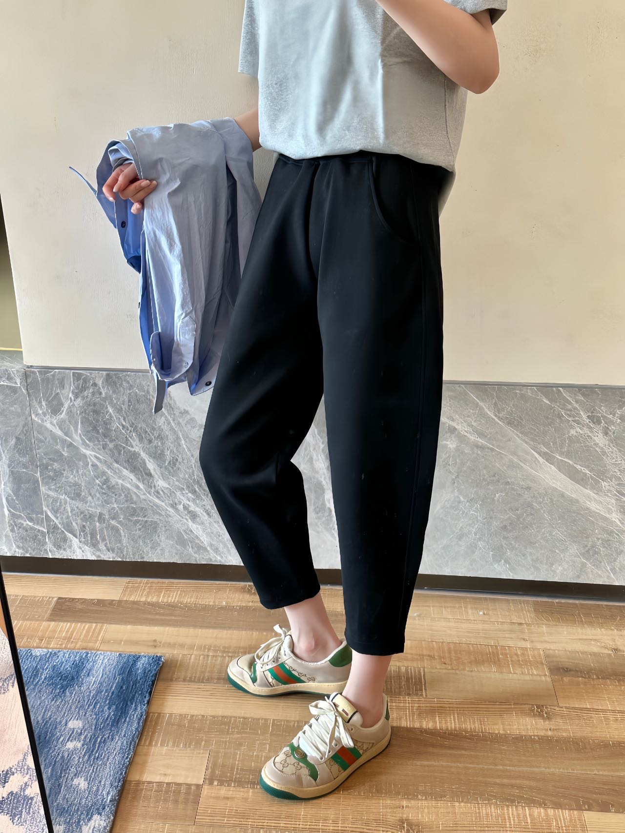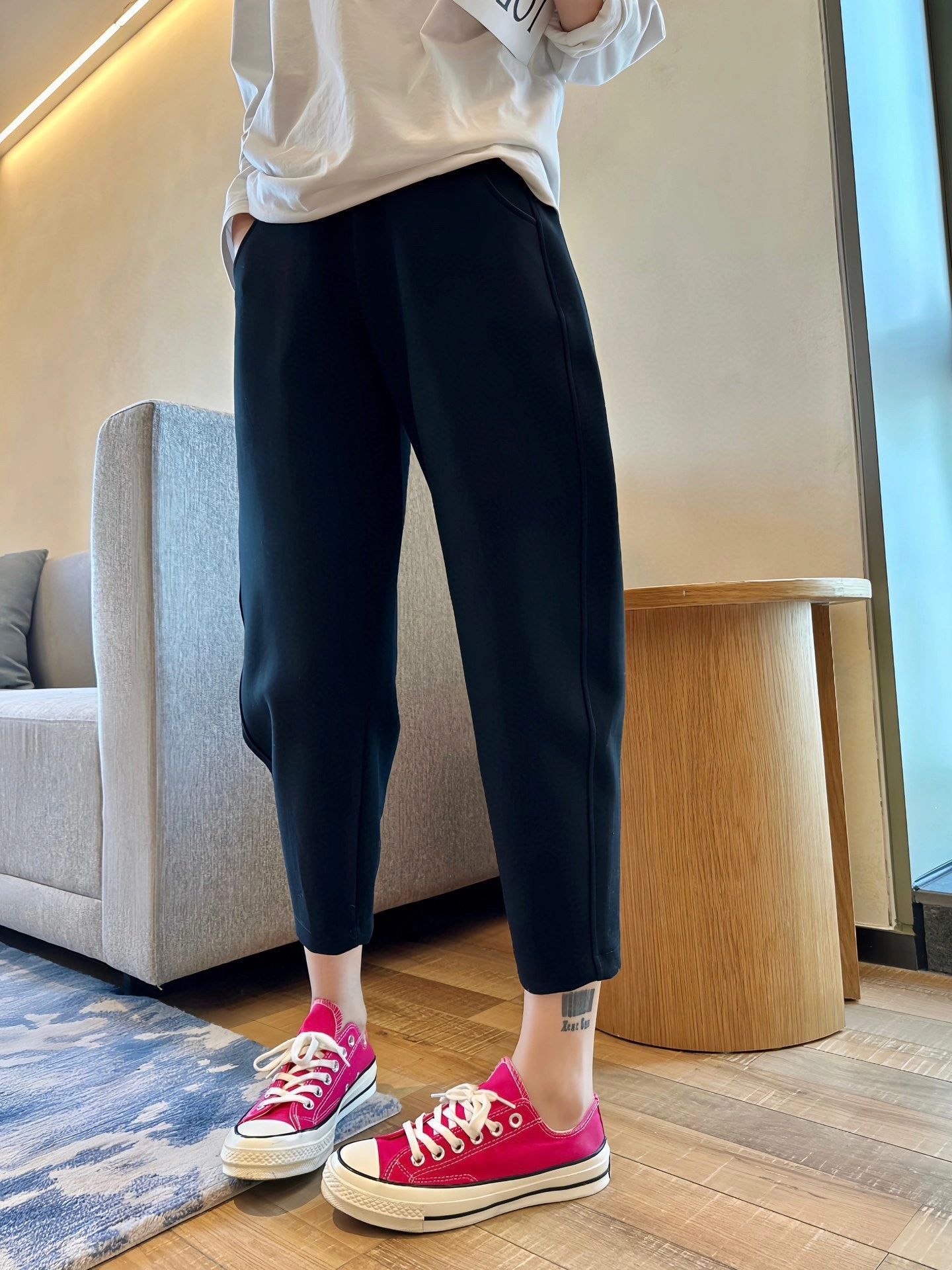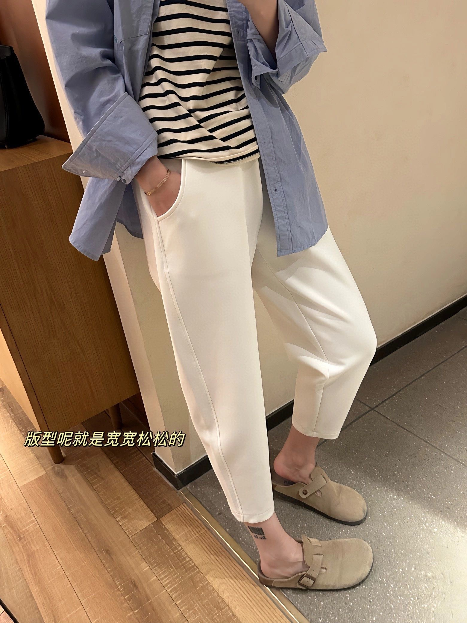 萝卜裤型,在视觉上拉伸腿线,利落又显高!九分裤长,高个子小个子都很好驾驭。