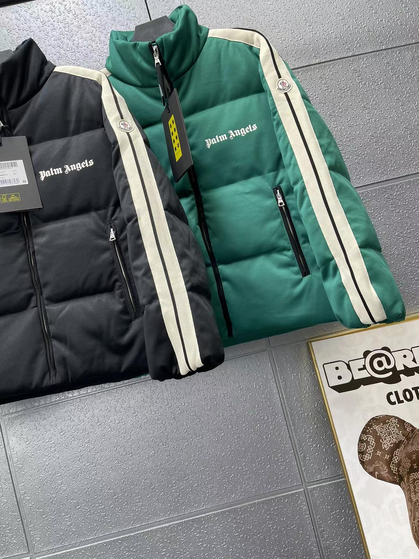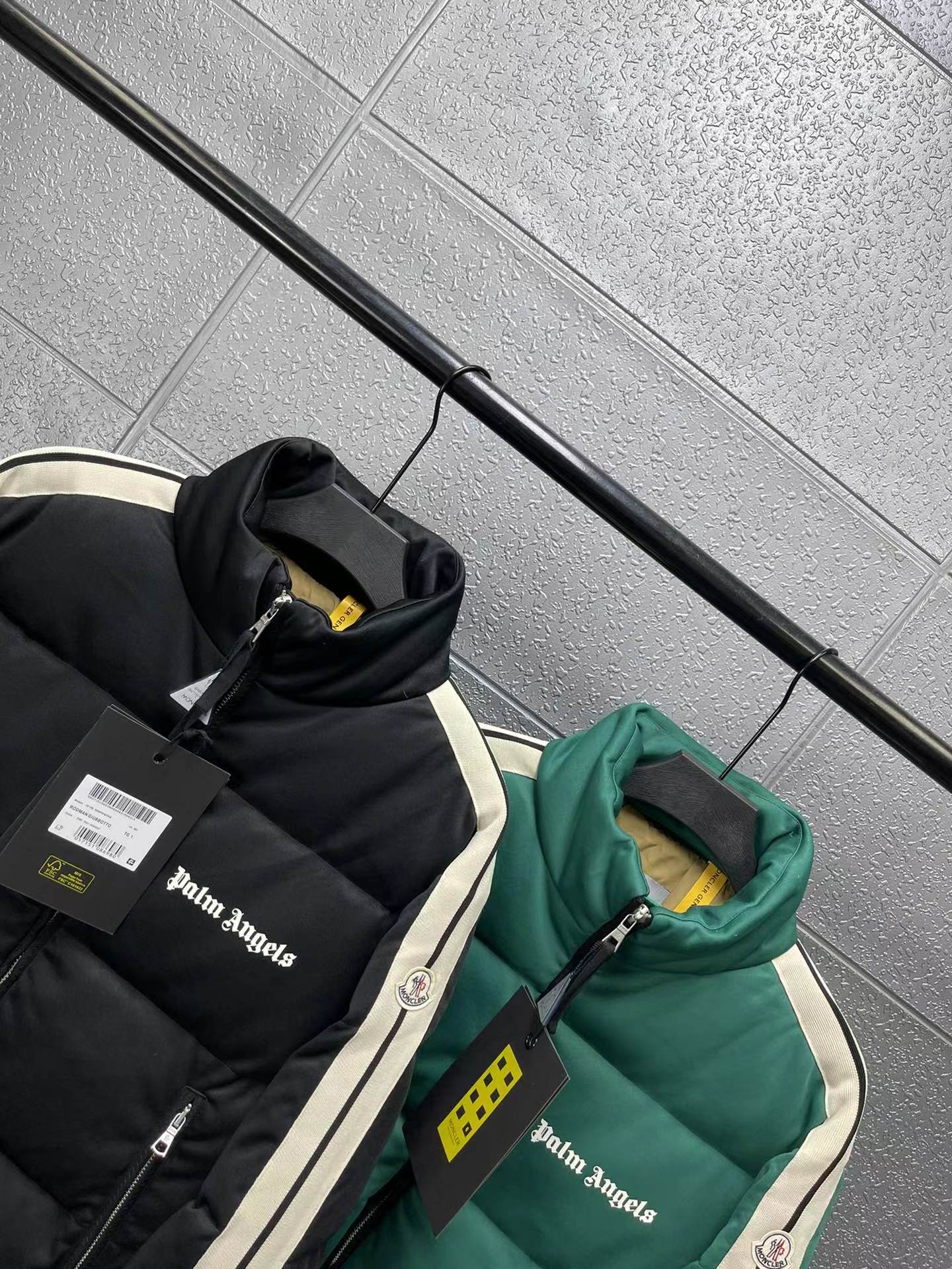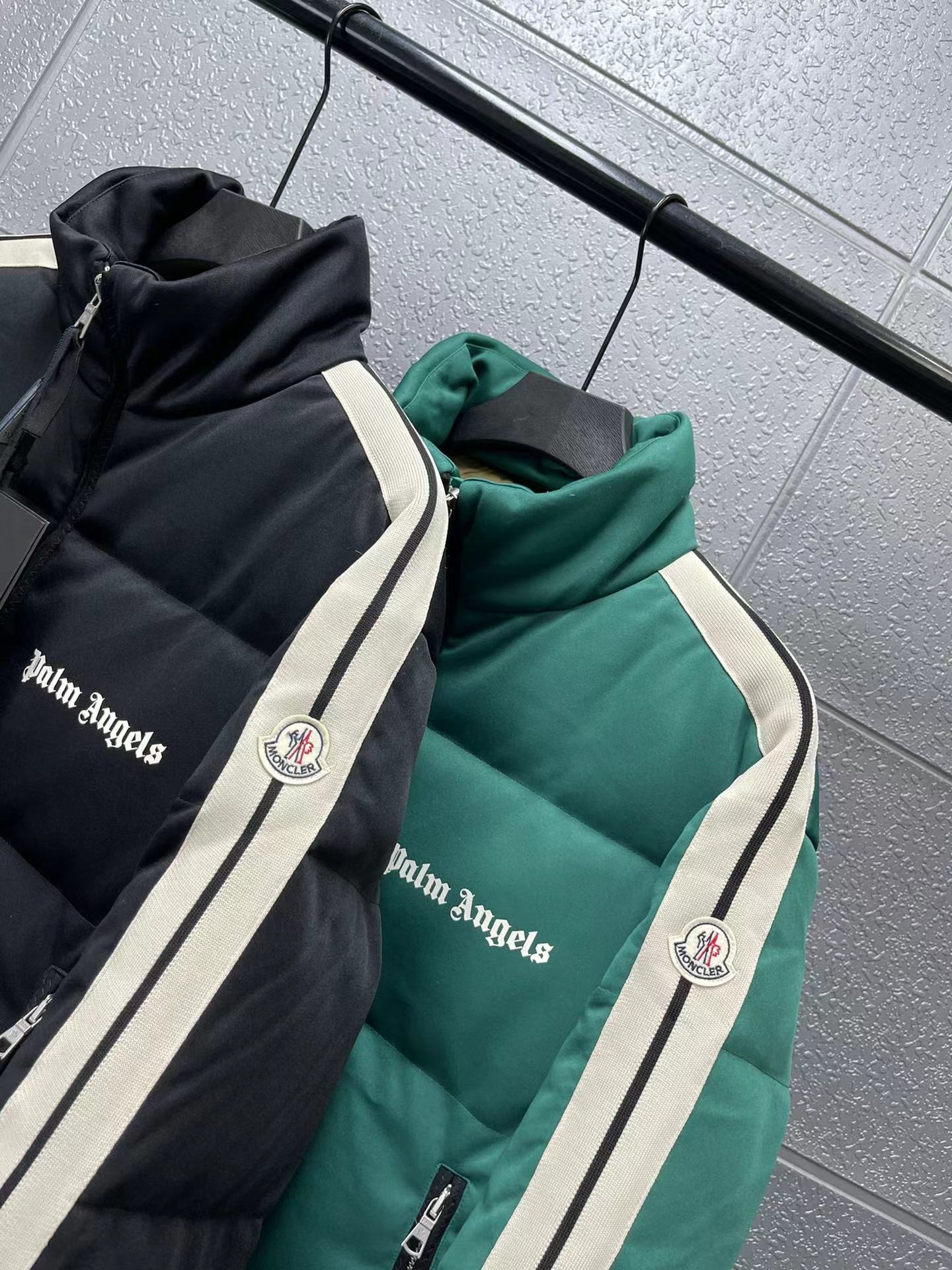 联名 徽标彩条刺绣logo羽绒服外套 。围绕古着店的理念,同时保持原有功能与简约主义,这一分的美式文化,纯色系的大身蓬松却毫无臃肿感,一拉而上的立领造型,胸口的字母成了主角,两侧袖子上米白色的宽镶边搭配中间的黑线条,充满了复古运动的校园风格,手臂上有一个标志性小徽标,联名系列显而易见,除了常规的黑色,分别带来了类似精典黑和孔雀绿的色调,减龄和出境都相当的引人瞩目。