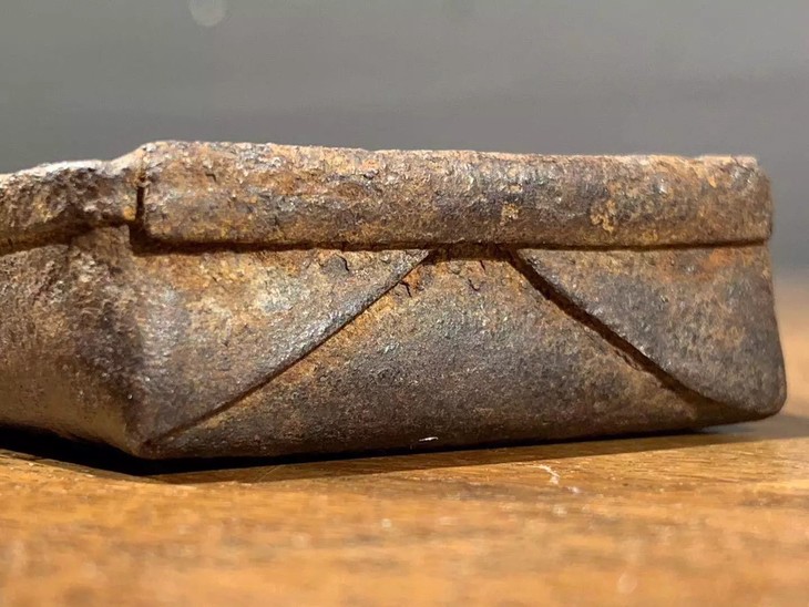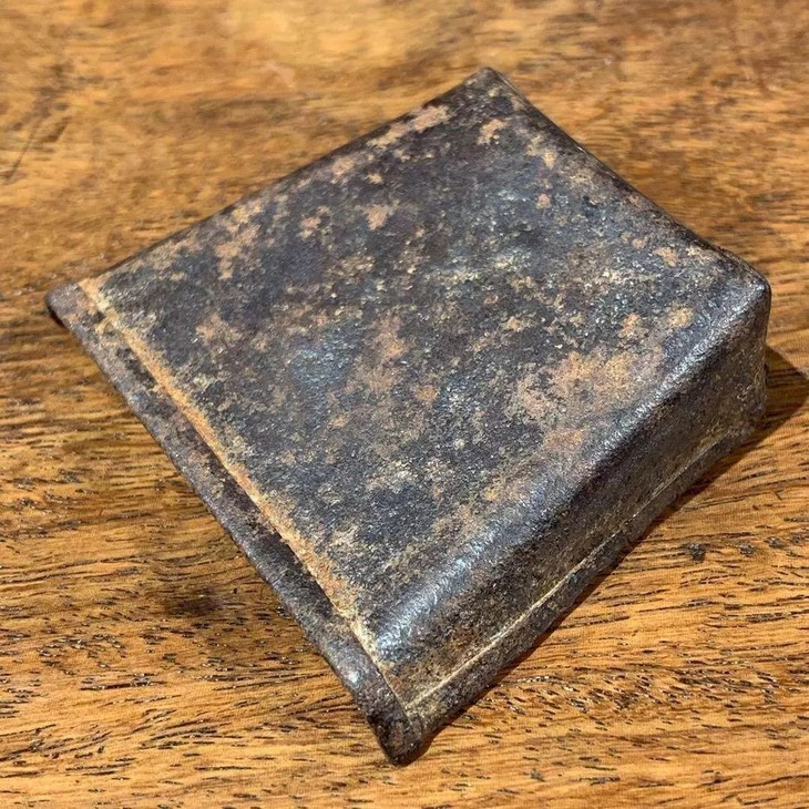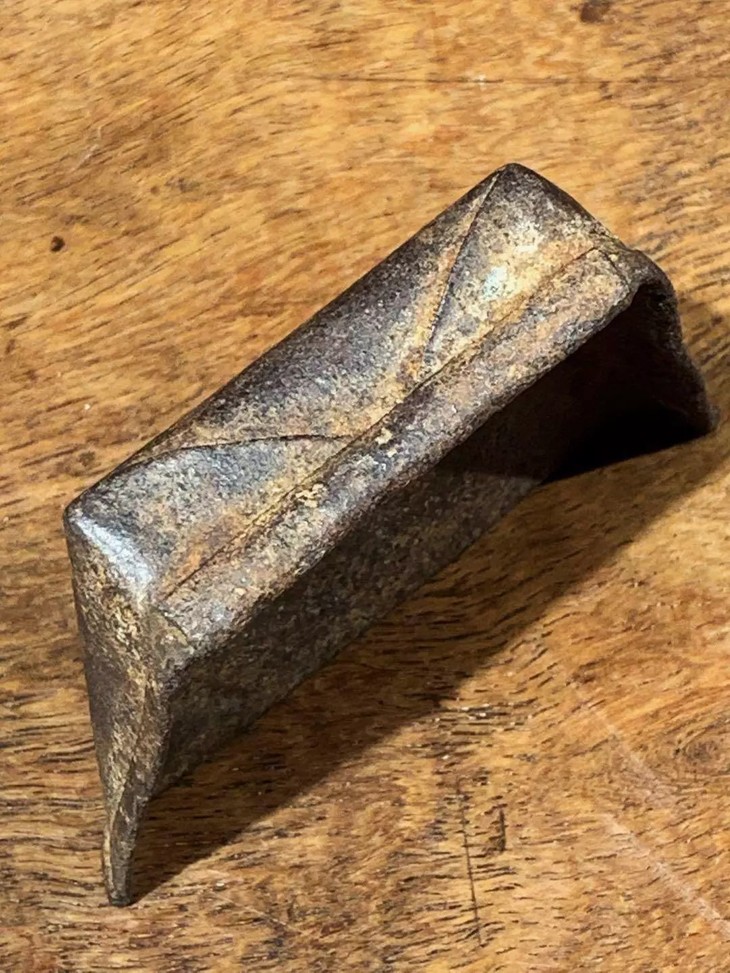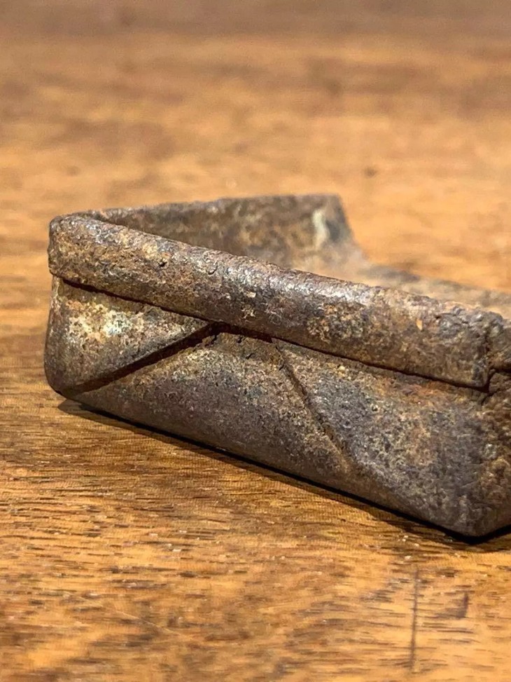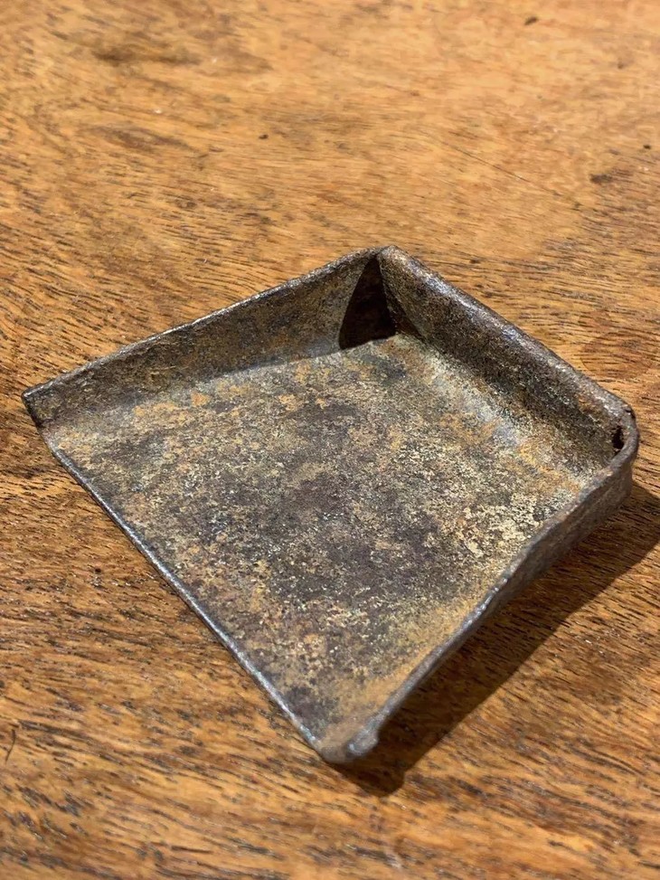 这是一件造型独特制作精美的小香铲,以薄铁片搥打并折叠成方型平底畚箕,形式简约无纹饰,器表与口沿呈现如折纸般的折叠痕是唯一的纹饰,器虽小却匠心独具,另人印象深刻,爱不释手。是文人书房里的小香具,朴实无华却魅力四射。