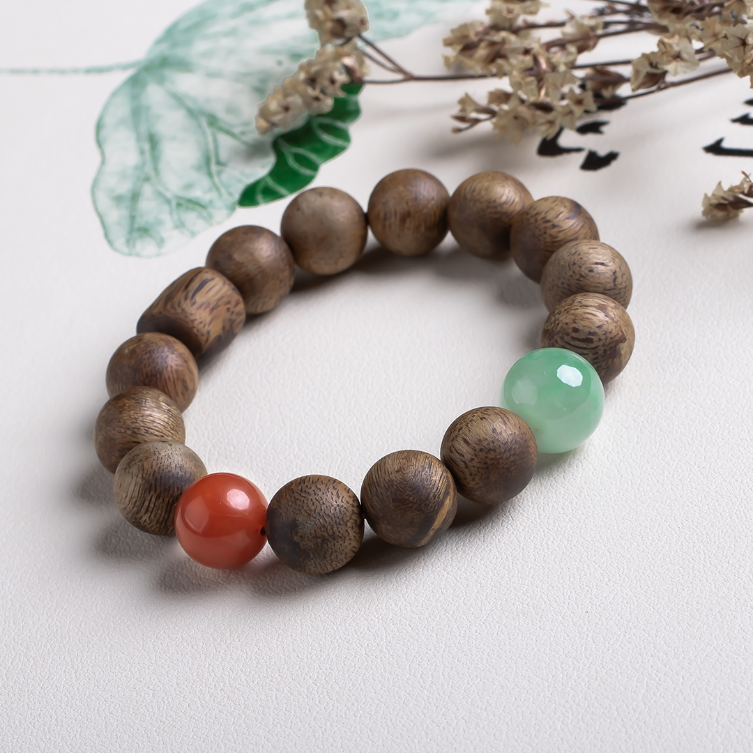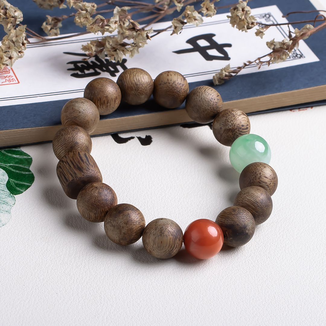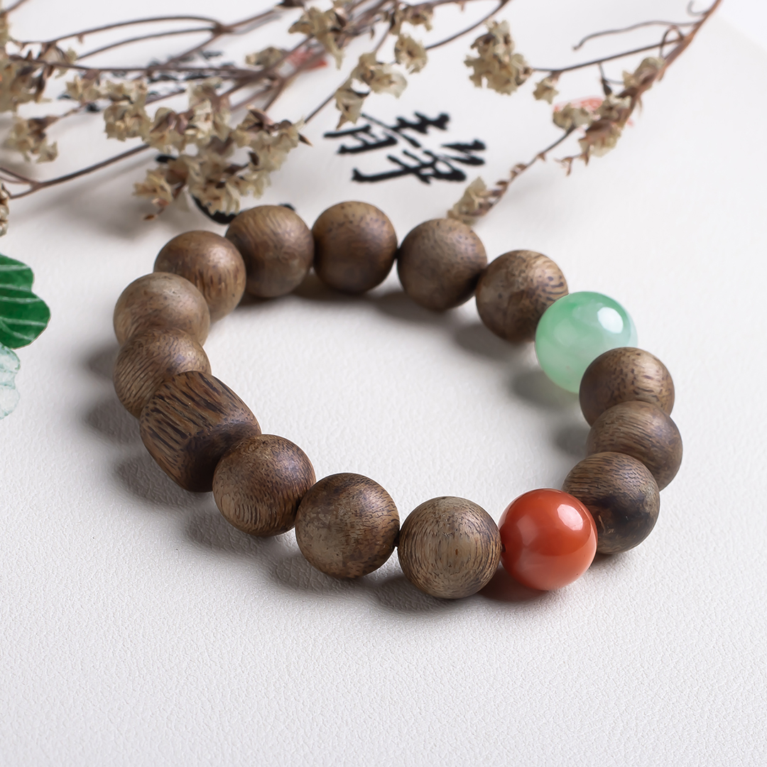 xy0542沉香+南红非洲翠手串,天然沉香约12.3mm,原色原味,香味自然清甜,满色肉的南红搭一颗冰飘花非洲翠大圆珠,款式大方百搭,上手大气。