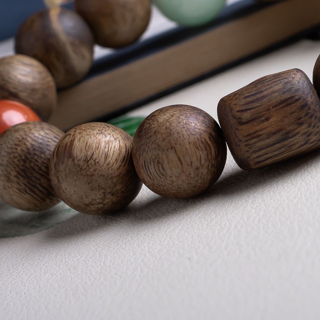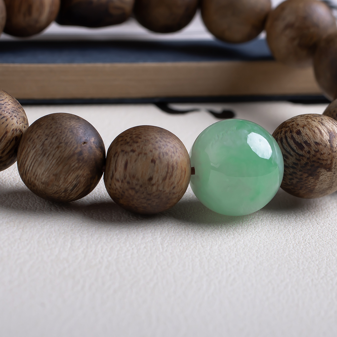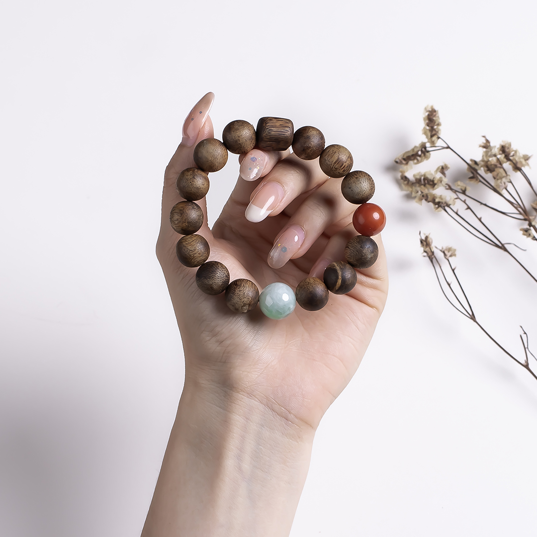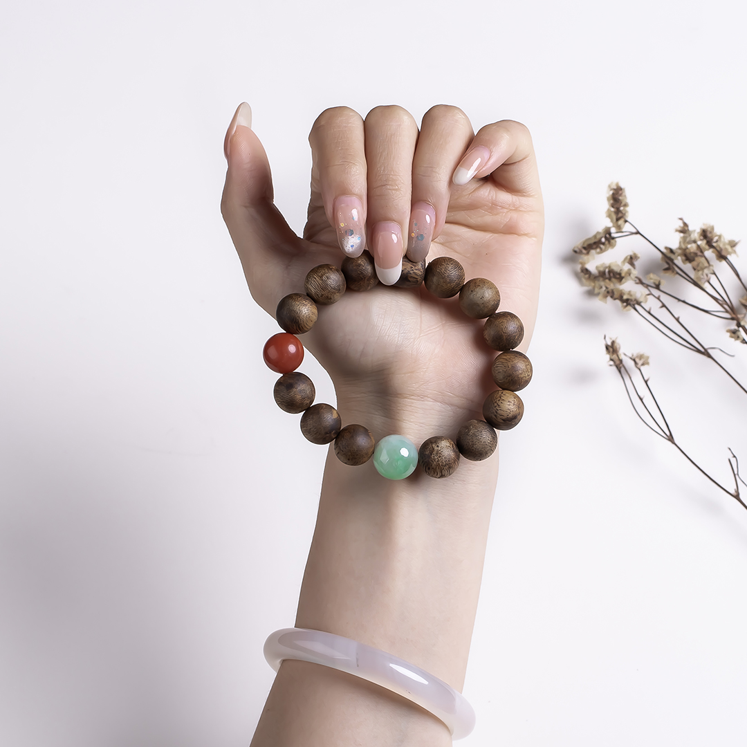 xy0542沉香+南红非洲翠手串,天然沉香约12.3mm,原色原味,香味自然清甜,满色肉的南红搭一颗冰飘花非洲翠大圆珠,款式大方百搭,上手大气。