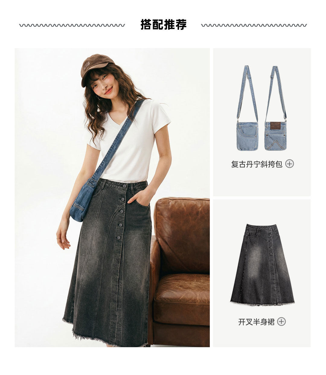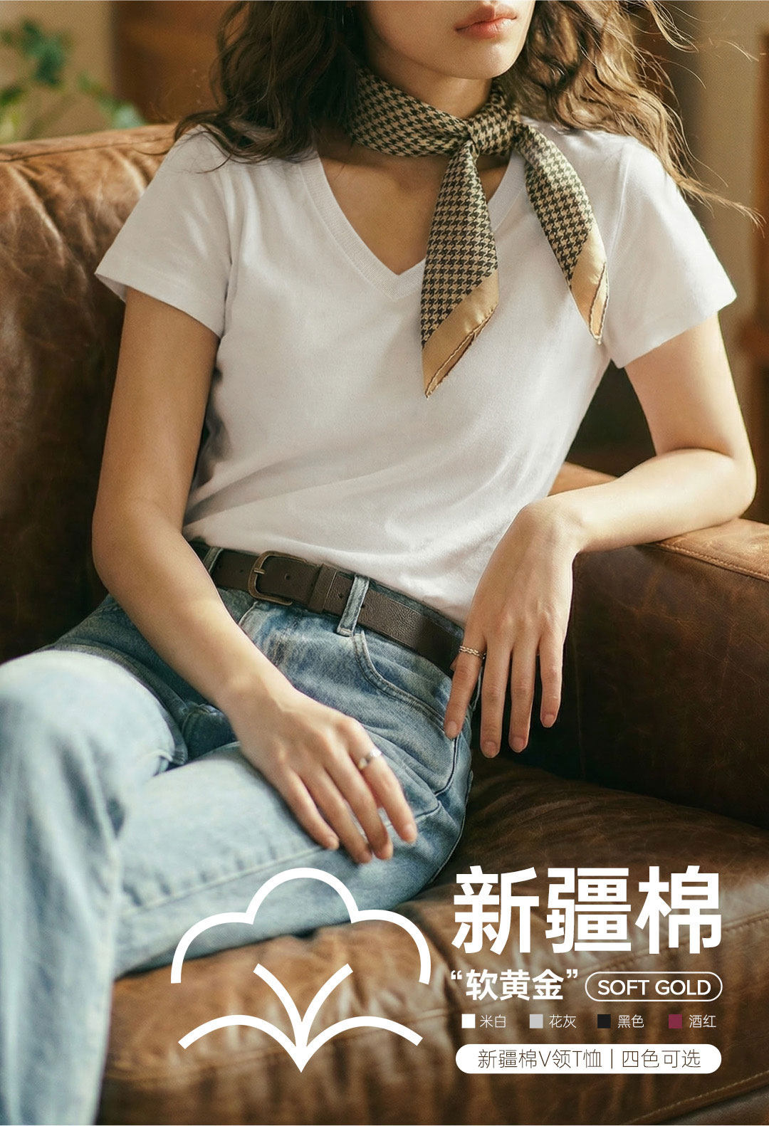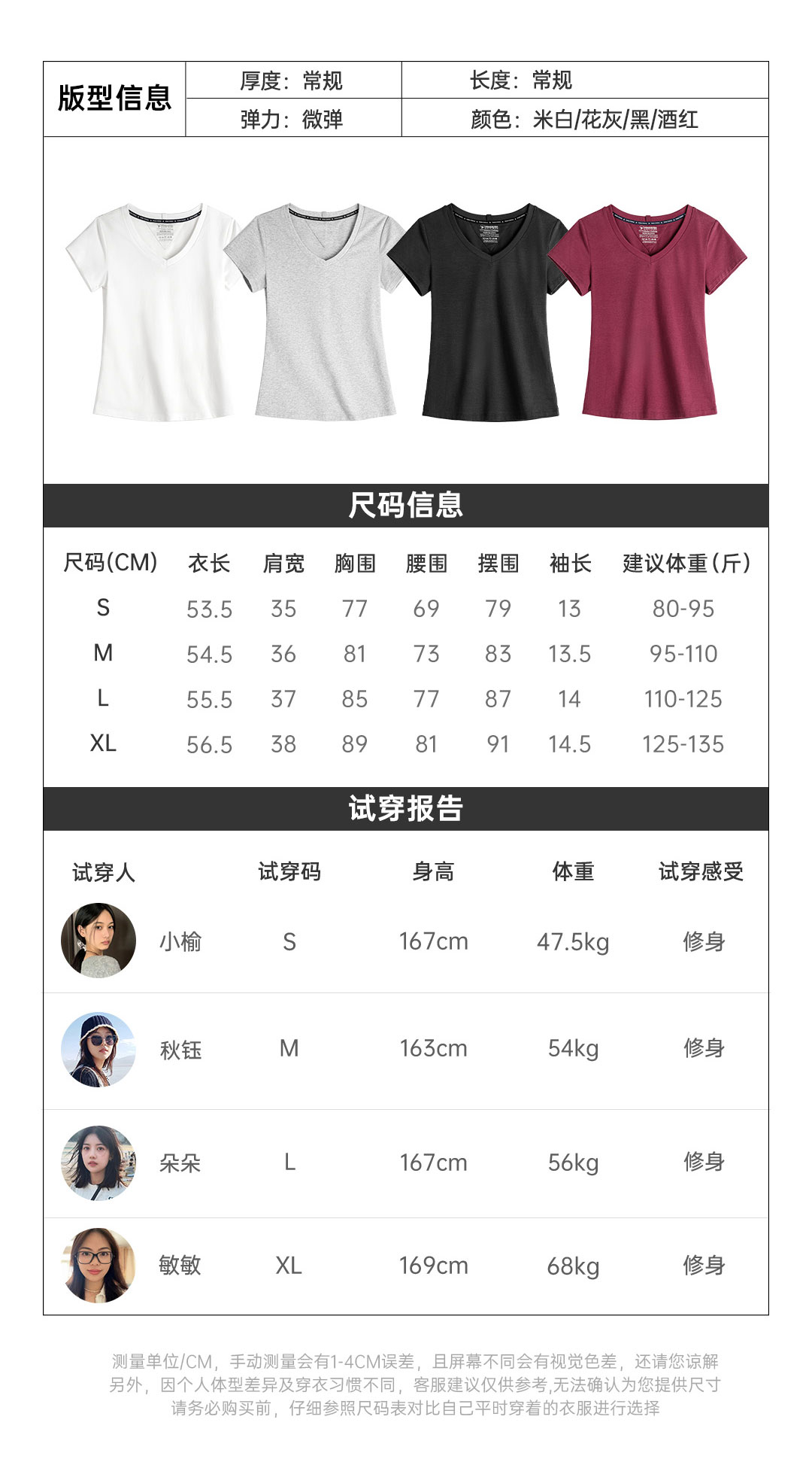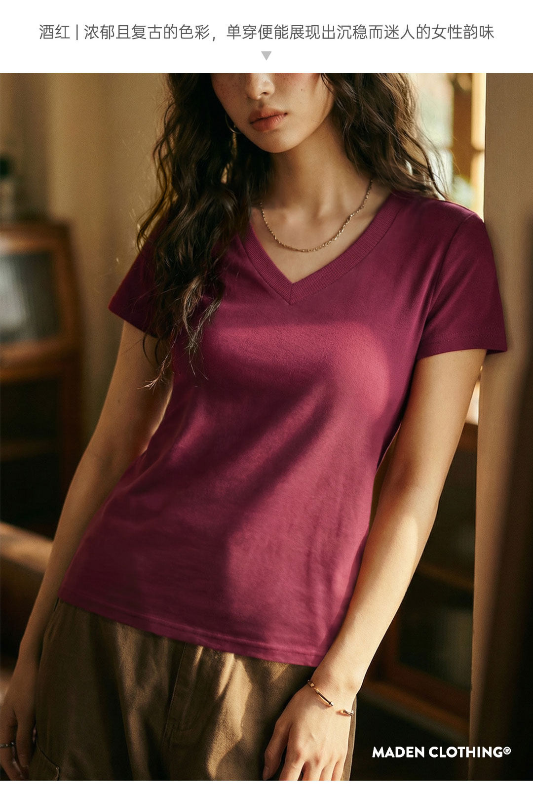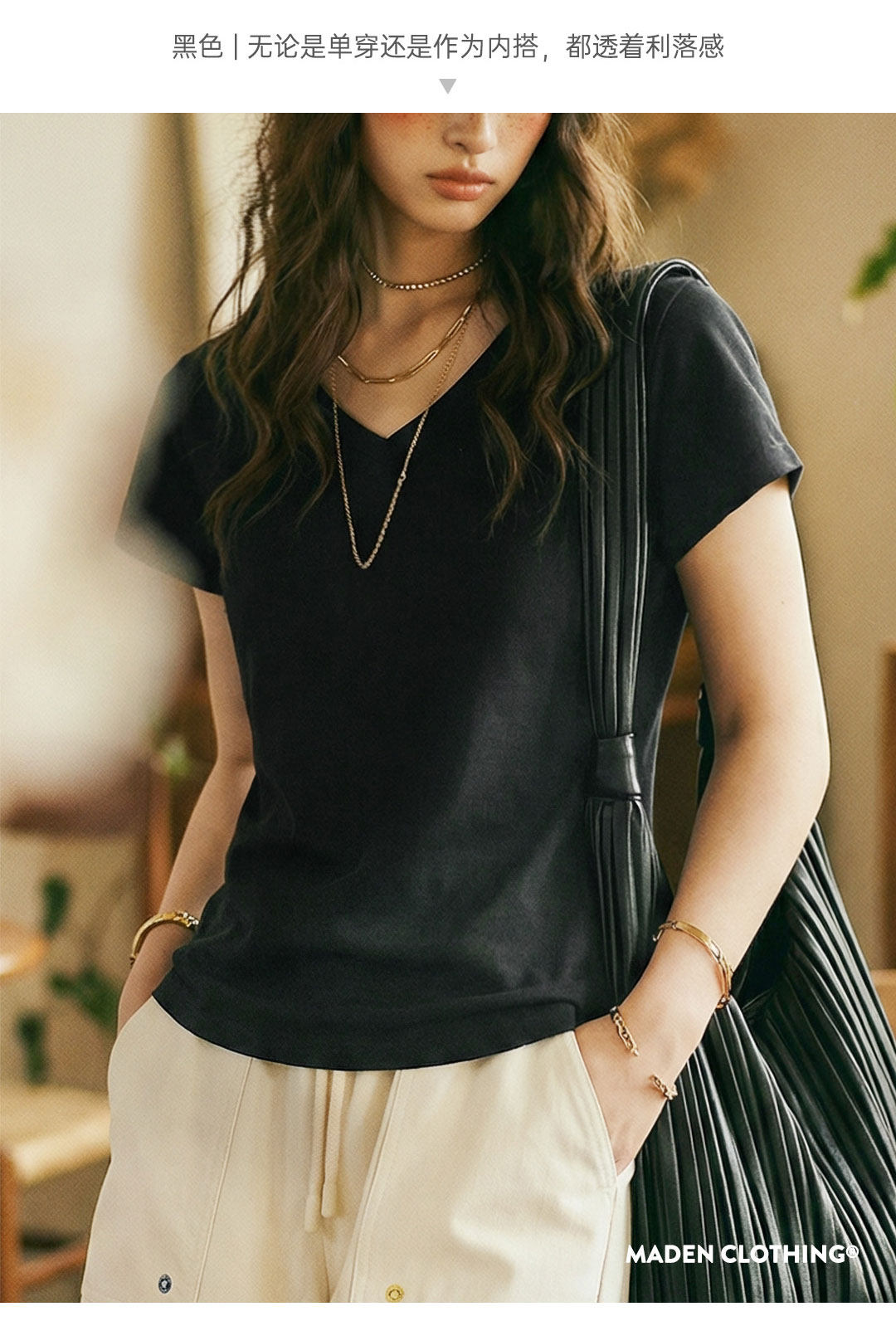 马登黑白灰纯色新疆棉V领正肩短袖T恤修身显瘦针织内搭天丝上衣女