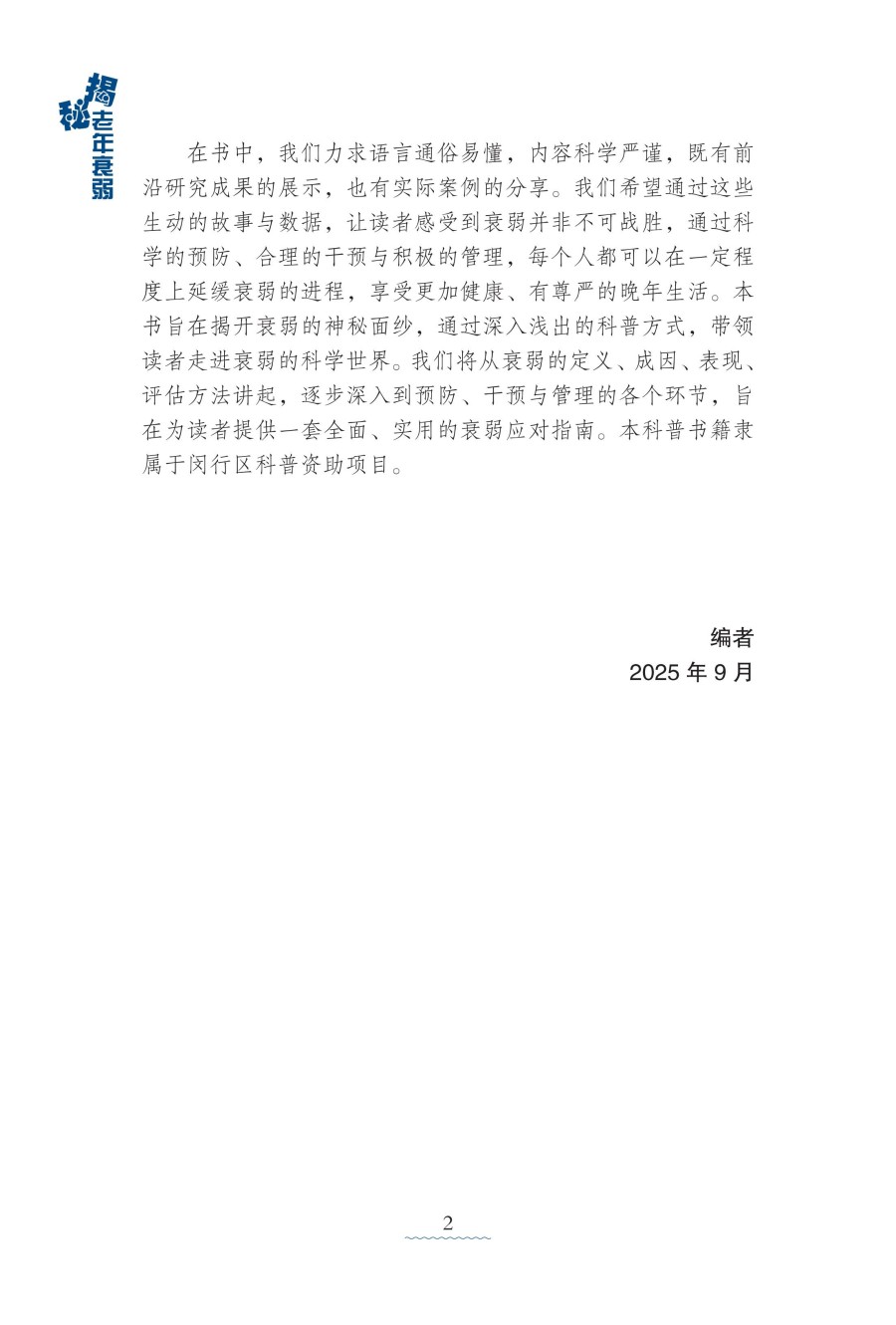 衰弱是一种多层面的老年综合征,涉及多系统病理和生理变化,包括神经肌肉、代谢内分泌、免疫系统等等,覆盖与身体表现、营养状况、心理健康和认知有关的缺陷,作为影响老年人生活质量的重要因素之一,其重要性日益凸显。本书通过生动的故事与数据,让读者感受到衰弱并非不可战胜,通过科学的预防、合理的干预与积极的管理,每个人都可以在一定程度上延缓衰弱的进程,享受更加健康、有尊严的晚年生活。本书旨在揭开衰弱的神秘面纱,通过深入浅出的科普方式,从衰弱的定义、成因、表现、评估方法讲起,逐步深入到预防、干预与管理的各个环节,旨在为读者提供一套全面、实用的衰弱应对指南,带领读者走进衰弱的科学世界。