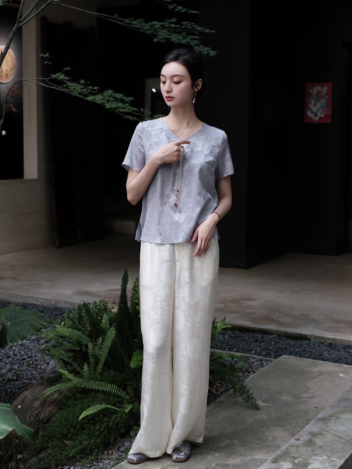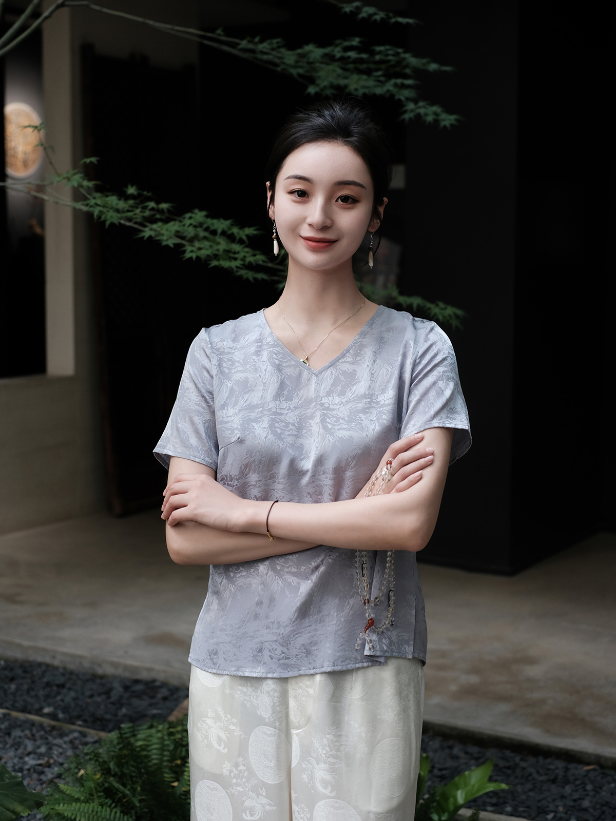 盛唐牡丹 |真丝压花圆领女上衣-黑色