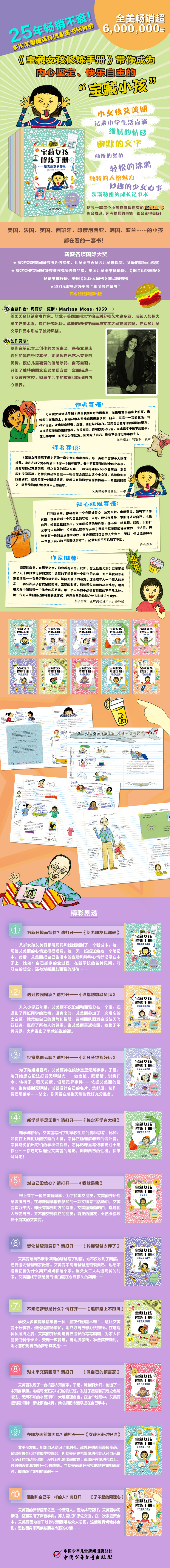 《宝藏女孩修炼手册》是美国小女孩艾美丽的记事本,记录了她从小学一直到初中毕业的生活点滴,凭借真挚的情感和独特的人格魅力赢得了无数小读者的青睐。全套图书分为10册。本册内容提要:艾美丽是一个八岁的小女孩,故事开始于她生活中的一个大变动:妈妈带着她和姐姐克莱奥搬到了一个新的城市,远离熟悉的老屋和学校,远离她最要好的朋友娜迪娅。这一切使艾美丽的心情变得很糟糕。这一天,妈妈送给她一个笔记本,并告诉她,如果把自己的想法记在笔记本上,她就会好受一些。此后,艾美丽真的开始把自己生活中的变动和种种心情记录在笔记本上。在这本书里,艾美丽记录了自己搬家的详细过程,自己在新学校的各种见闻,对好友娜迪娅的想念以及对和丽雅成为新朋友的期待。