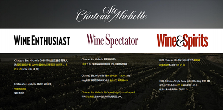 ○ 24次上榜 Wine and Spirits “年度酒庄”(Winery of the Year),2022年评为“葡萄酒百强酒庄第24名,旗下 Eroica Single Berry Select Riesling 拿下WE100满分;