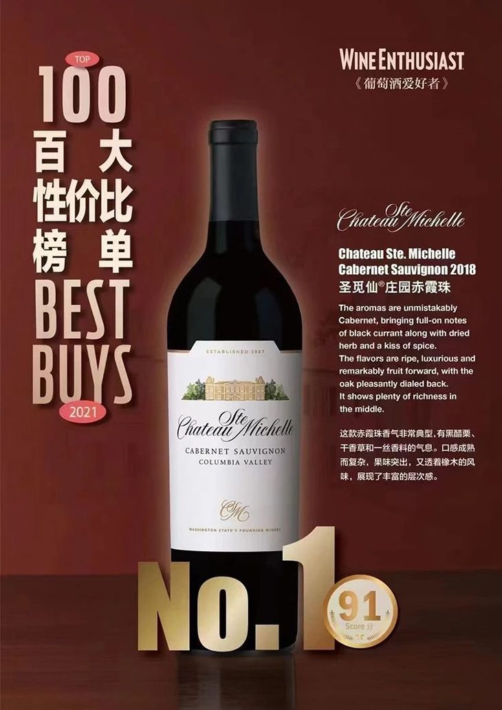 ○ 哥伦比亚赤霞珠入选Wine Enthusiast 百大蕞佳购买葡萄酒榜单第壹名(2018年份)。