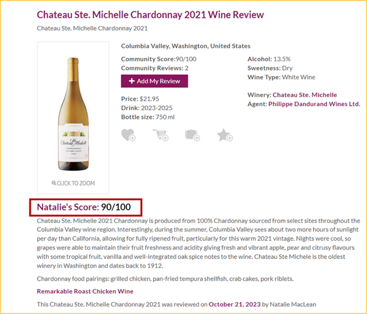 WE蕞佳必买!美国晚宴同款!圣觅仙庄园霞多丽白葡萄酒 Chateau Ste. Michelle Chardonnay 2021