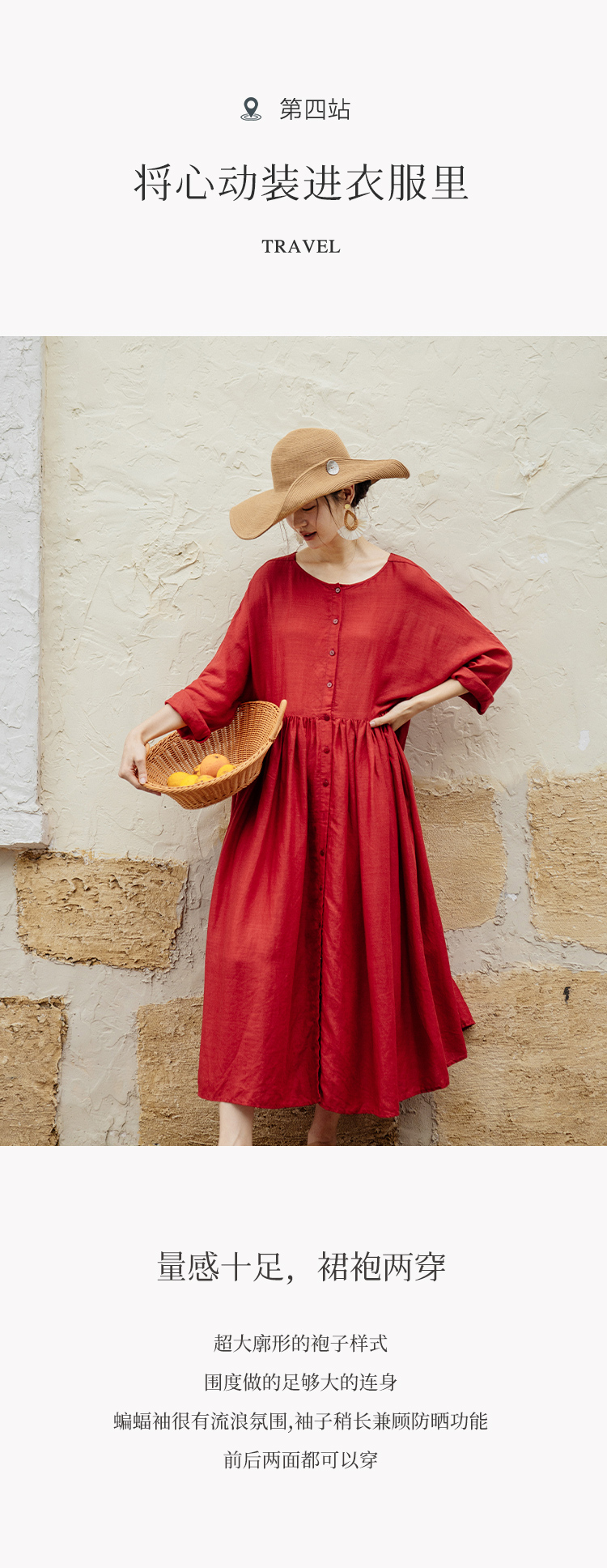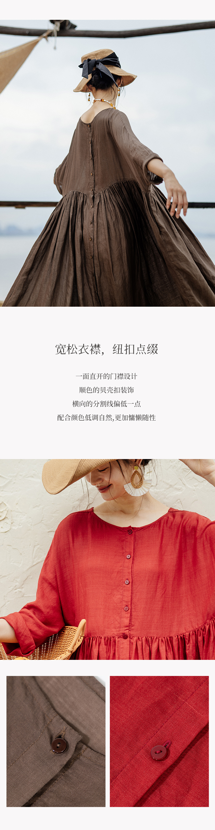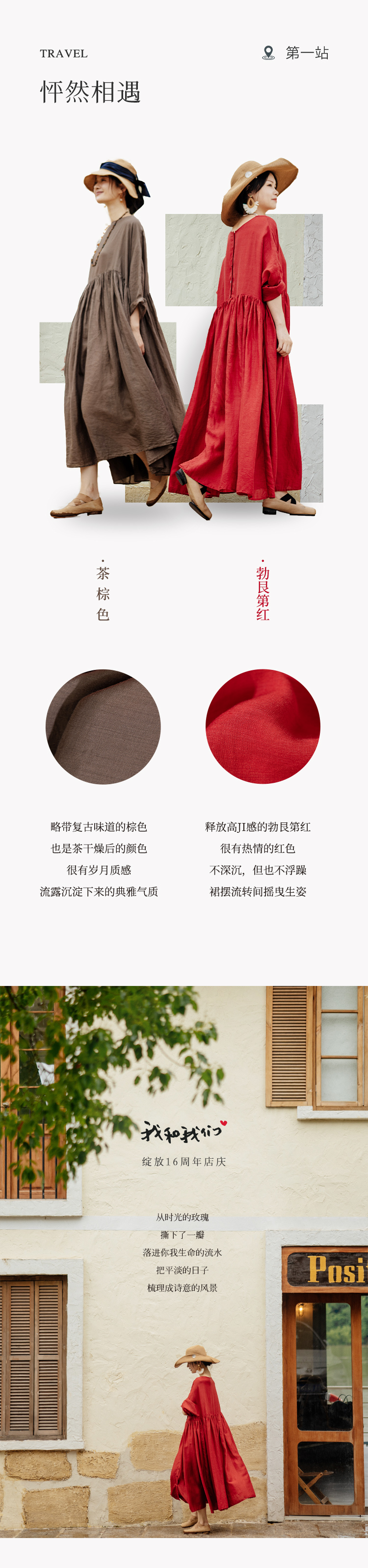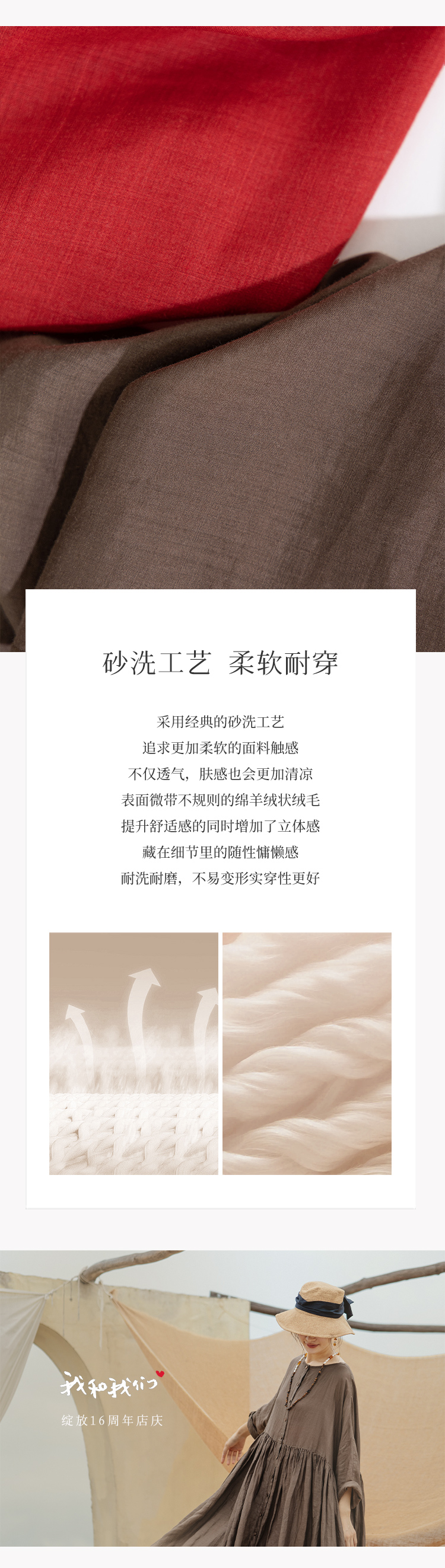 绽放旅行女装411朵/高支砂洗苎麻清凉透气宽松文艺圆领短袖连衣裙