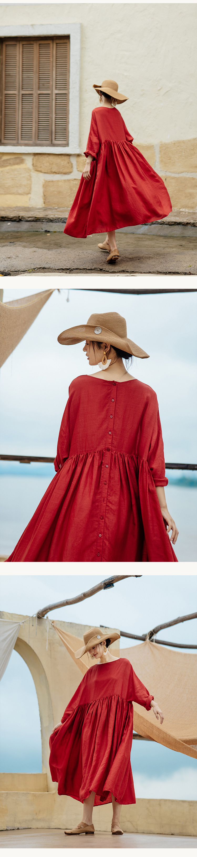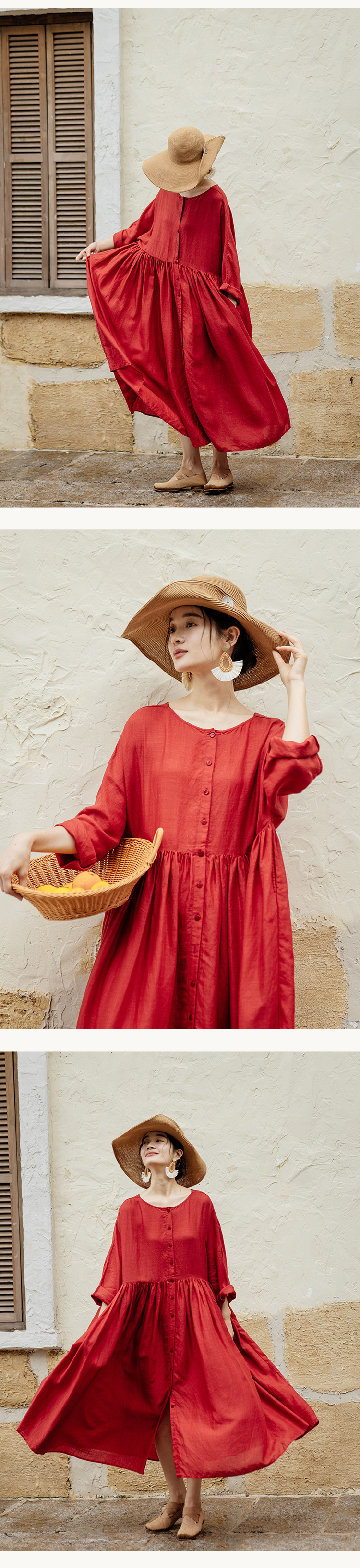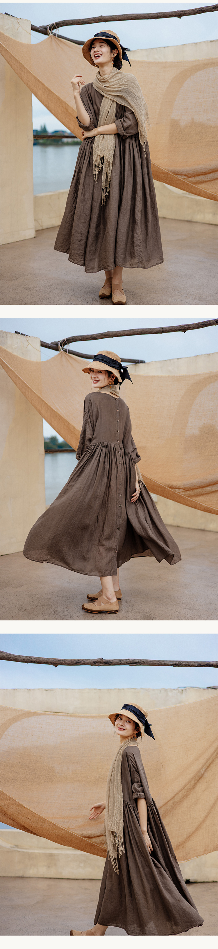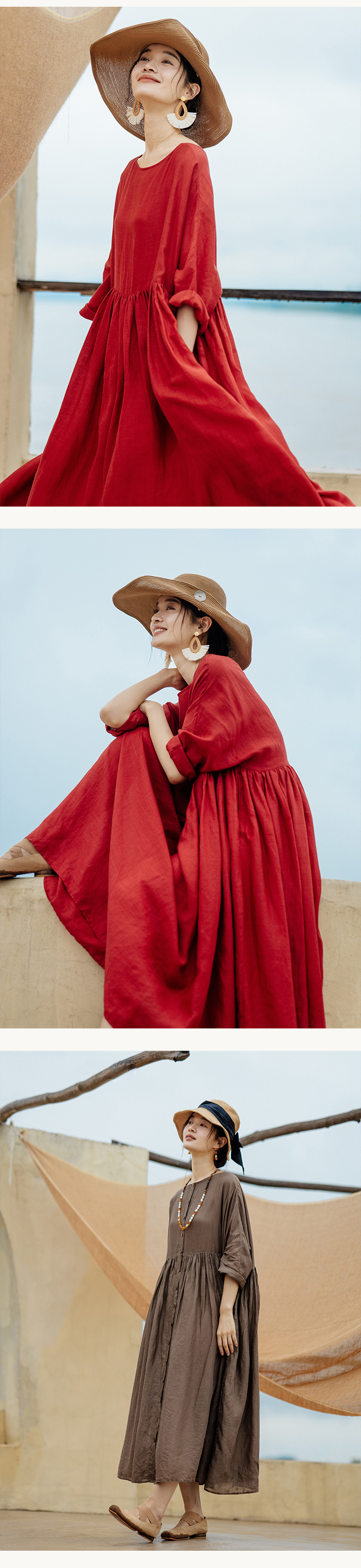 绽放旅行女装411朵/高支砂洗苎麻清凉透气宽松文艺圆领短袖连衣裙