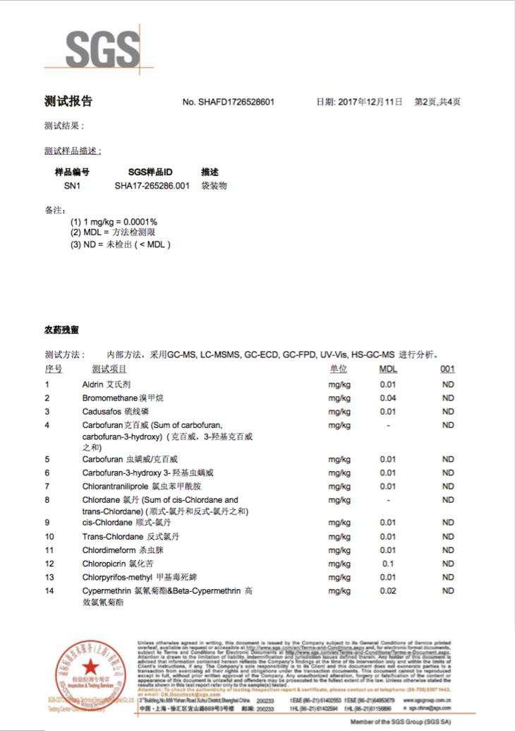 虽然全过程实行“三无标准”:无农药、无化肥、无除草剂。但每年秋收之后,他们还是会把小米送到瑞士SGS检测中心——这是目前行业内被认为最严苛的检测标准。连续几年,致良田的小米都被检测为零农残(报告中的 ND 表示未检出)。