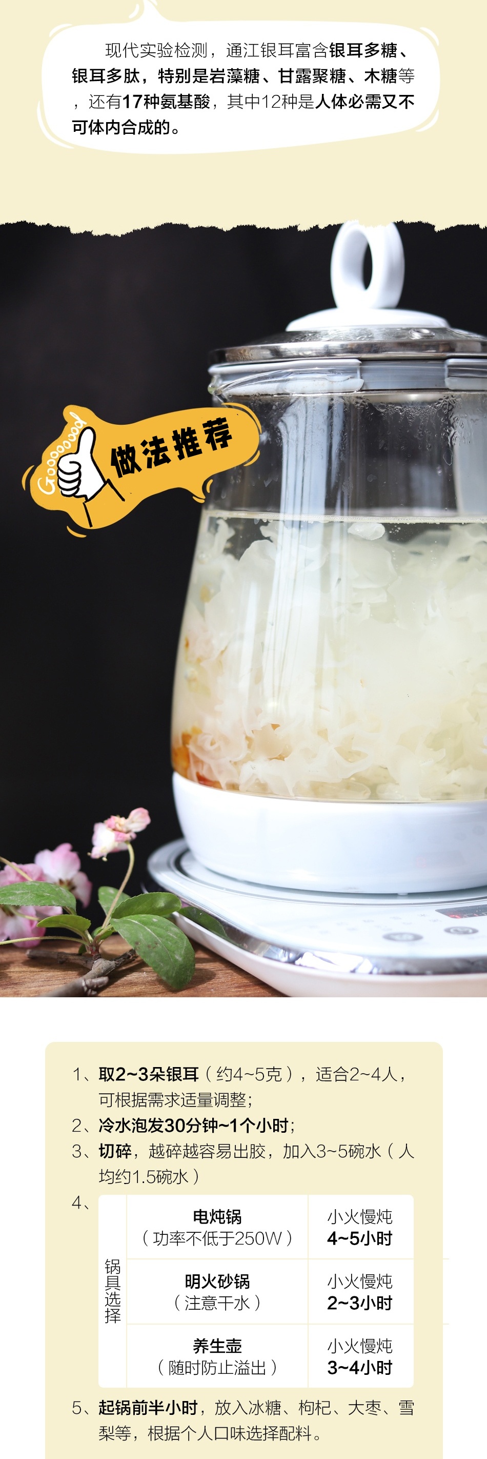 2.段木种植,生长期长,炖煮出胶要比菌包银耳慢很多,尽量炖煮4小时以上;