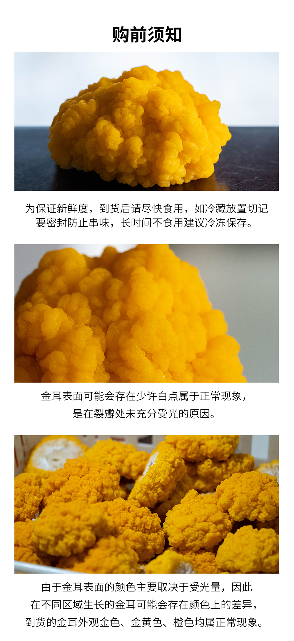 4、由于金耳表面的颜色主要取决于受光量,因此在不同区域生长的金耳可能会存在颜色上的差异,到货的金耳外观金色、金黄色、橙色均属正常现象。