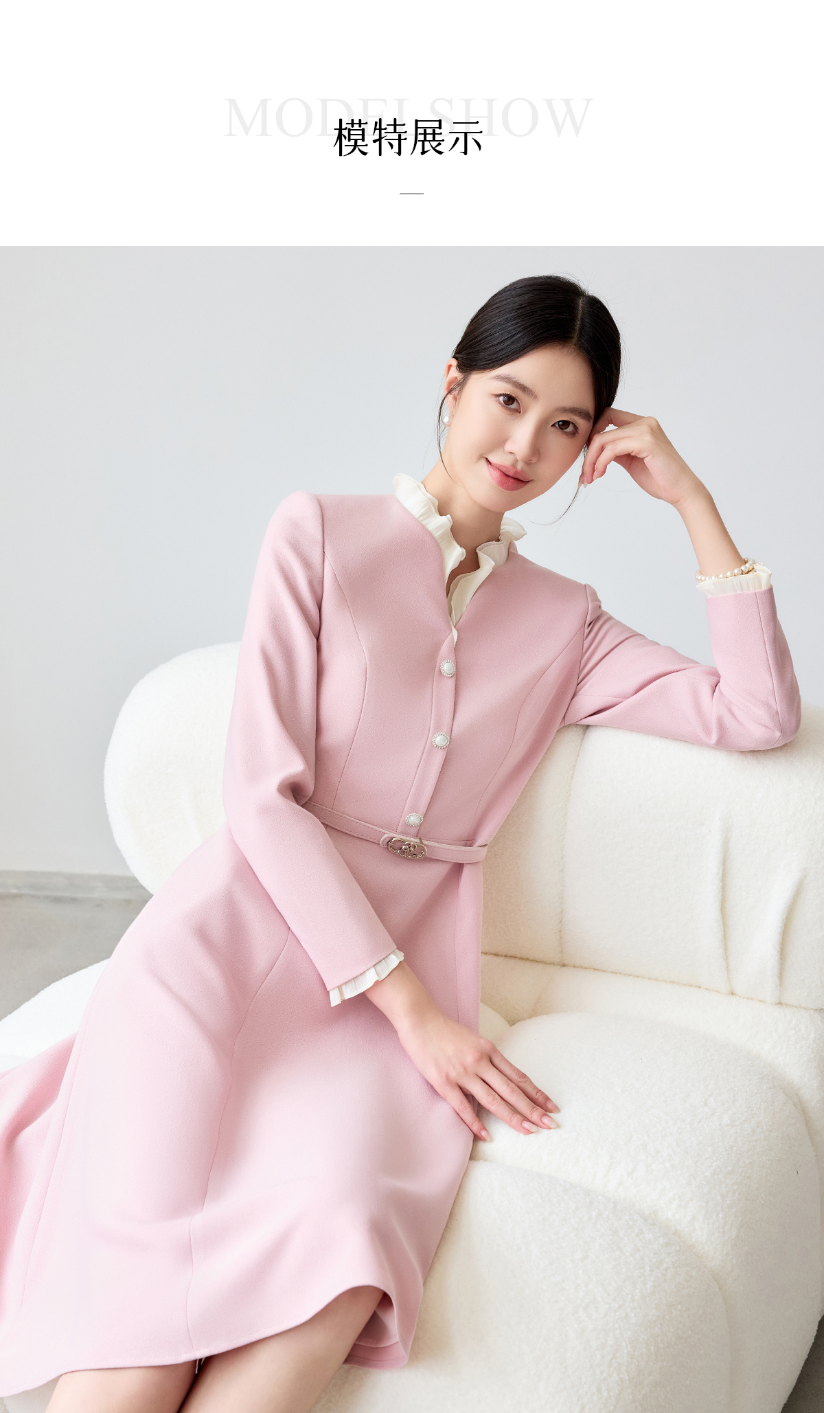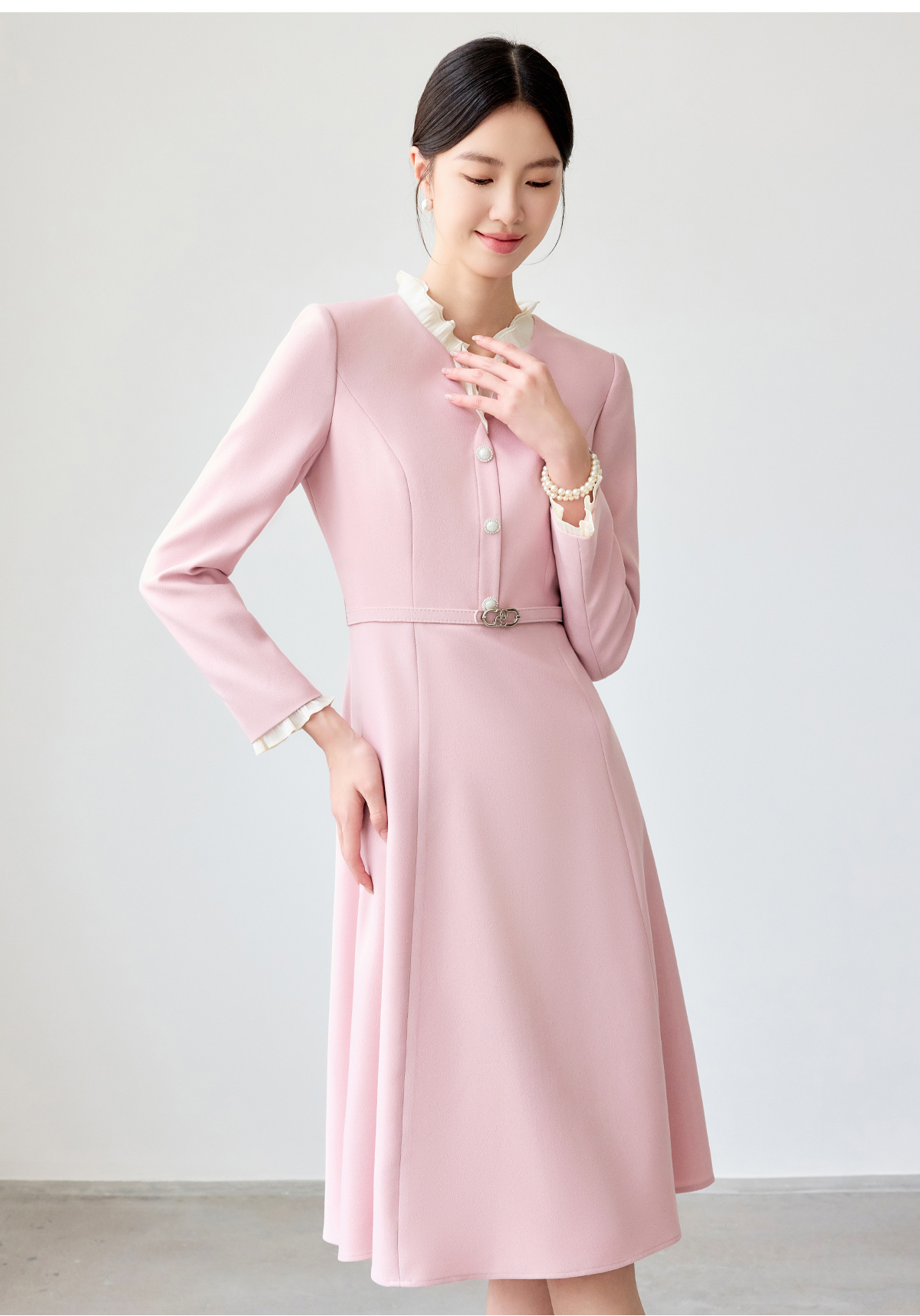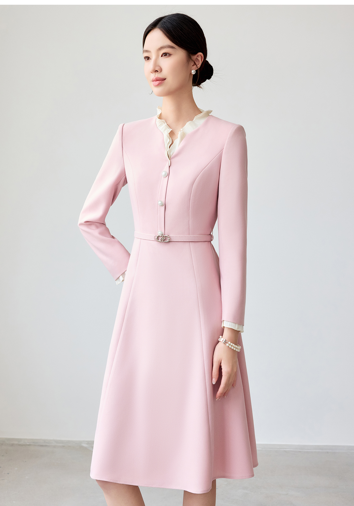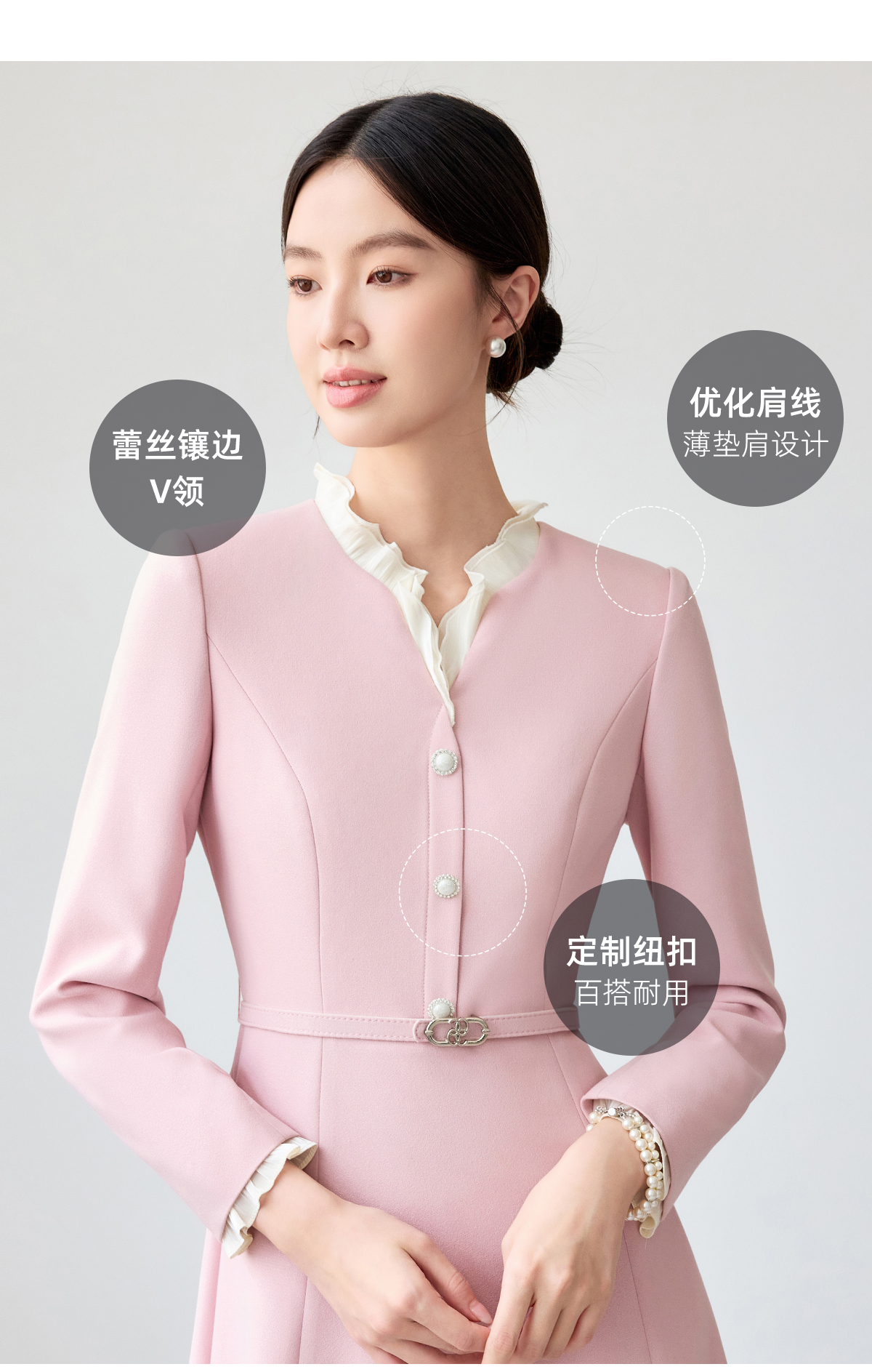 艾尚臣粉色连衣裙女花边领气质女神范2025新款气质中长职业装裙子