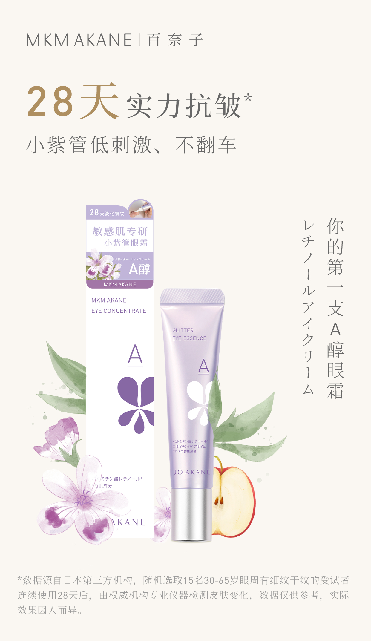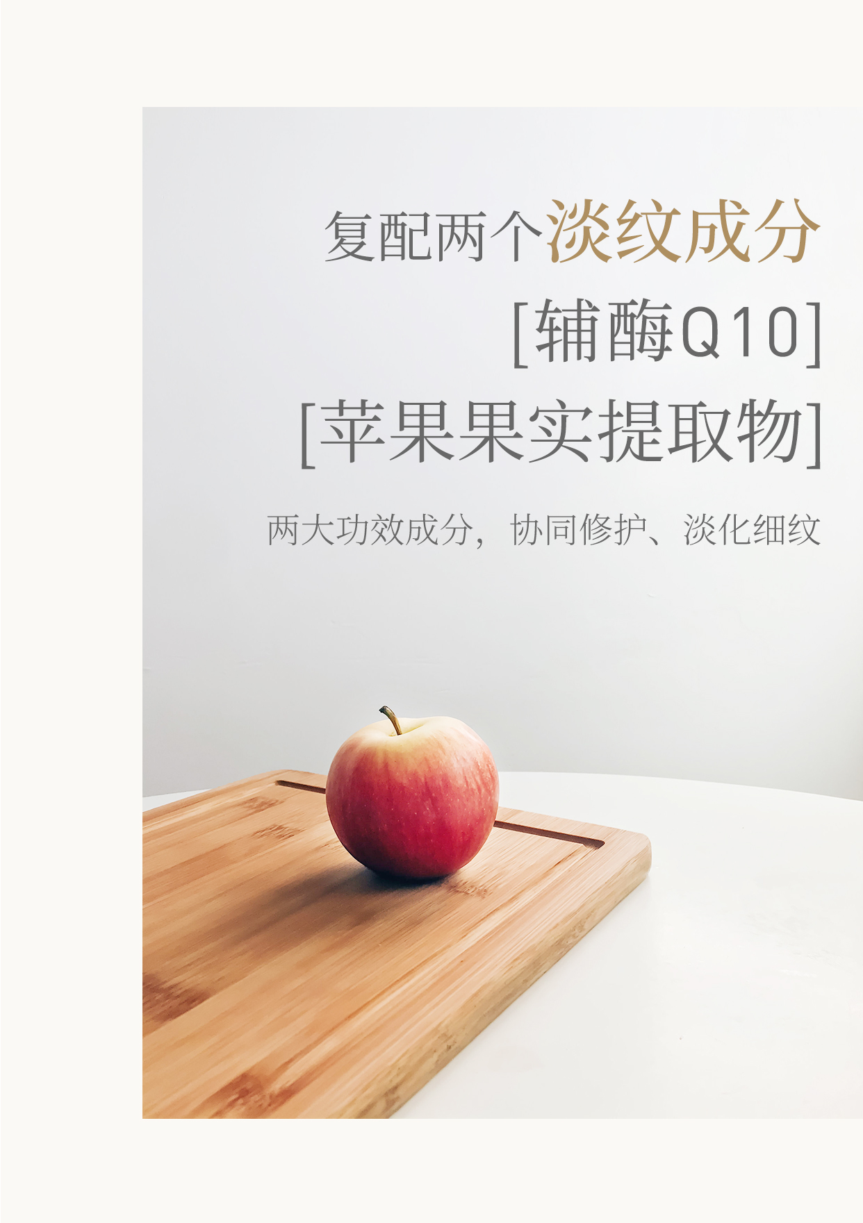 添加了三重抗氧化成分:0.25%(达到有效且不致敏的浓度最高值)缓释视黄醇+辅酶Q10+苹果干细胞。"
