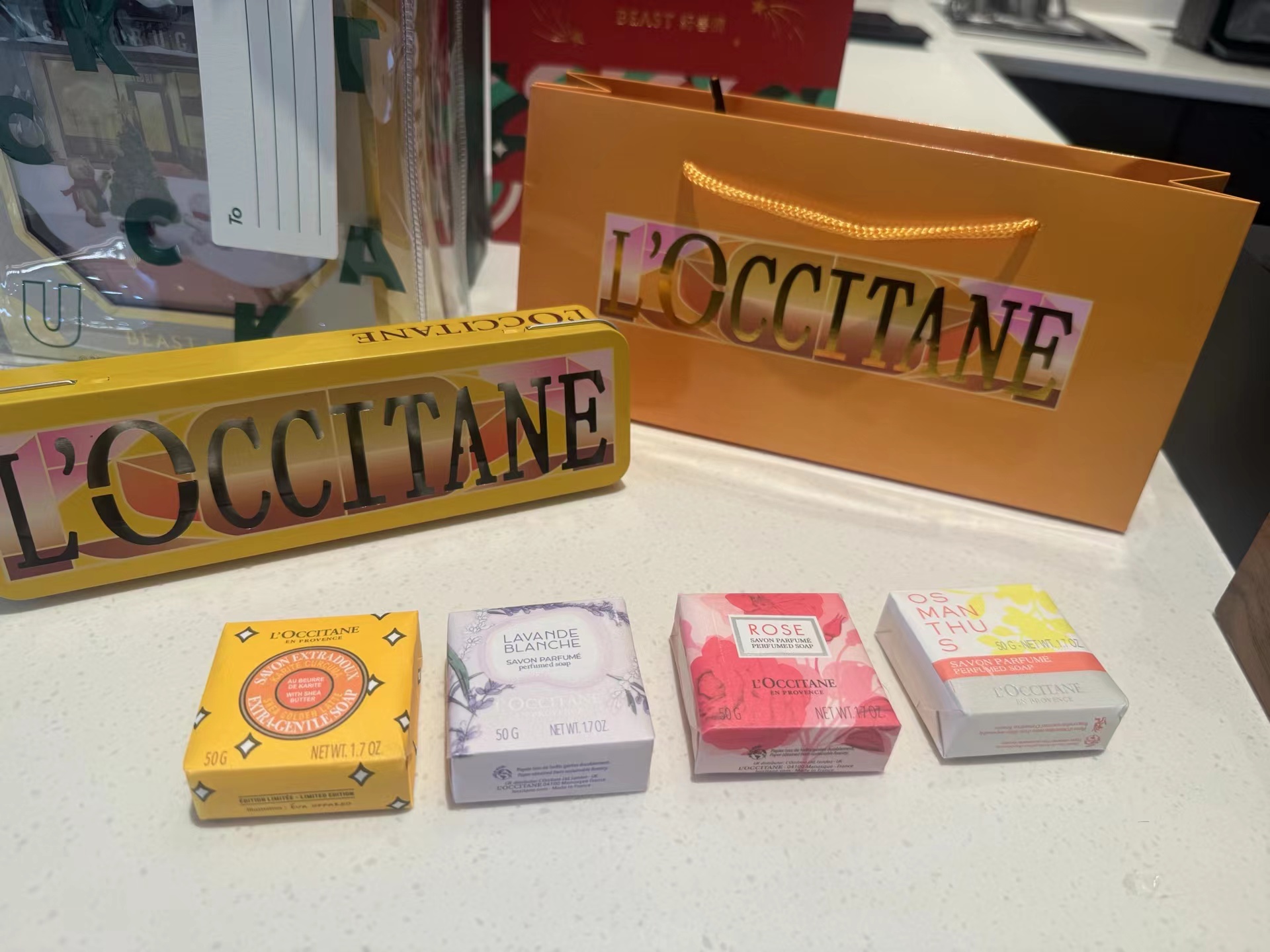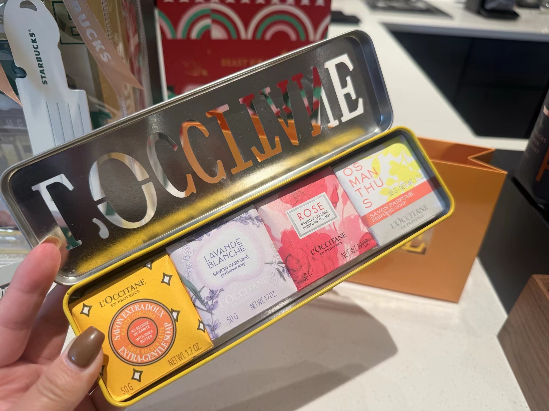 香漫星彩沐浴香皂四件套铁盒!内含:50g*4。味道:绵绵拿铁、薰衣草、玫瑰之心、云中月桂。